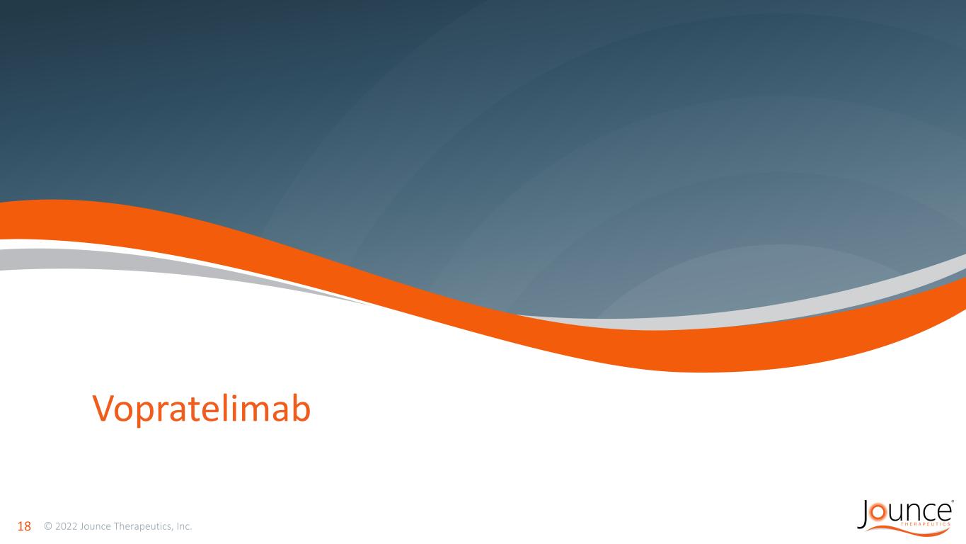 JTX-8064: Anticipated INNATE Study Data in 2022 Mono and Pimivalimab Combo Dose Escalation and Expansion 17 Preliminary Clinical Data by Year End At least 80 Phase 2 patients Complete mono and combo dose escalation data Preliminary mono and combo expansion cohort data Data from stage 1 of Simon’s 2 stage design from most cohorts Additional combo patients from Simon’s 2nd stage Preliminary biomarker data Pharmacodynamic Predictive 7 Indication Specific Phase 2 Combo Expansion Cohorts Ovarian Cancer Monotherapy Expansion Cohort Mono Dose Escalation Completed (n=22) Combo Dose Escalation Completed (n=9)