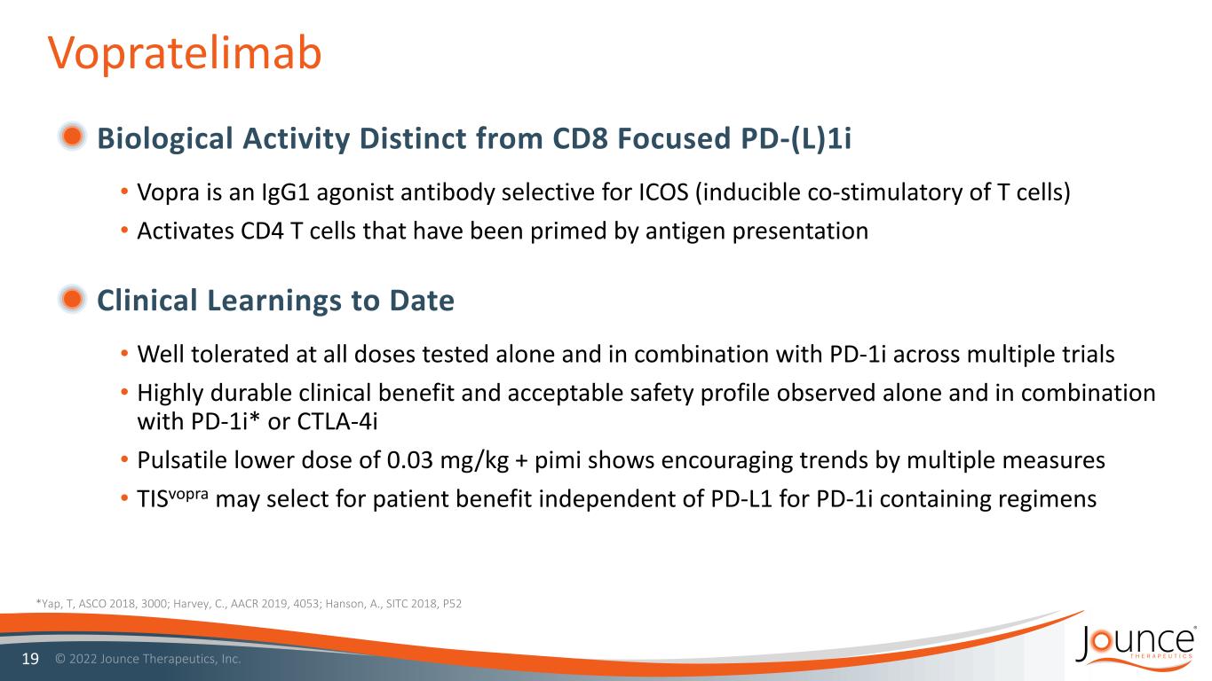 Vopratelimab is a clinical-stage monoclonal antibody that binds to and activates ICOS, the Inducible T cell CO-Stimulator, a protein on the surface of certain T cells commonly found in many solid tumors. Vopratelimab is being assessed in the SELECT Phase 2 clinical trial (NCT04549025) in combination with Jounce’s internal investigational PD-1 inhibitor, pimivalimab (formerly JTX-4014), compared to pimivalimab alone. The SELECT trial completed enrollment of 69 immunotherapy naïve NSCLC patients who have been pre-selected with the TISvopra predictive biomarker, an 18 gene RNA tumor inflammation signature which predicted the emergence of ICOS hi CD4 T cells and clinical benefit in the ICONIC trial of vopratelimab alone
