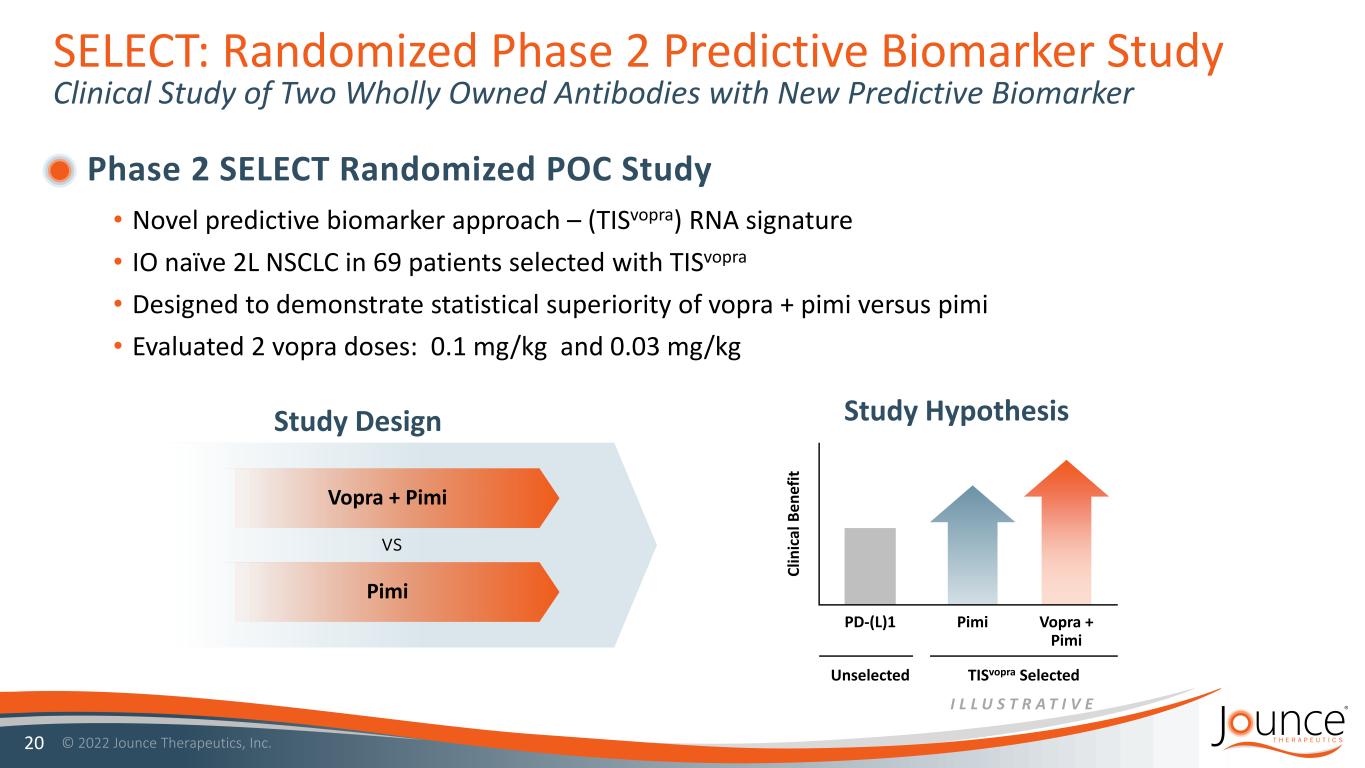 CAMBRIDGE, Mass., August 30, 2022 - Jounce Therapeutics, Inc. (NASDAQ: JNCE), a clinical-stage company focused on the discovery and development of novel cancer immunotherapies and predictive biomarkers, today reported top line data from the randomized Phase 2 SELECT trial evaluating vopratelimab (vopra), Jounce’s inducible costimulator (ICOS) agonist, in combination with pimivalimab (pimi) versus pimivalimab alone in immunotherapy naïve, TISvopra biomarker-selected, second line non-small cell lung cancer (NSCLC) patients. The trial tested two pulsatile and differentiated doses of vopra in the combination groups against pimi monotherapy, using as the primary endpoint the mean percent change from baseline in tumor size in all measurable lesions, averaged over 9 and 18 weeks as assessed by central independent radiology review. As the study was powered to detect a 20% absolute difference of the pooled combo doses compared to pimi monotherapy, and the actual difference was 7%, SELECT did not meet its primary endpoint. In the combination dose cohort with the lowest dose of vopra (0.03mg/kg), interesting trends were observed in both the primary endpoint, with an absolute mean change of 15%, and in the prespecified secondary endpoints of overall response rate (ORR), which was 40% compared to 25% in pimi alone, and landmark six month progression free survival (PFS) of 80% compared to 33% with pimi alone. Consistent with these clinical outcomes, recent mechanistic data in primary human immune cells in vitro supports shorter duration pulsatile dosing of ICOS agonism, with general implications for T cell agonist dosing. Data from SELECT is summarized as follows: