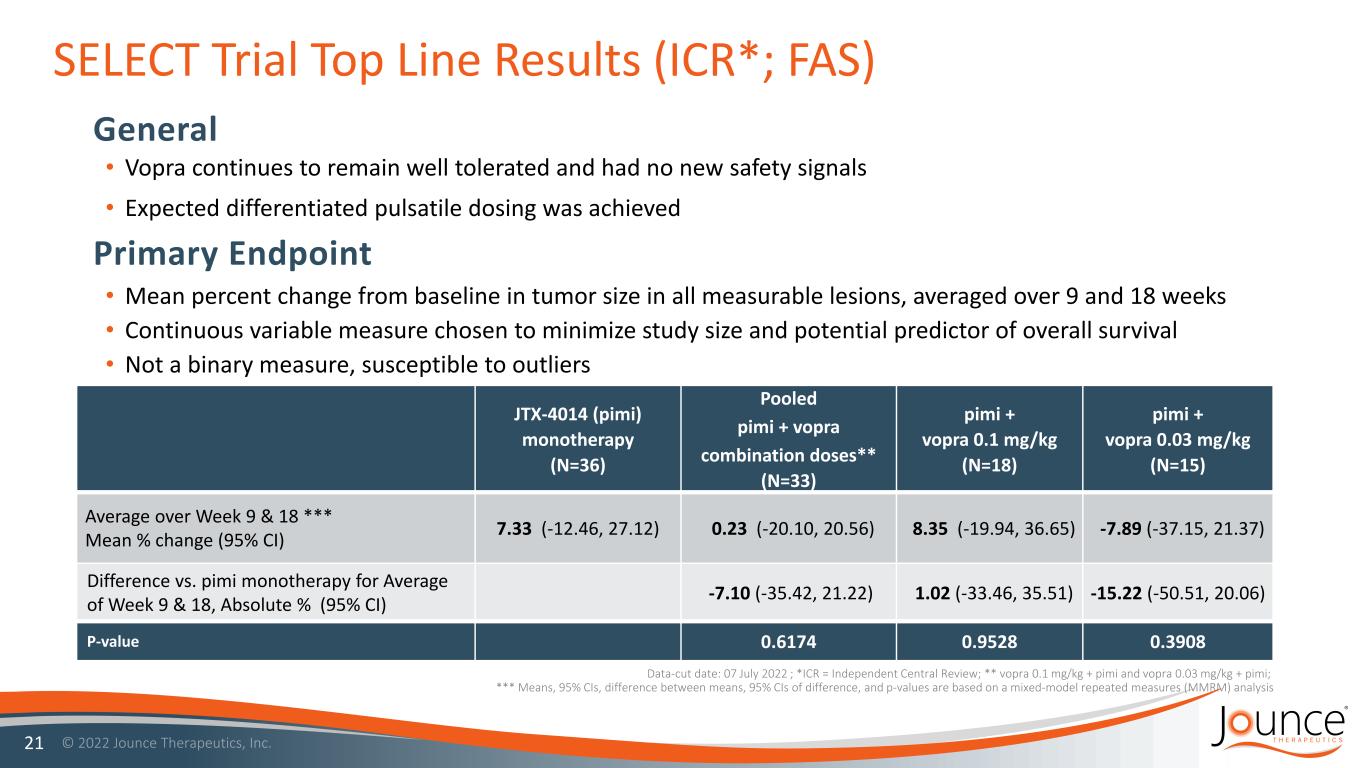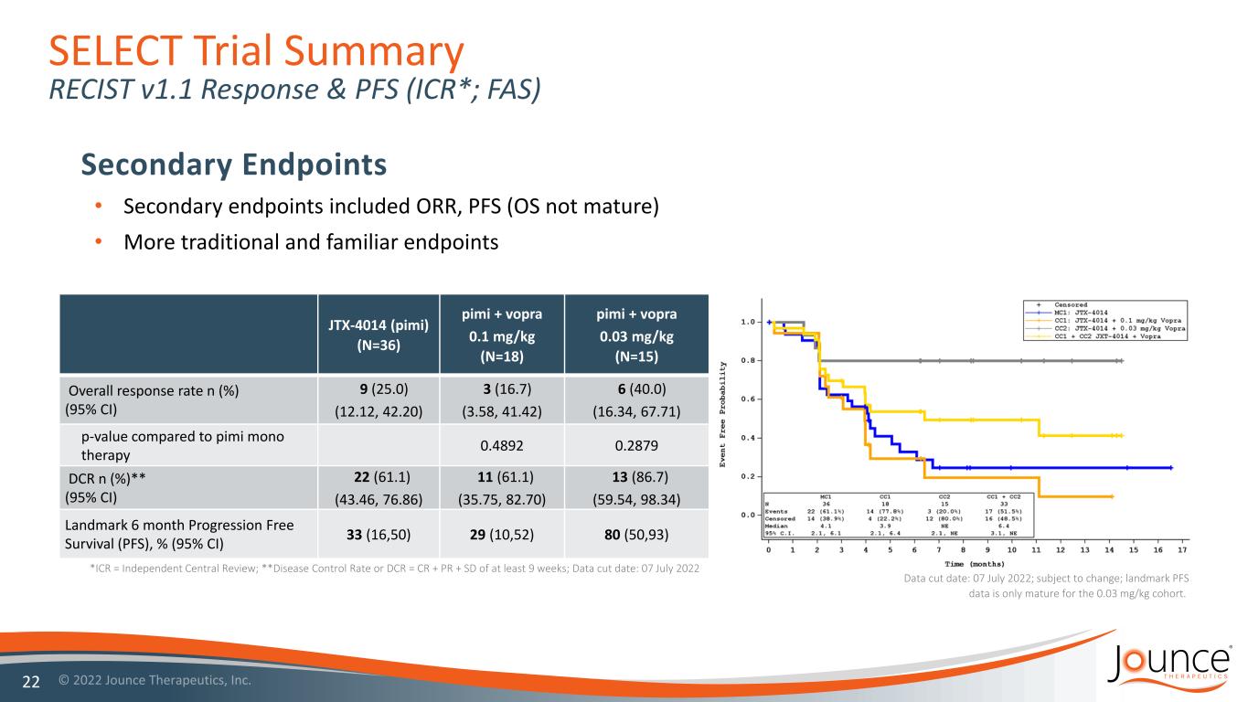 SELECT Trial Top Line Results (ICR*; FAS) • Vopra continues to remain well tolerated and had no new safety signals • Expected differentiated pulsatile dosing was achieved 21 • Mean percent change from baseline in tumor size in all measurable lesions, averaged over 9 and 18 weeks • Continuous variable measure chosen to minimize study size and potential predictor of overall survival • Not a binary measure, susceptible to outliers General Primary Endpoint JTX-4014 (pimi) monotherapy (N=36) Pooled pimi + vopra combination doses** (N=33) pimi + vopra 0.1 mg/kg (N=18) pimi + vopra 0.03 mg/kg (N=15) Average over Week 9 & 18 *** Mean % change (95% CI) 7.33 (-12.46, 27.12) 0.23 (-20.10, 20.56) 8.35 (-19.94, 36.65) -7.89 (-37.15, 21.37) Difference vs. pimi monotherapy for Average of Week 9 & 18, Absolute % (95% CI) -7.10 (-35.42, 21.22) 1.02 (-33.46, 35.51) -15.22 (-50.51, 20.06) P-value 0.6174 0.9528 0.3908 Data-cut date: 07 July 2022 ; *ICR = Independent Central Review; ** vopra 0.1 mg/kg + pimi and vopra 0.03 mg/kg + pimi; *** Means, 95% CIs, difference between means, 95% CIs of difference, and p-values are based on a mixed-model repeated measures (MMRM) analysis