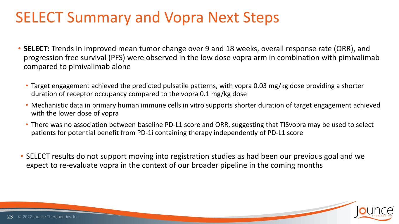 22 *ICR = Independent Central Review; **Disease Control Rate or DCR = CR + PR + SD of at least 9 weeks; Data cut date: 07 July 2022 JTX-4014 (pimi) (N=36) pimi + vopra 0.1 mg/kg (N=18) pimi + vopra 0.03 mg/kg (N=15) Overall response rate n (%) (95% CI) 9 (25.0) (12.12, 42.20) 3 (16.7) (3.58, 41.42) 6 (40.0) (16.34, 67.71) p-value compared to pimi mono therapy 0.4892 0.2879 DCR n (%)** (95% CI) 22 (61.1) (43.46, 76.86) 11 (61.1) (35.75, 82.70) 13 (86.7) (59.54, 98.34) Landmark 6 month Progression Free Survival (PFS), % (95% CI) 33 (16,50) 29 (10,52) 80 (50,93) Secondary Endpoints • Secondary endpoints included ORR, PFS (OS not mature) • More traditional and familiar endpoints SELECT Trial Summary RECIST v1.1 Response & PFS (ICR*; FAS) Data cut date: 07 July 2022; subject to change; landmark PFS data is only mature for the 0.03 mg/kg cohort.