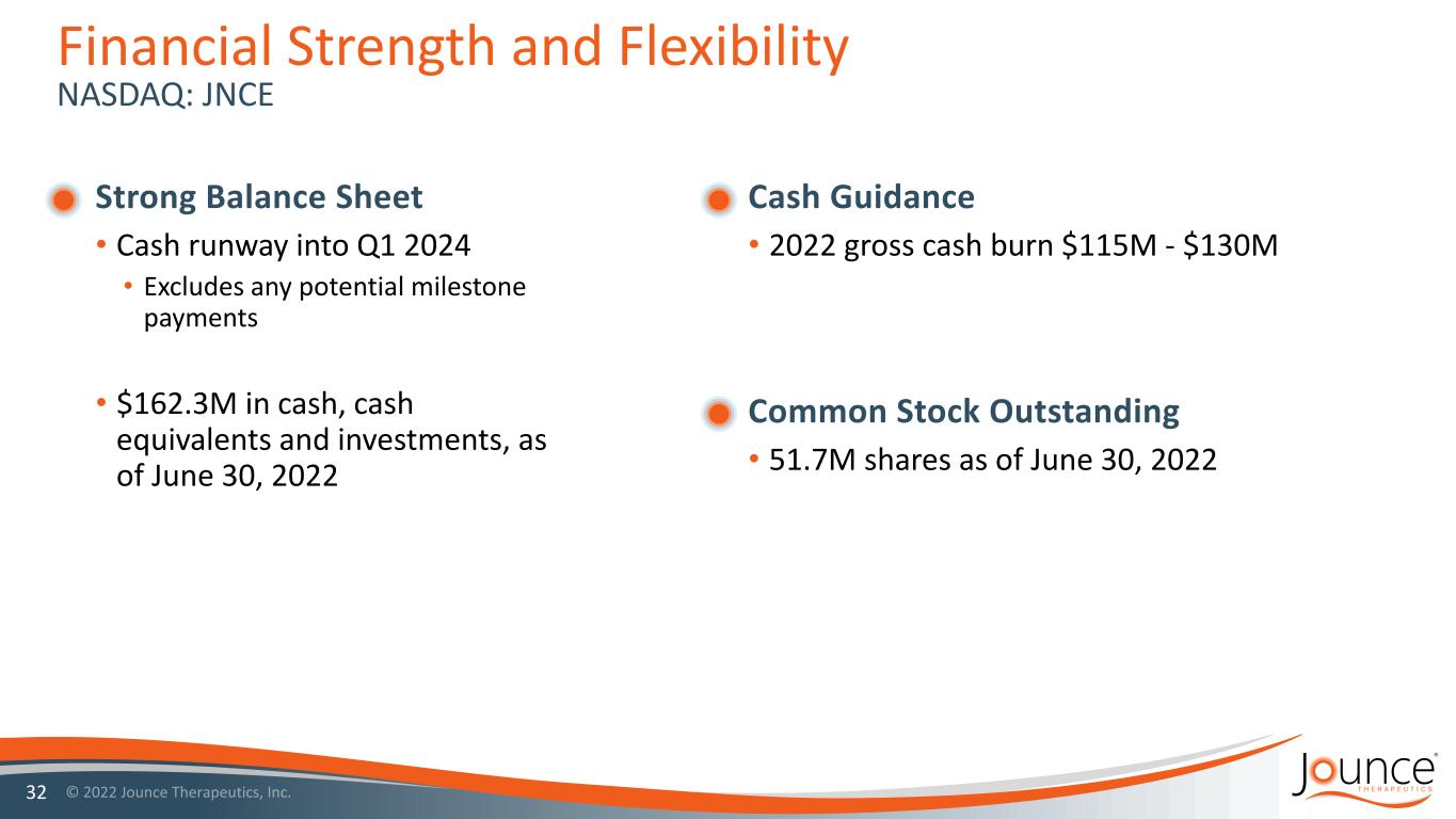Vopratelimab (SELECT): Top-line results reported • Plan to submit full data clinical abstract to ESMO-IO in December 2022 • Safety and preliminary efficacy data • Performance of biomarker JTX-1484 (LILRB4): • Continue to advance towards a 2023 IND Discovery: • Continue to advance multiple new targets through discovery pipeline with a goal of an IND every 12-18 months Upcoming Milestones JTX-8064 (INNATE): • Clinical data by year end: • All mono and combo dose escalation • > 80 Phase 2 patients • Multiple expansion cohorts • Preliminary biomarker data • Pharmacodynamic • Predictive 31
