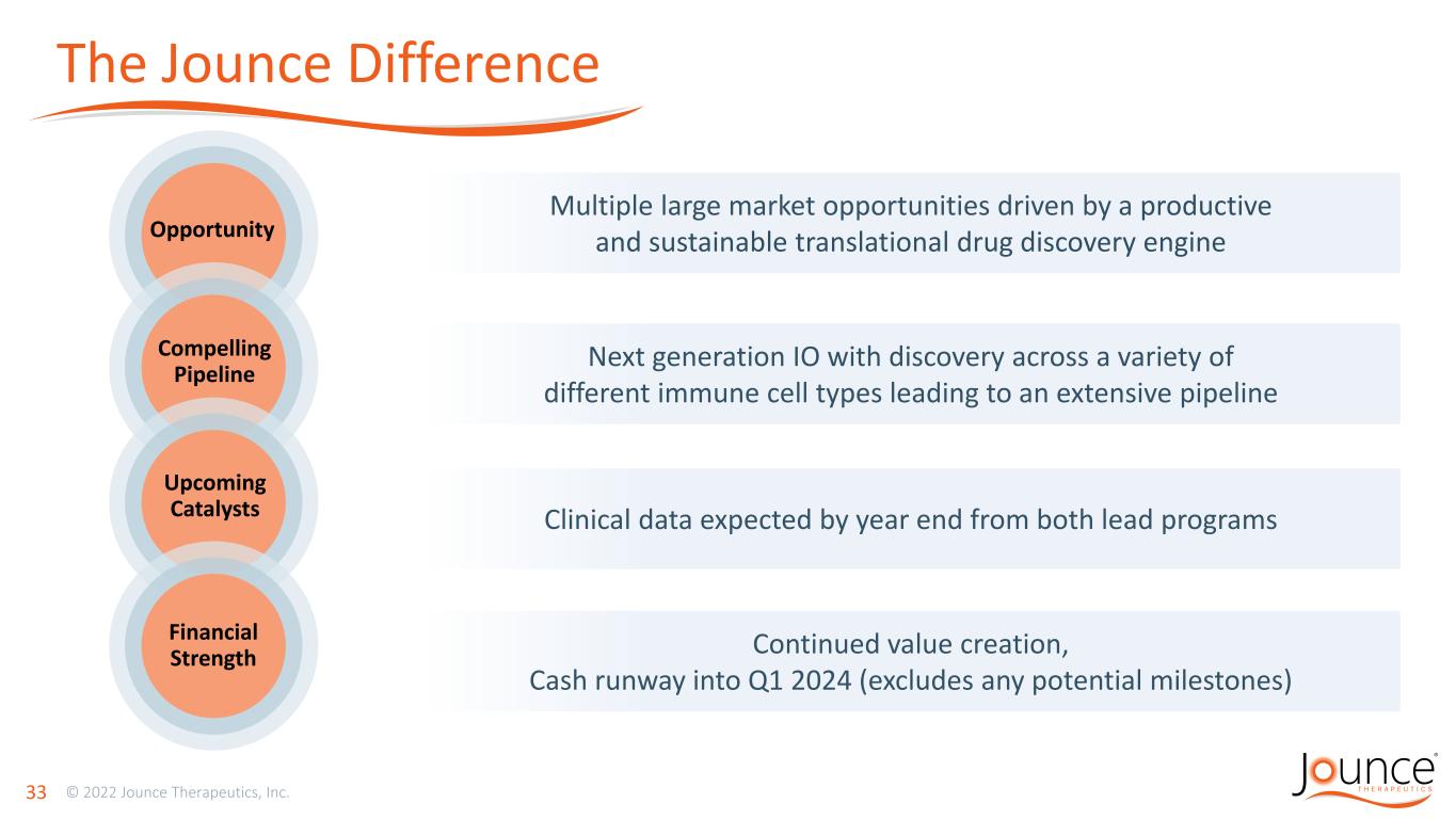 Financial Strength and Flexibility NASDAQ: JNCE Strong Balance Sheet • Cash runway into Q1 2024 • Excludes any potential milestone payments • $162.3M in cash, cash equivalents and investments, as of June 30, 2022 Cash Guidance • 2022 gross cash burn $115M - $130M Common Stock Outstanding • 51.7M shares as of June 30, 2022 32
