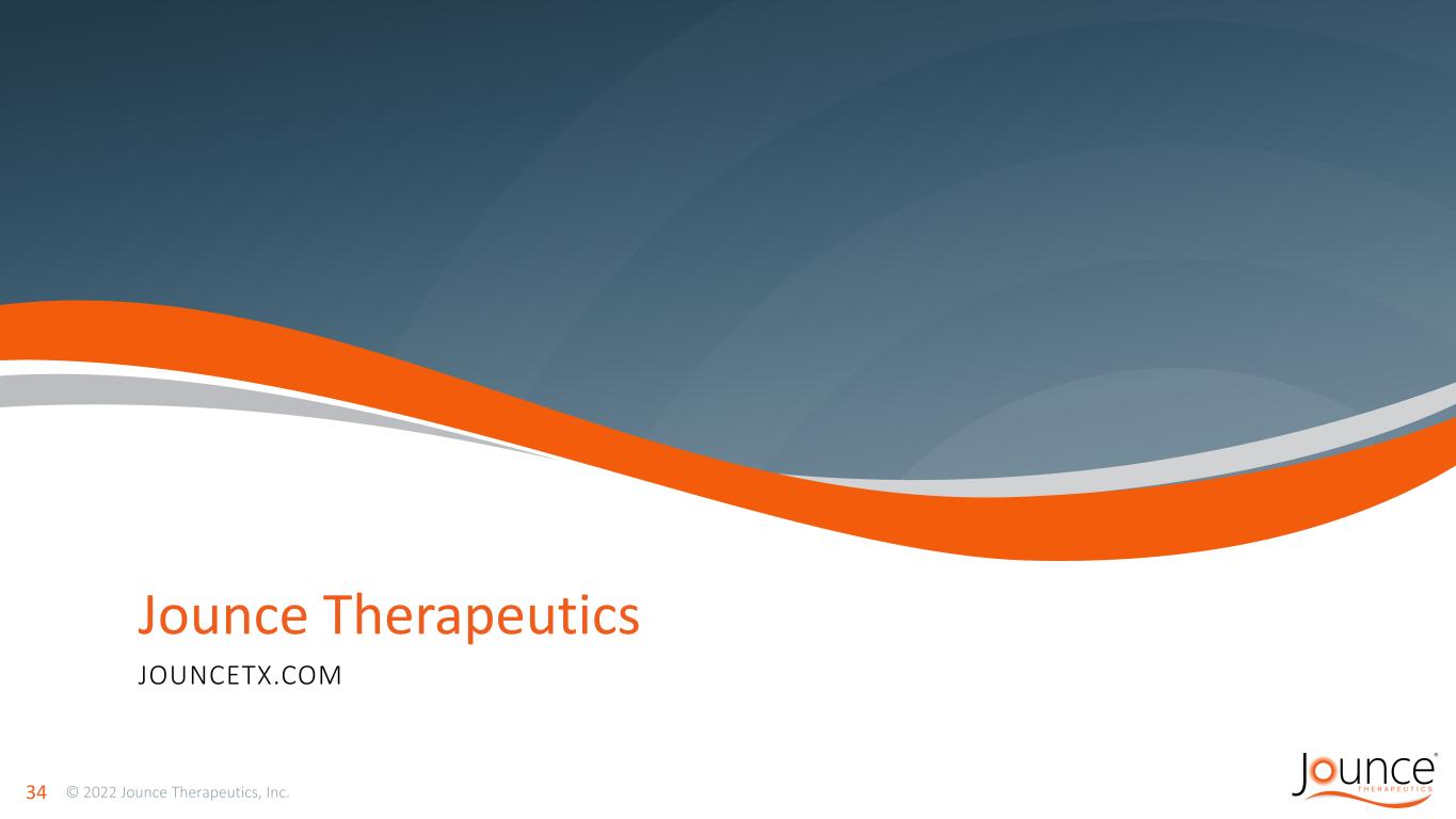 The Jounce Difference 33 Opportunity Compelling Pipeline Upcoming Catalysts Financial Strength Clinical data expected by year end from both lead programs Next generation IO with discovery across a variety of different immune cell types leading to an extensive pipeline Multiple large market opportunities driven by a productive and sustainable translational drug discovery engine Continued value creation, Cash runway into Q1 2024 (excludes any potential milestones)