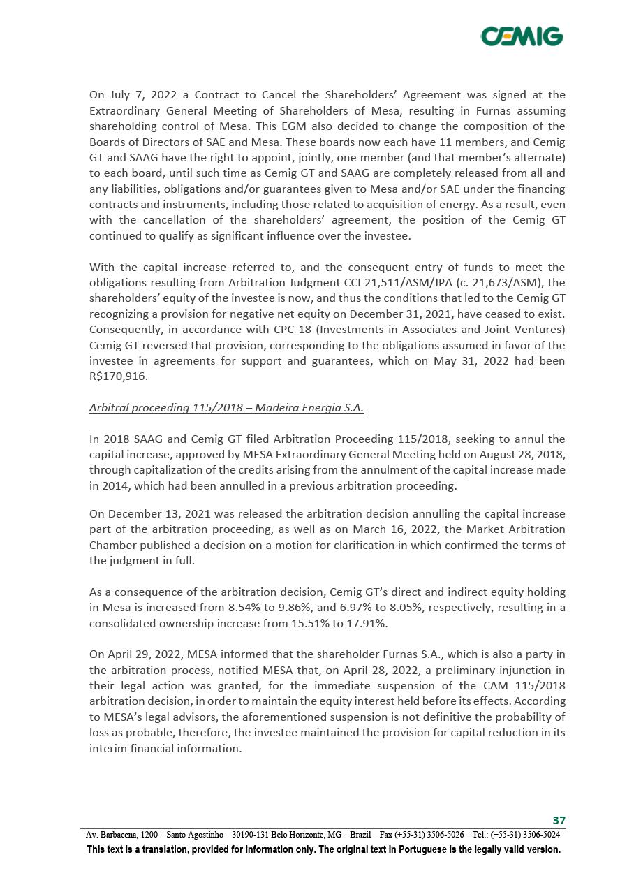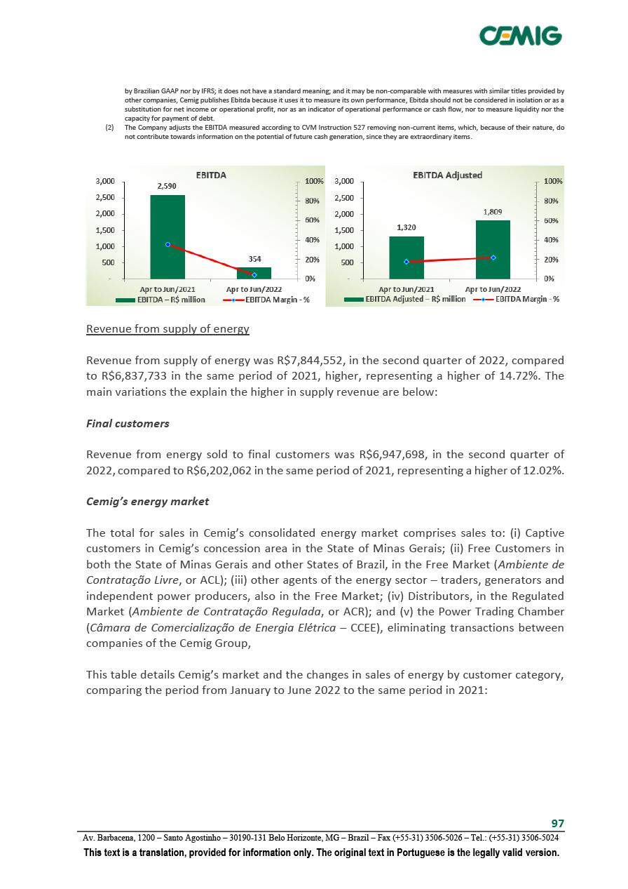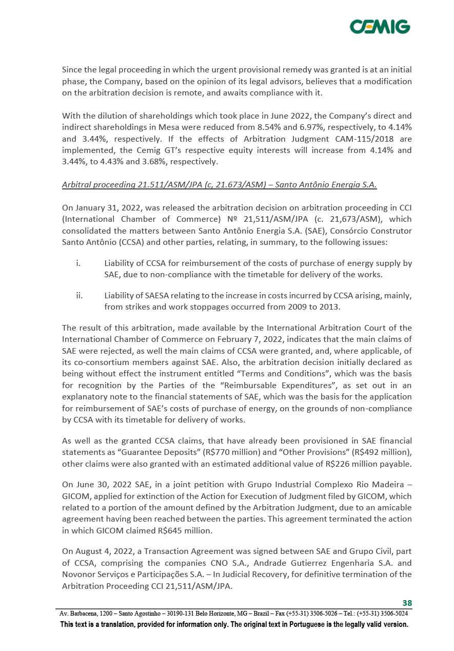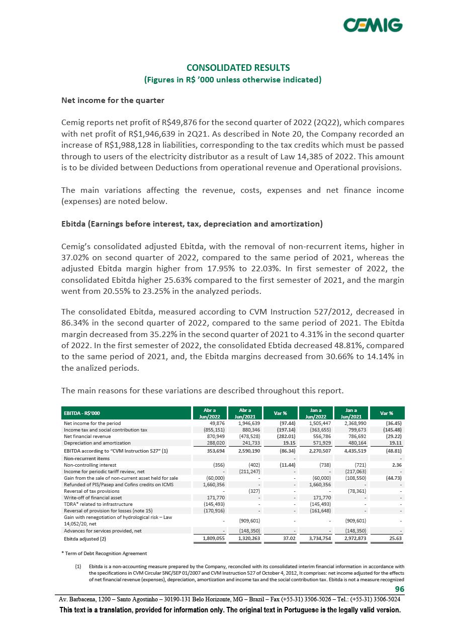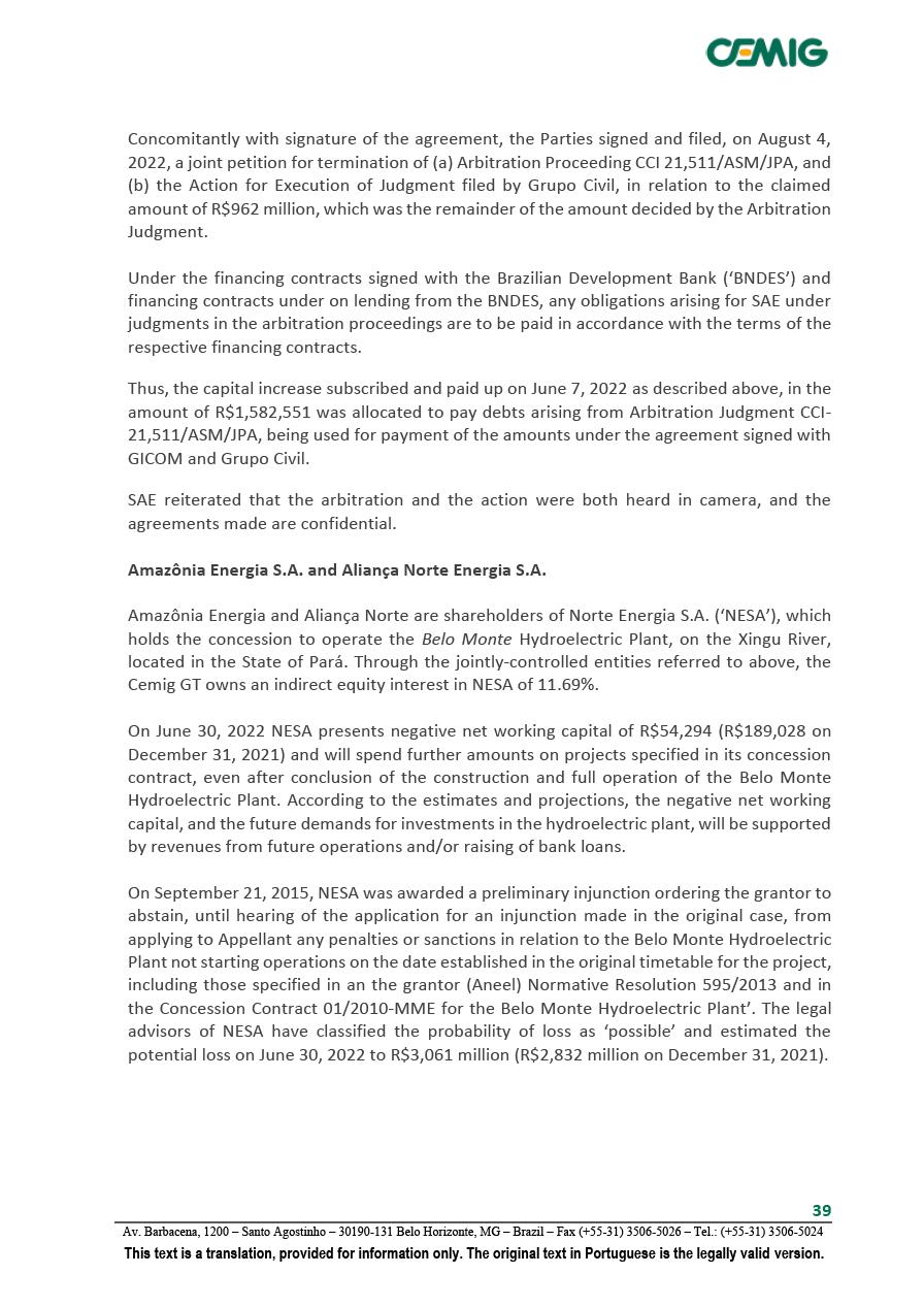 Companhia Energética de Minas Gerais - CEMIG (“Cemig” or “Company”), in response to Official Letter 184/2022/CVM/SEP/GEA-1, of August 31, 2022, makes the following considerations: