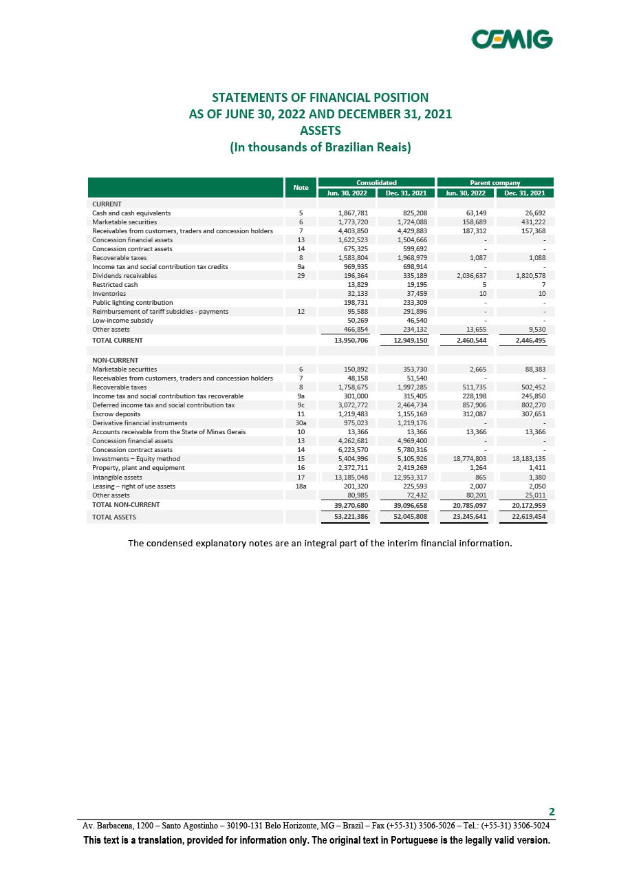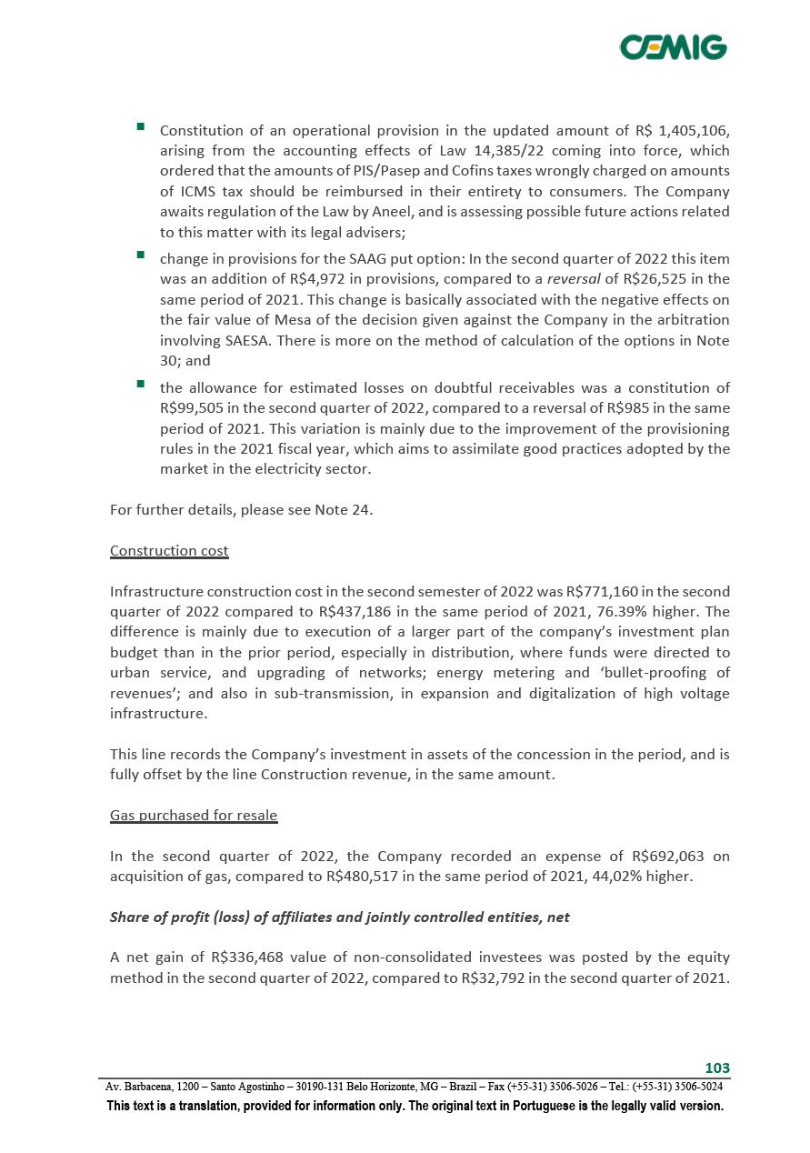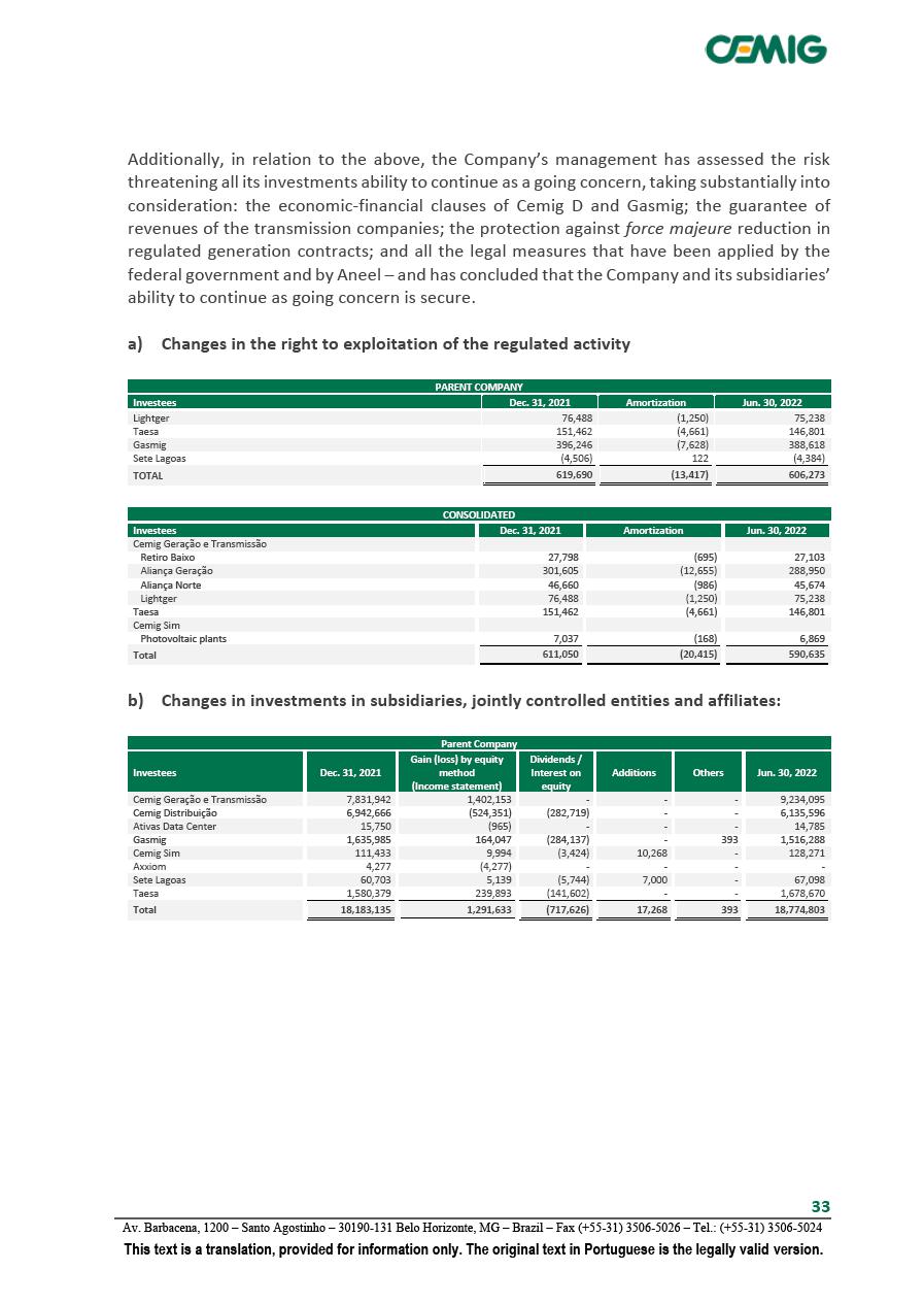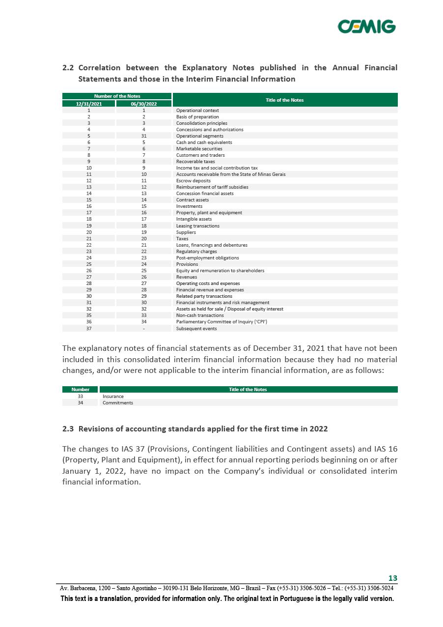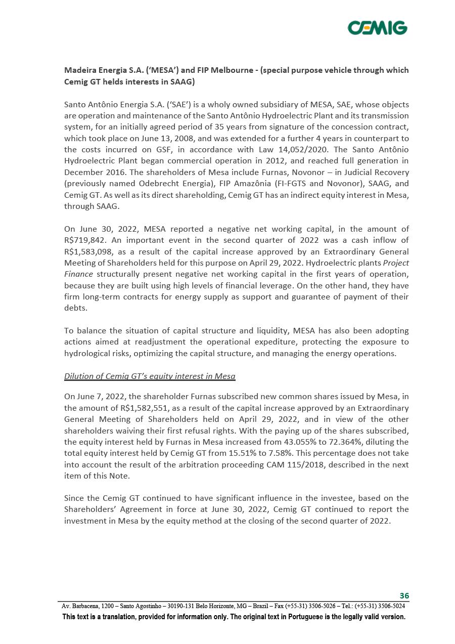 Companhia Energética de Minas Gerais - CEMIG (“Cemig” or “Company”), in response to Official Letter 184/2022/CVM/SEP/GEA-1, of August 31, 2022, makes the following considerations: