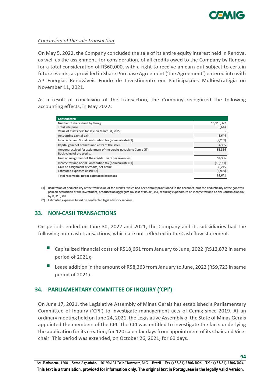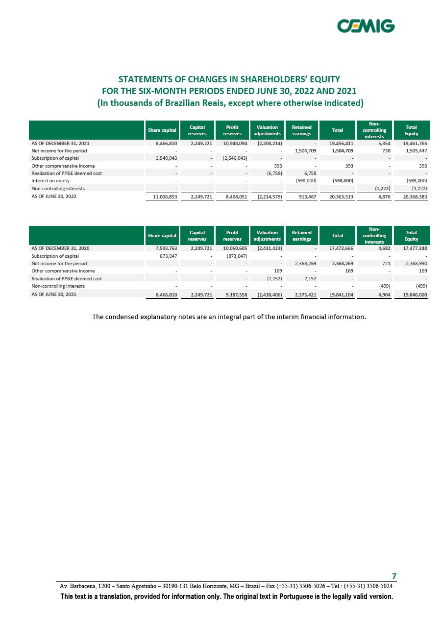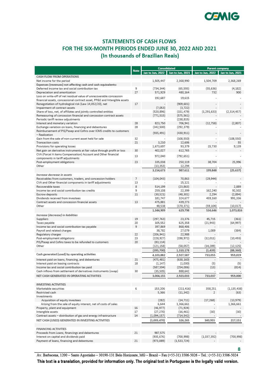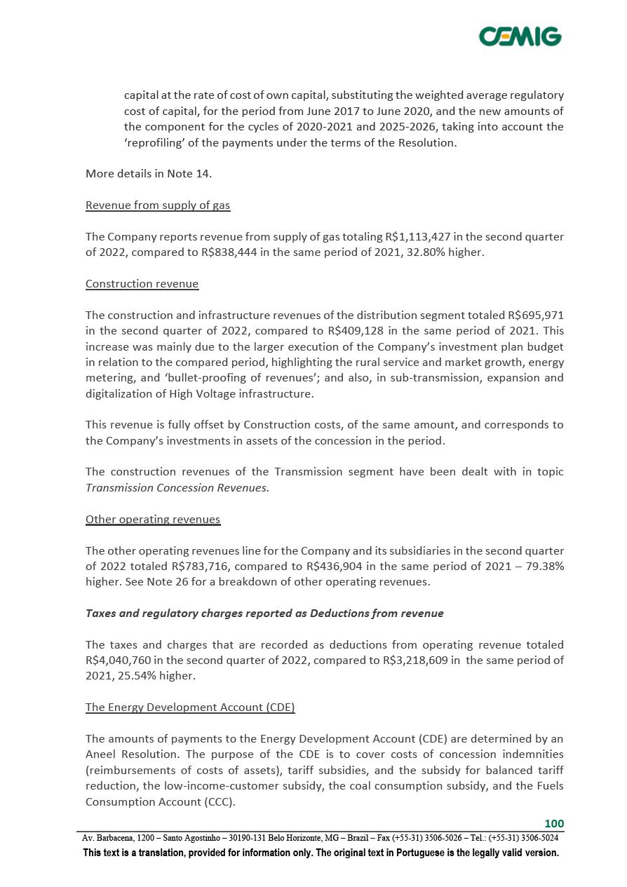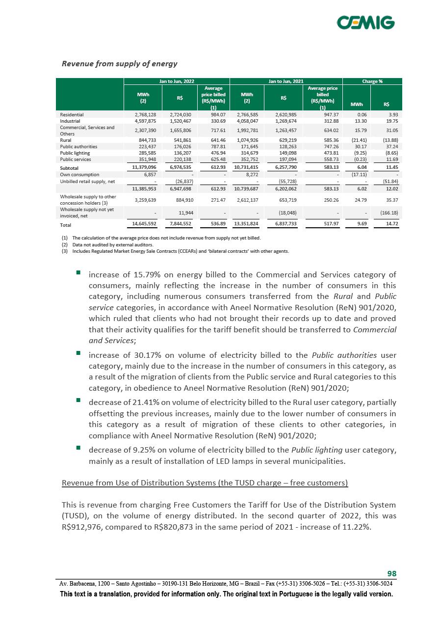 Companhia Energética de Minas Gerais - CEMIG (“Cemig” or “Company”), in response to Official Letter 184/2022/CVM/SEP/GEA-1, of August 31, 2022, makes the following considerations: