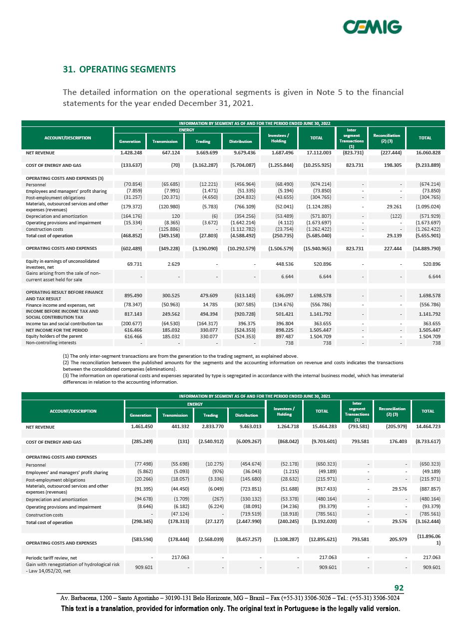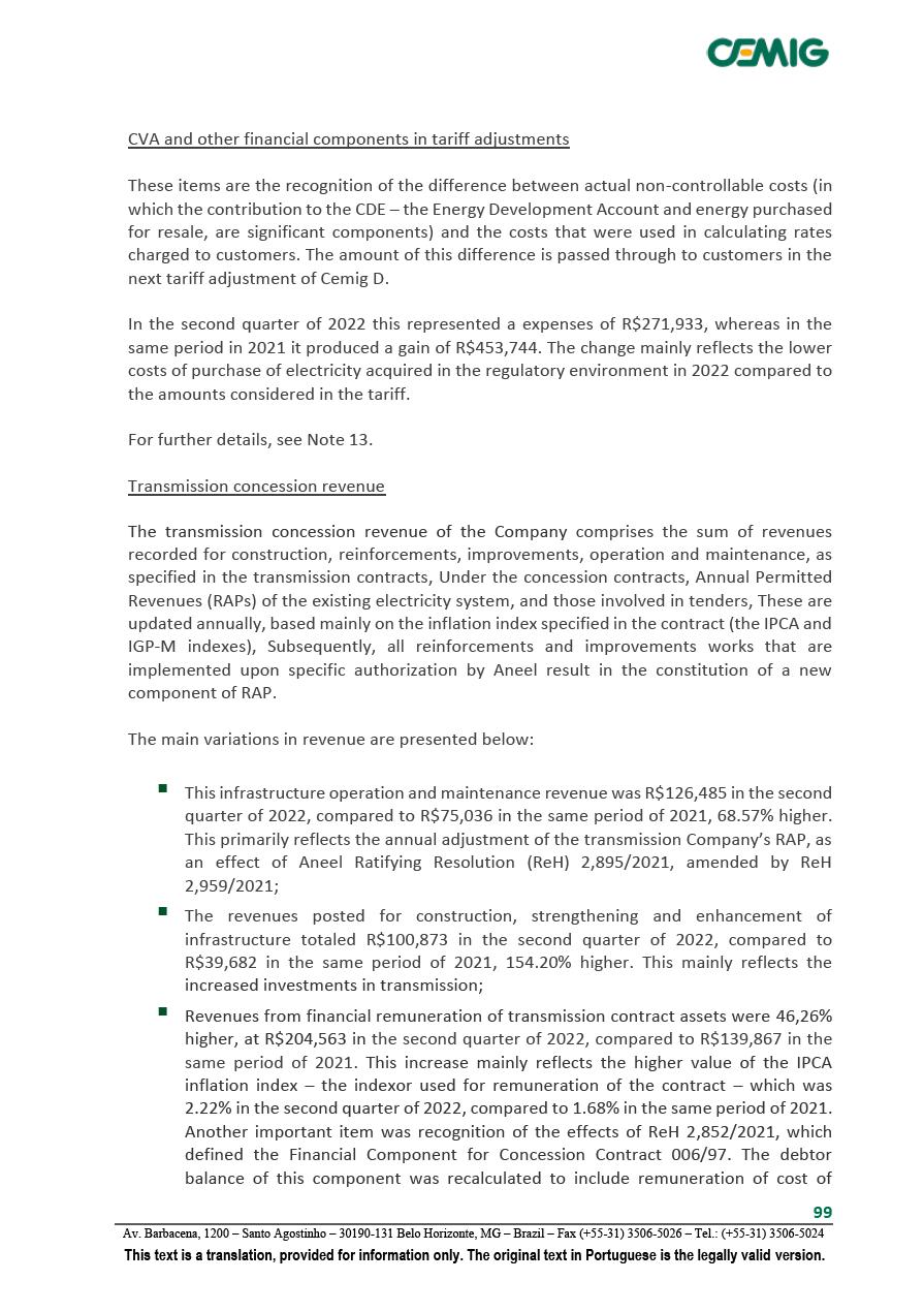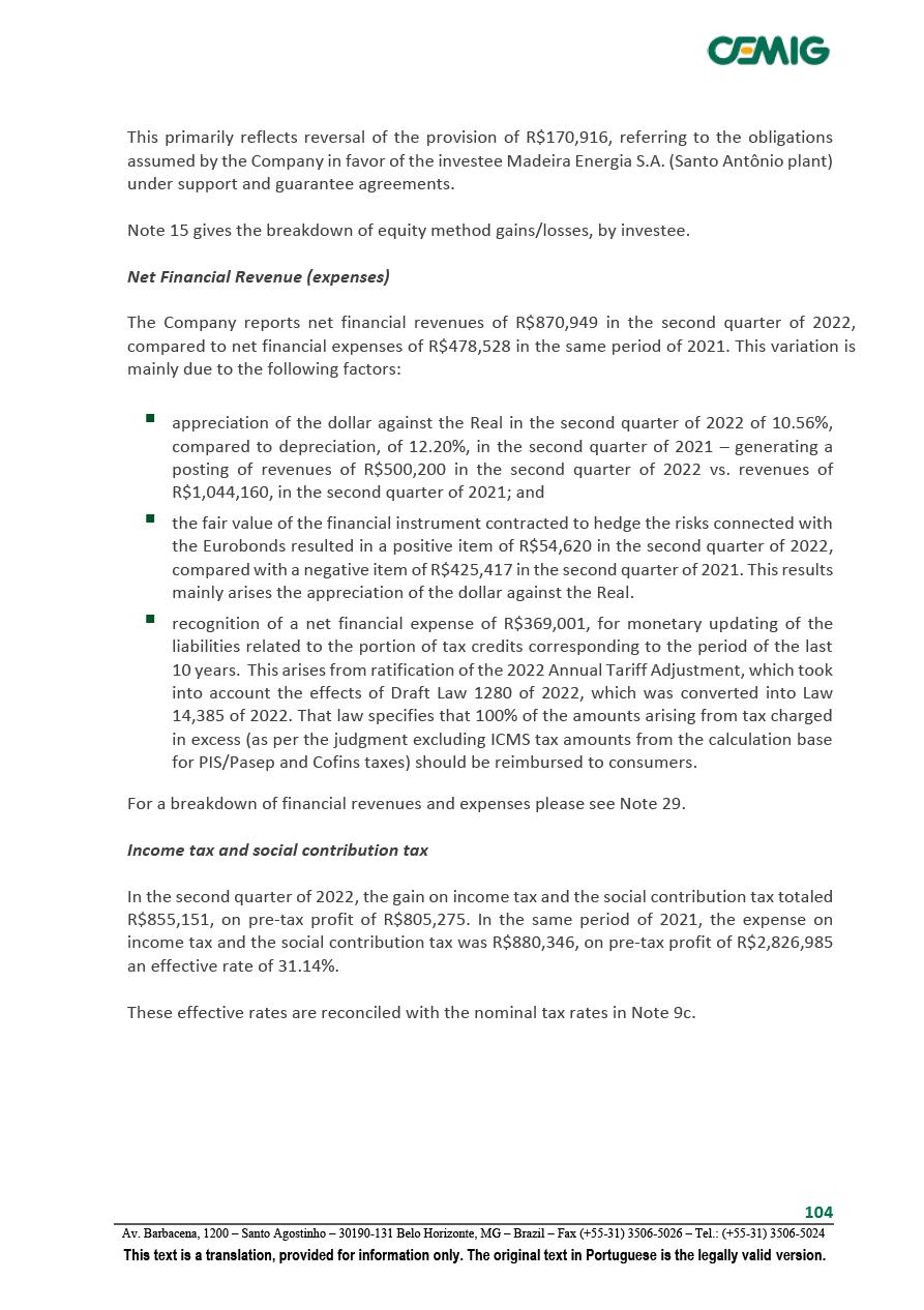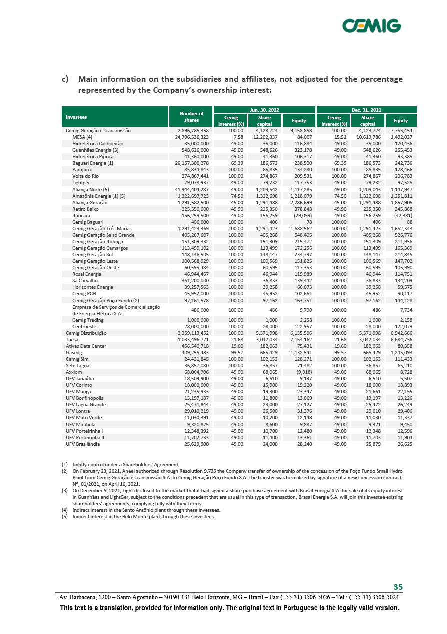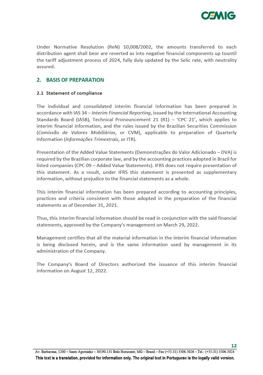 Companhia Energética de Minas Gerais - CEMIG (“Cemig” or “Company”), in response to Official Letter 184/2022/CVM/SEP/GEA-1, of August 31, 2022, makes the following considerations: