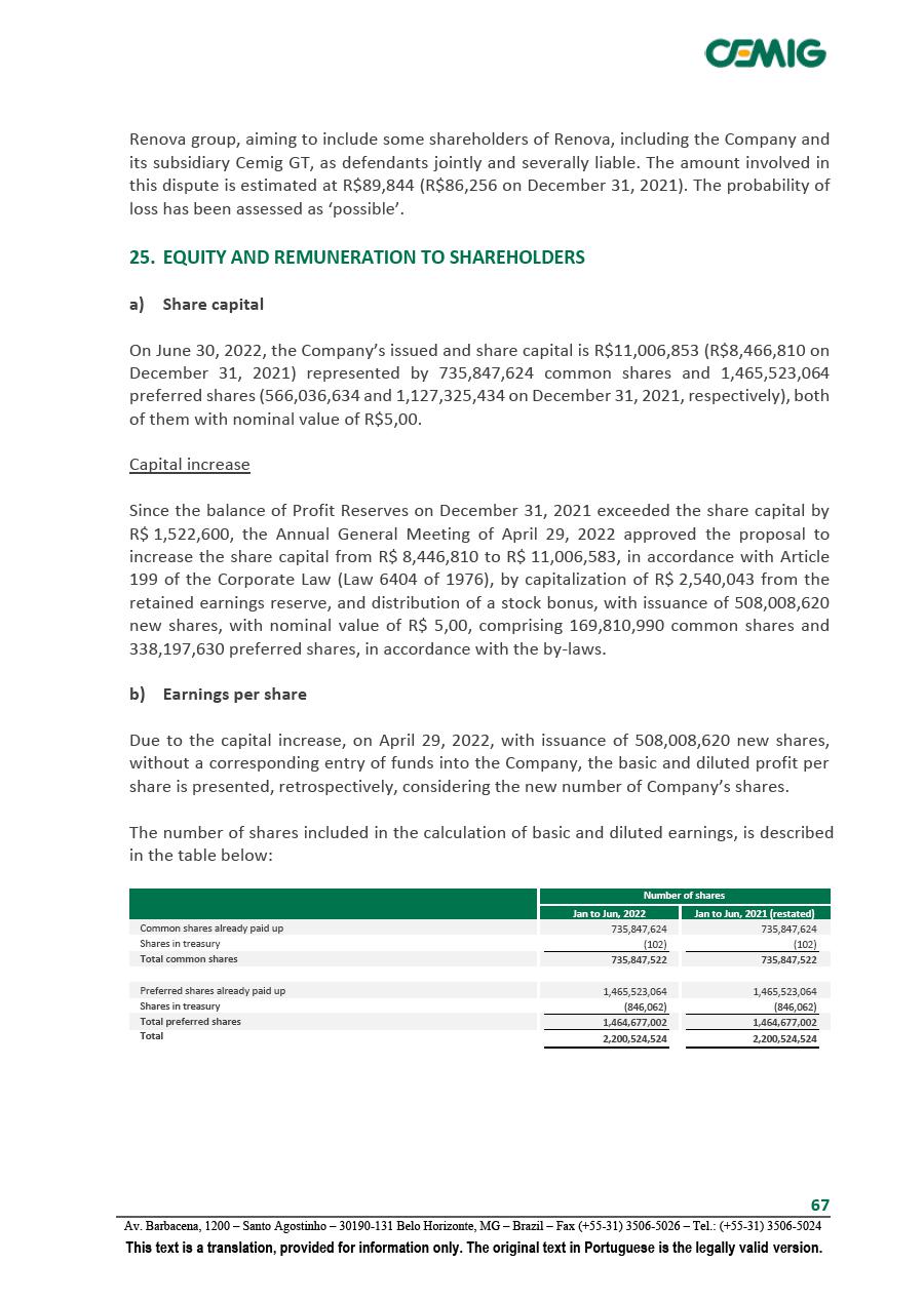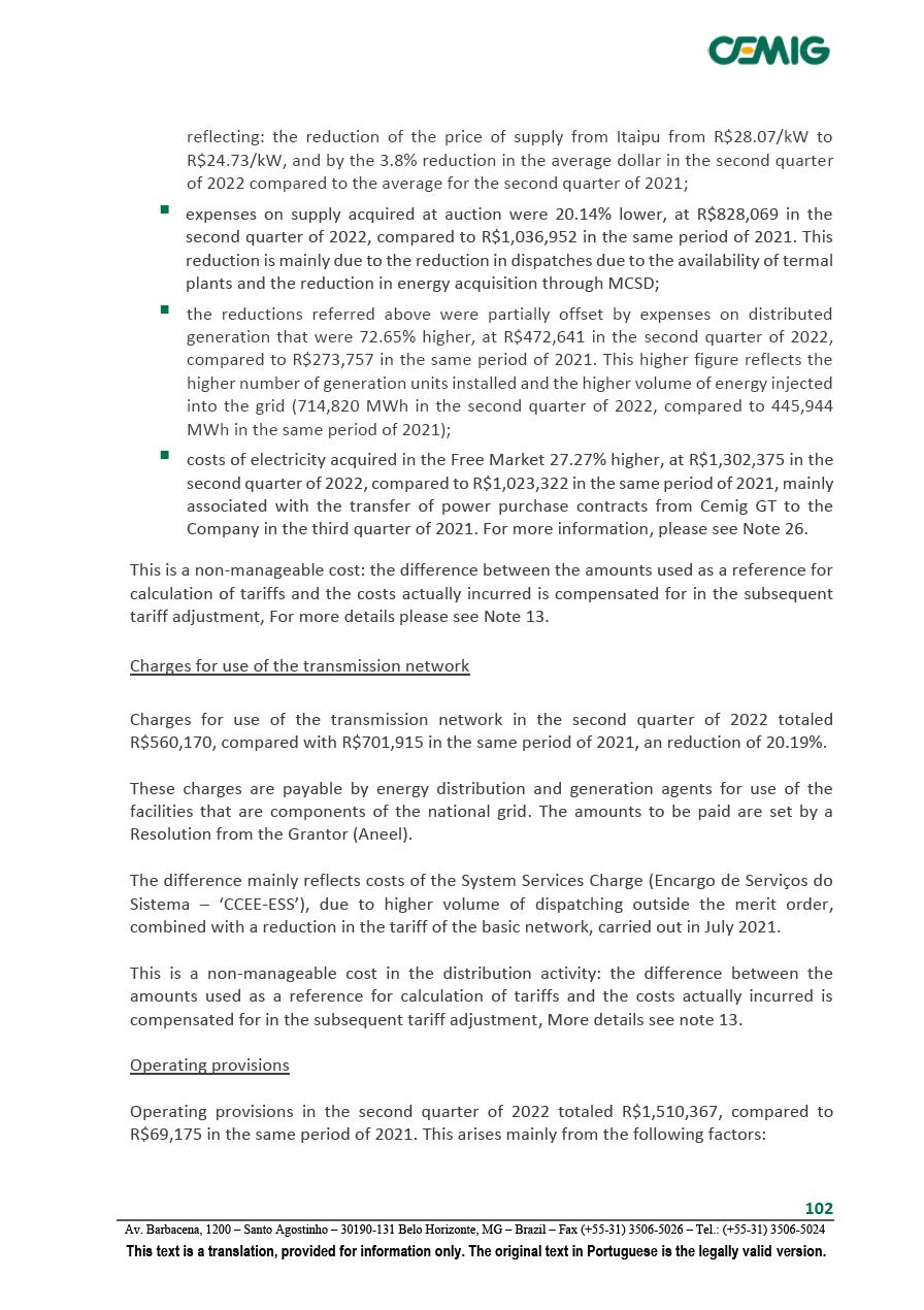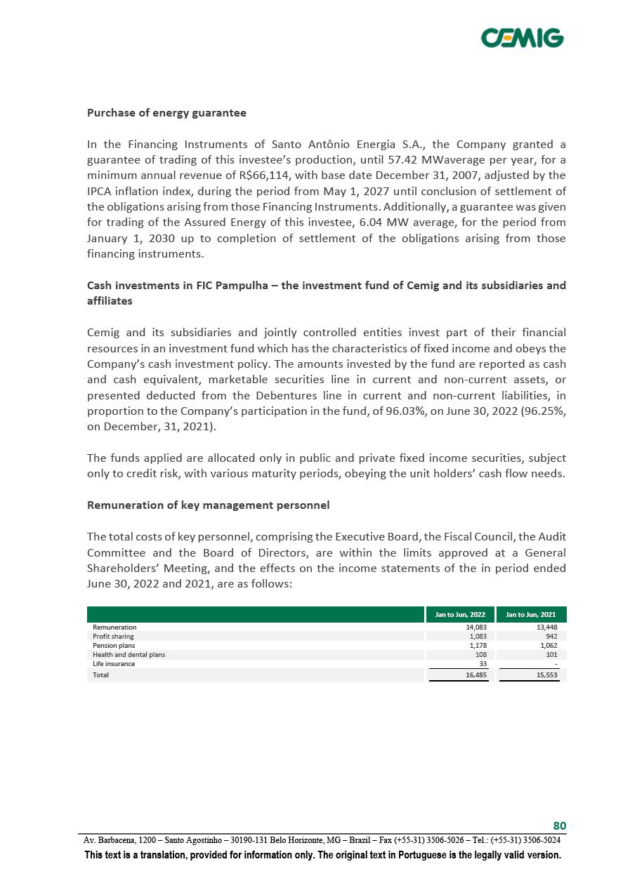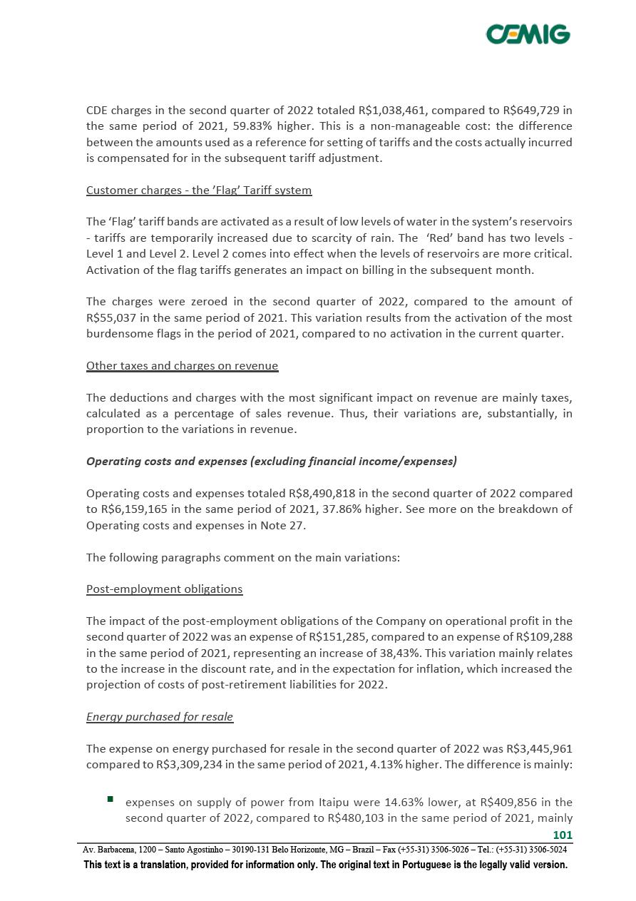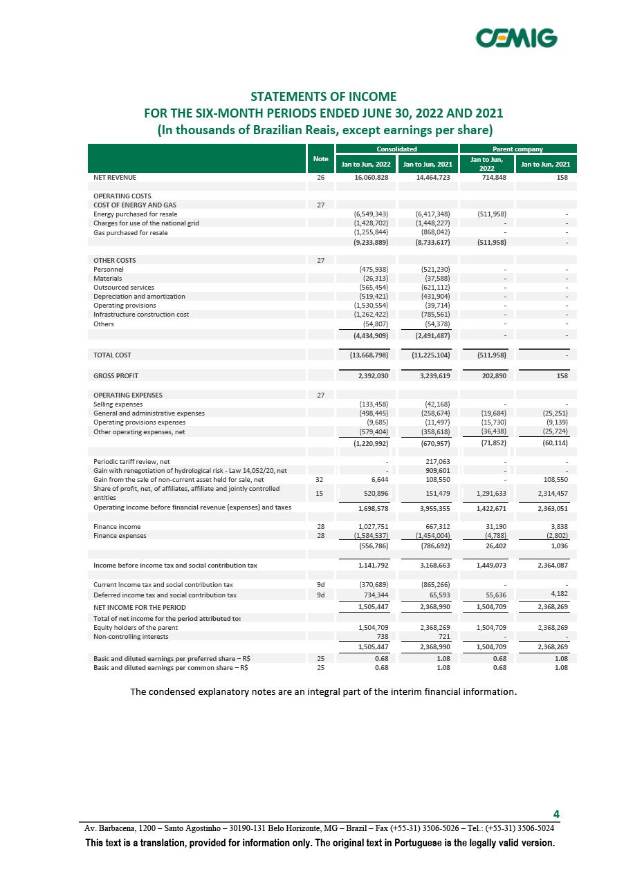 Companhia Energética de Minas Gerais - CEMIG (“Cemig” or “Company”), in response to Official Letter 184/2022/CVM/SEP/GEA-1, of August 31, 2022, makes the following considerations: