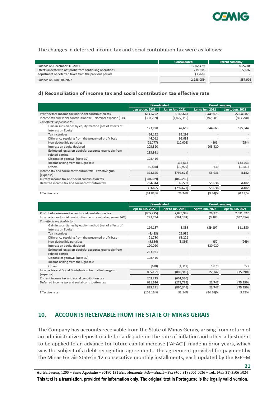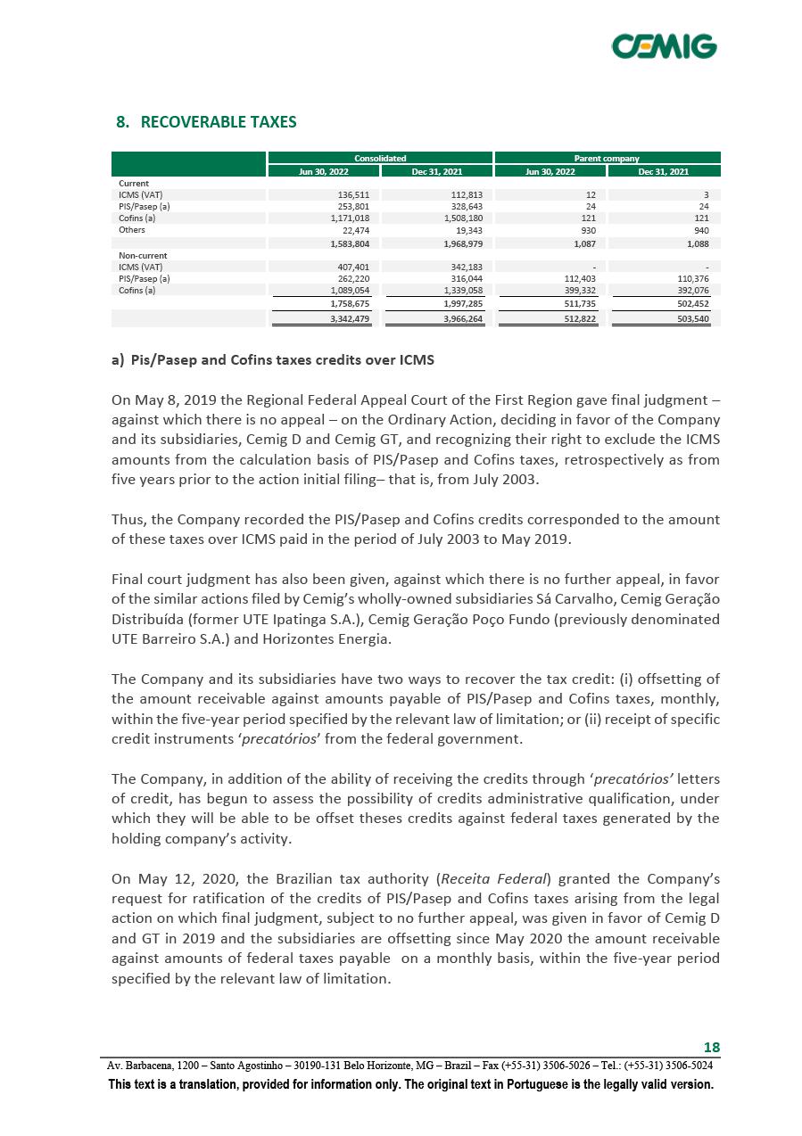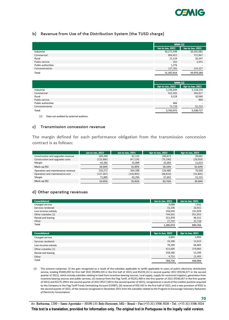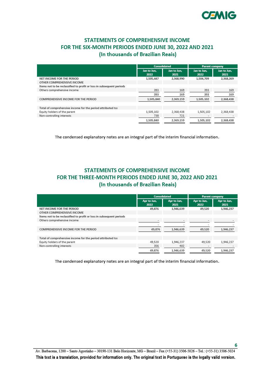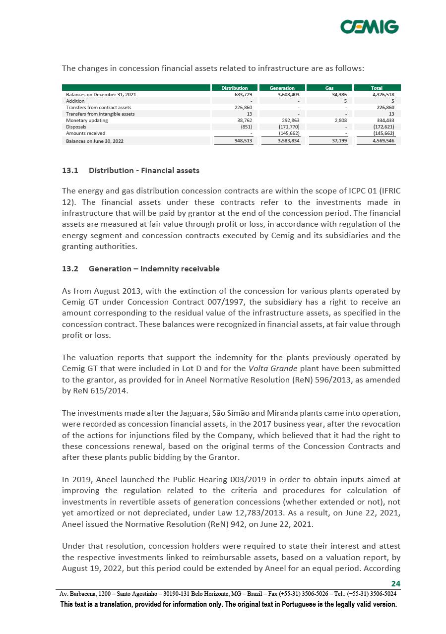 Companhia Energética de Minas Gerais - CEMIG (“Cemig” or “Company”), in response to Official Letter 184/2022/CVM/SEP/GEA-1, of August 31, 2022, makes the following considerations: