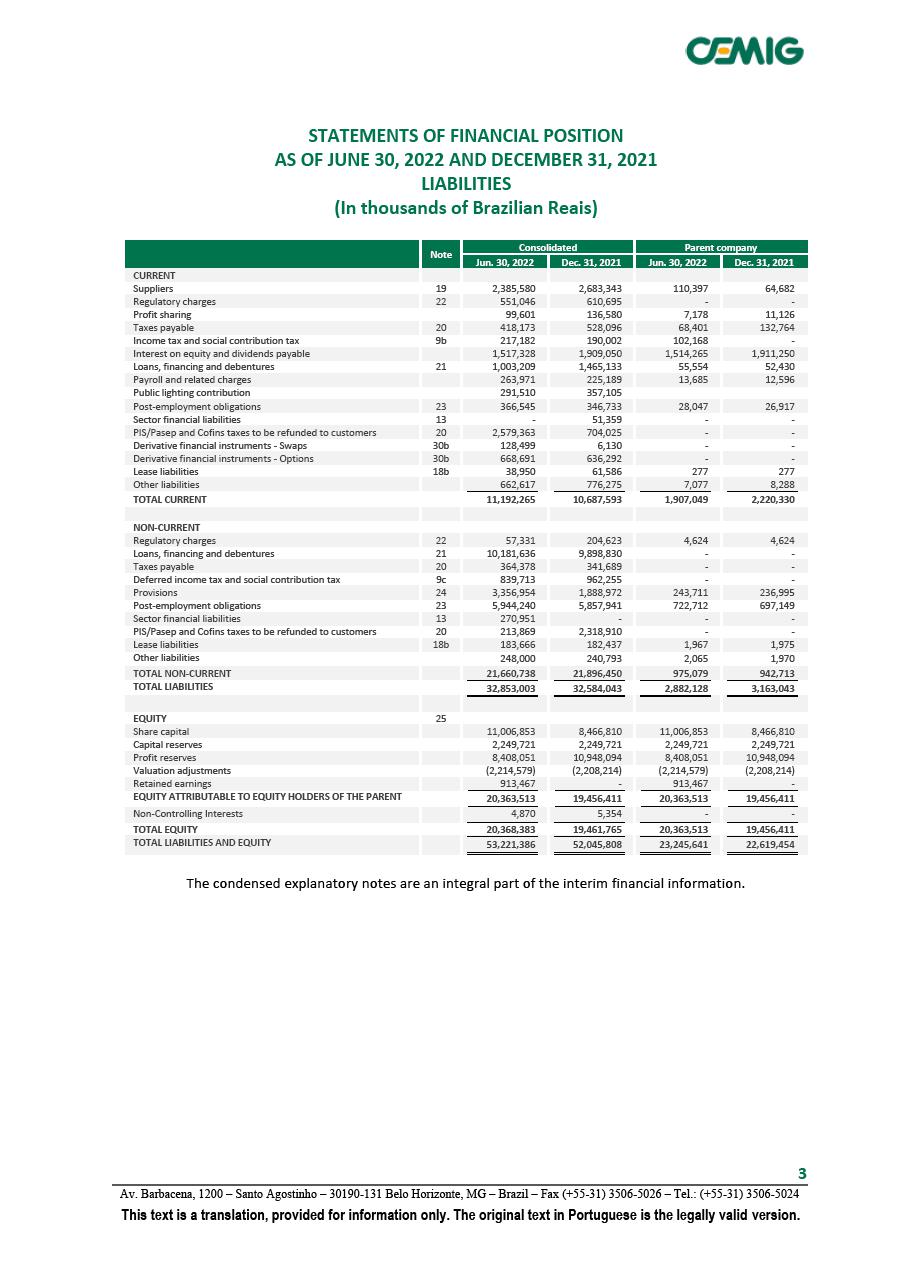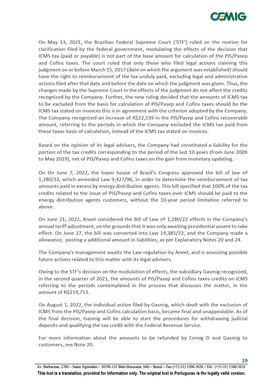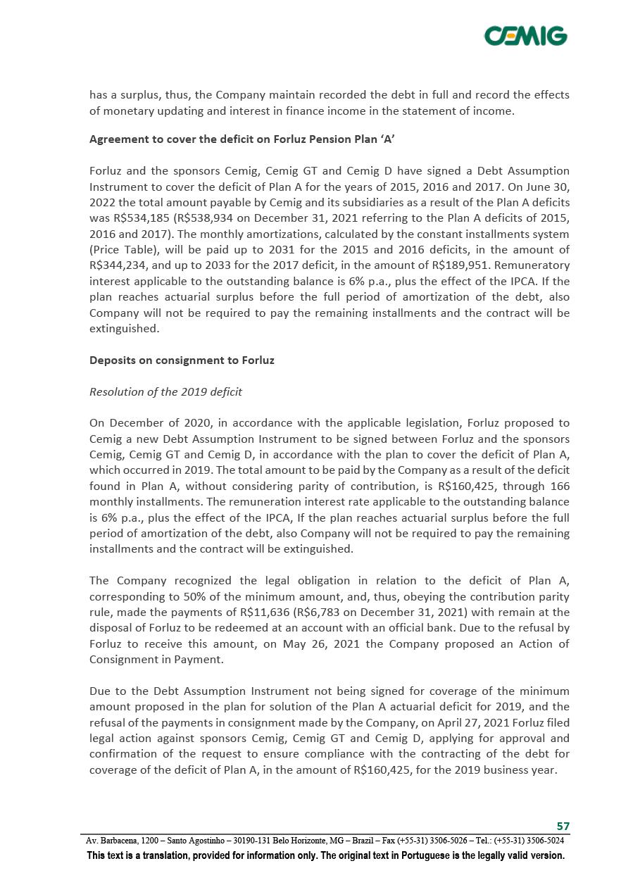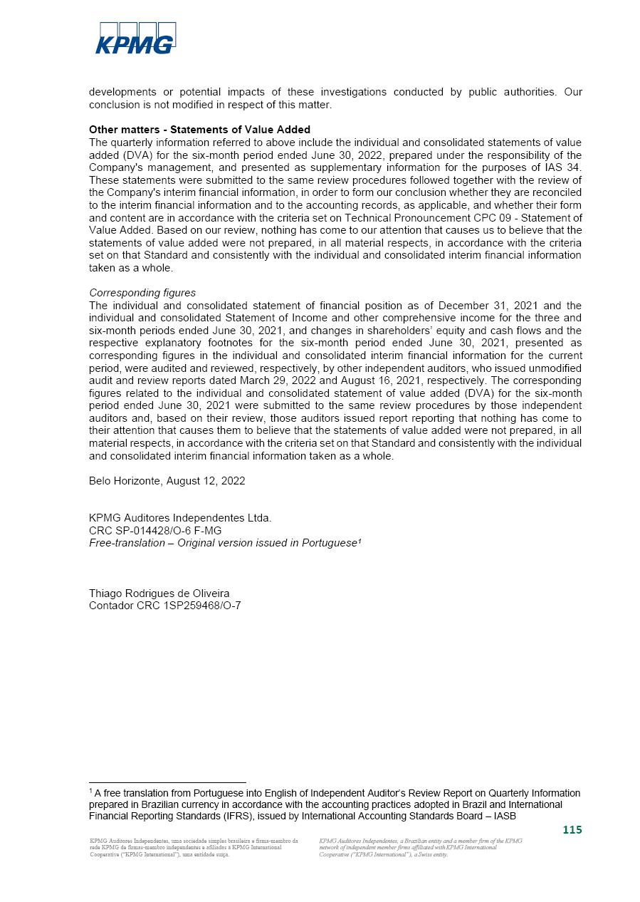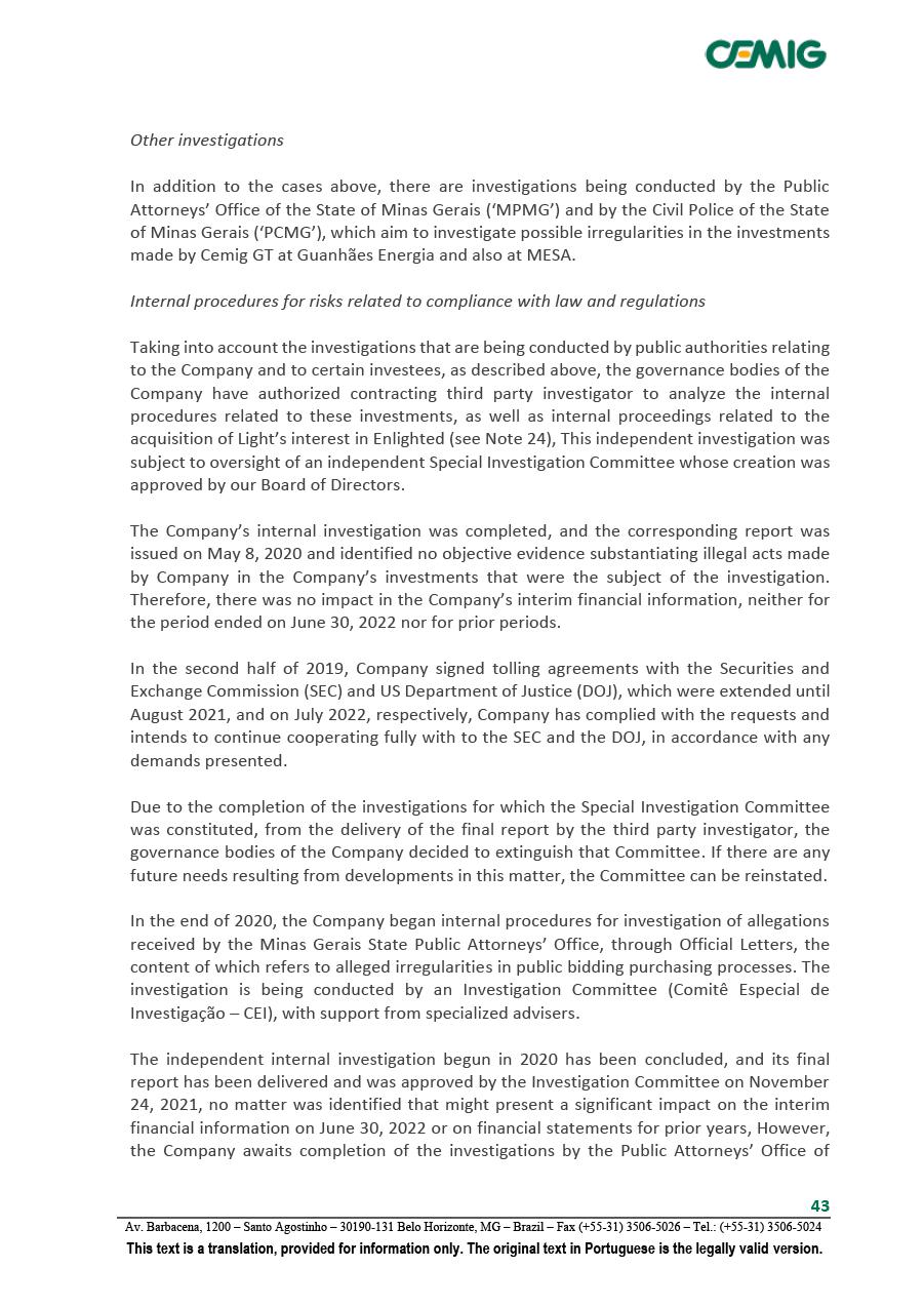 3. It is also worth noting that the 2021 Financial Statements (“DF”) were published and are available to anyone who may be interested on the Company’s website, as well as on the website of this Agency, with the following information: “At the end of 2020, the Company began internal procedures for the investigation of allegations received by the Prosecution Office of the Minas Gerais State (MPMG), through Official Letters, the content of which basically refers to alleged irregularities in public bidding purchasing processes. The investigation is being conducted by a New Investigation Committee, with support from specialized advisors. The independent internal investigation started in 2020 has been concluded and the final report has been delivered to and approved by the Investigation Committee on November 24, 2021, and no matters that could significantly impact the financial statements for December 31, 2021, or the financial statements for previous years have been identified. However, the Company is awaiting the outcome of the ongoing investigations by the MPMG and comments from Brazilian and international authorities, to which the reports were presented, to confirm whether any additional procedure will be necessary. The Company will evaluate any changes in the future scenario and eventual impacts that could affect the financial statements, when applicable. The Company continues to cooperate with Brazilian and foreign authorities in their analysis related to the ongoing investigations.”