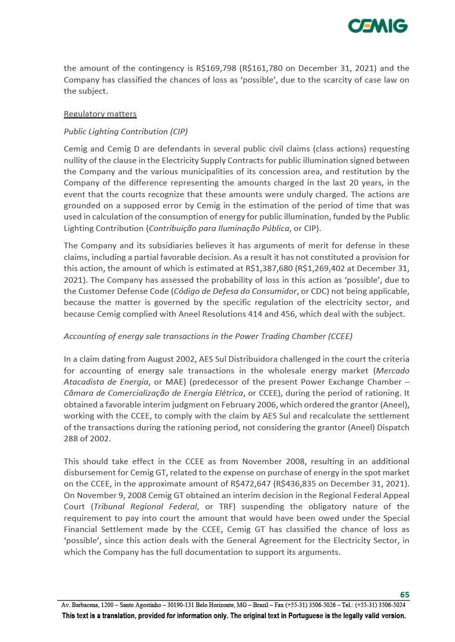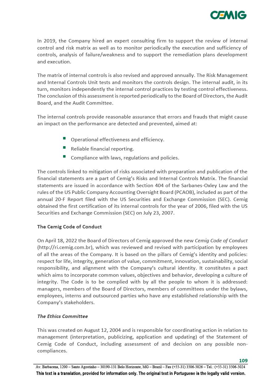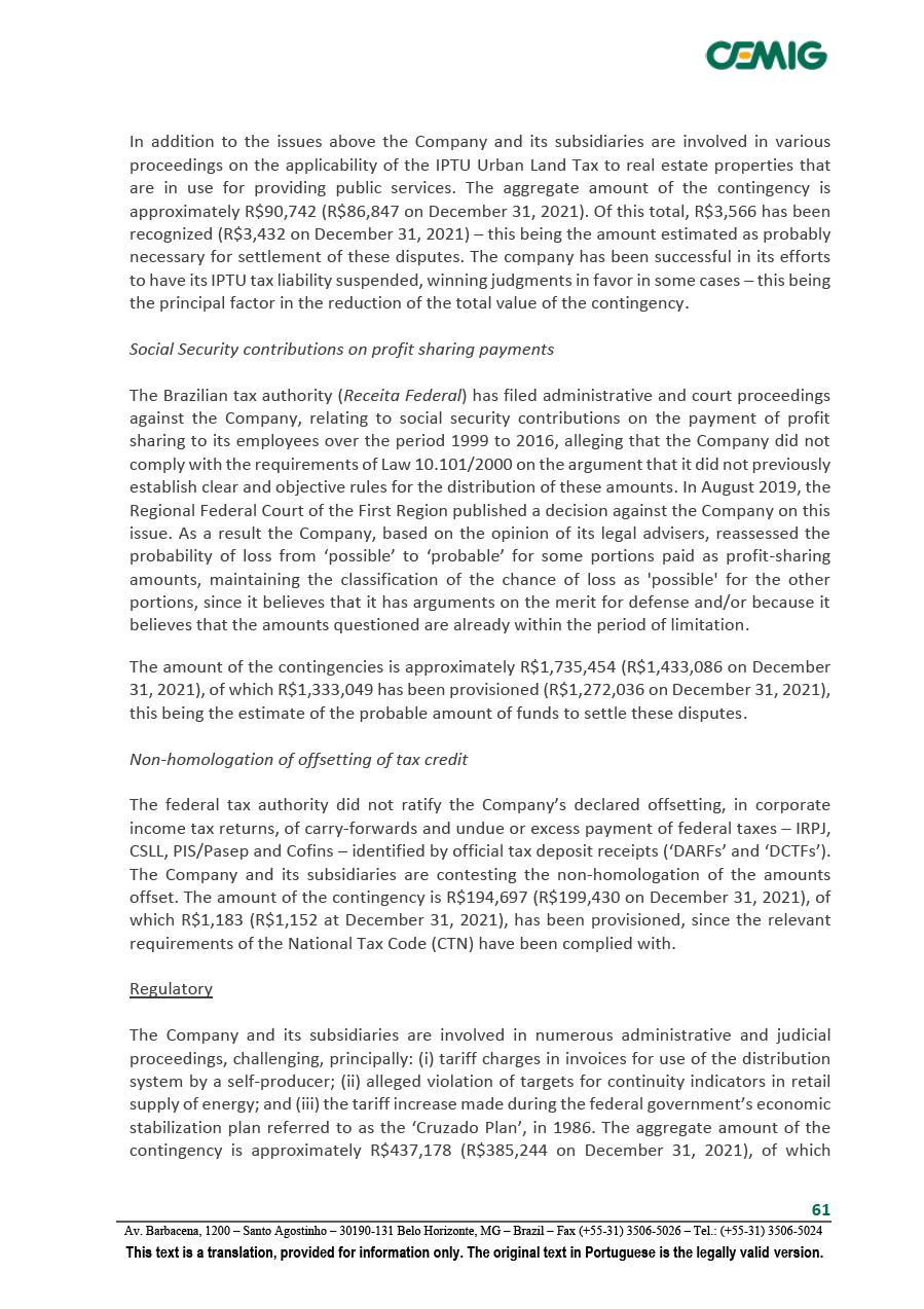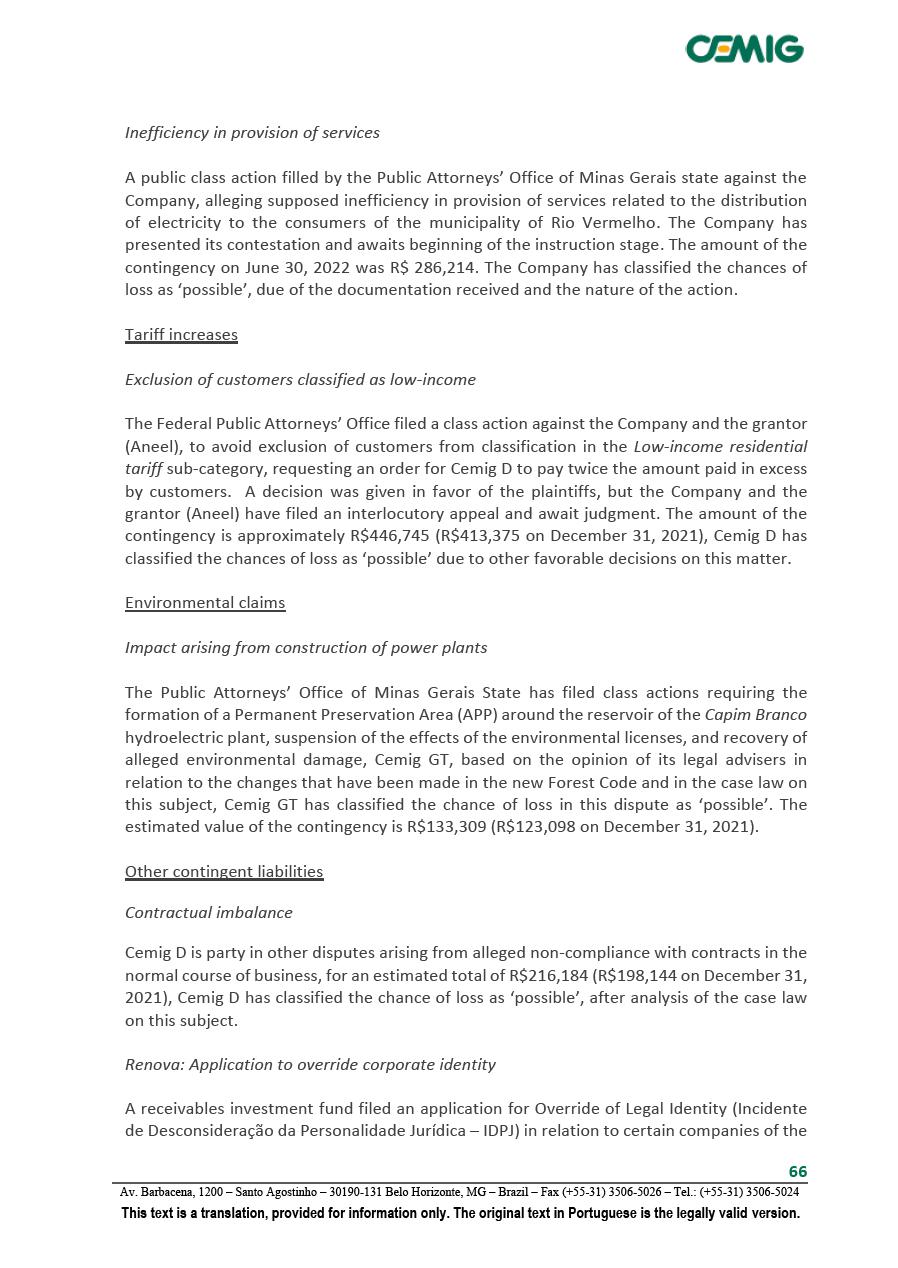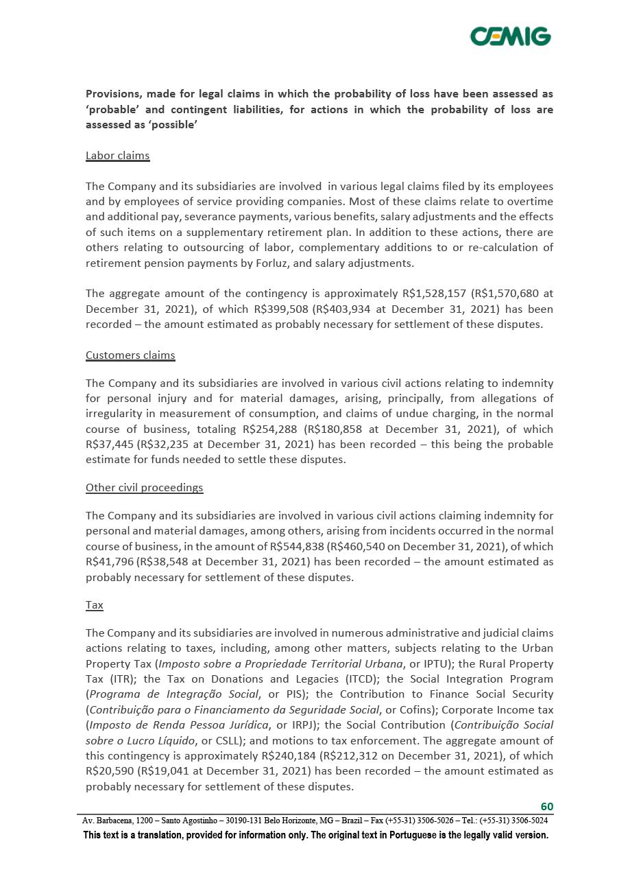 3. It is also worth noting that the 2021 Financial Statements (“DF”) were published and are available to anyone who may be interested on the Company’s website, as well as on the website of this Agency, with the following information: “At the end of 2020, the Company began internal procedures for the investigation of allegations received by the Prosecution Office of the Minas Gerais State (MPMG), through Official Letters, the content of which basically refers to alleged irregularities in public bidding purchasing processes. The investigation is being conducted by a New Investigation Committee, with support from specialized advisors. The independent internal investigation started in 2020 has been concluded and the final report has been delivered to and approved by the Investigation Committee on November 24, 2021, and no matters that could significantly impact the financial statements for December 31, 2021, or the financial statements for previous years have been identified. However, the Company is awaiting the outcome of the ongoing investigations by the MPMG and comments from Brazilian and international authorities, to which the reports were presented, to confirm whether any additional procedure will be necessary. The Company will evaluate any changes in the future scenario and eventual impacts that could affect the financial statements, when applicable. The Company continues to cooperate with Brazilian and foreign authorities in their analysis related to the ongoing investigations.”