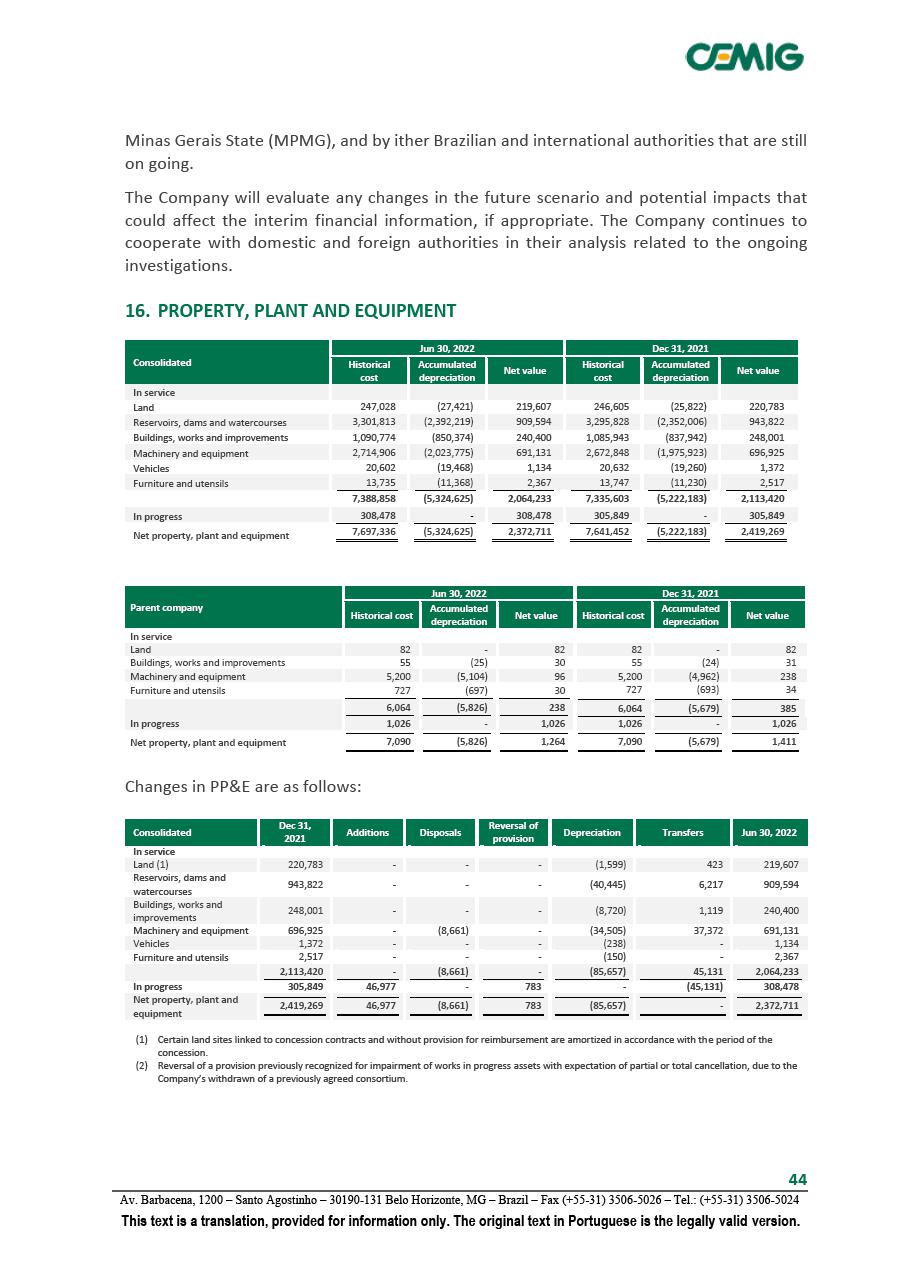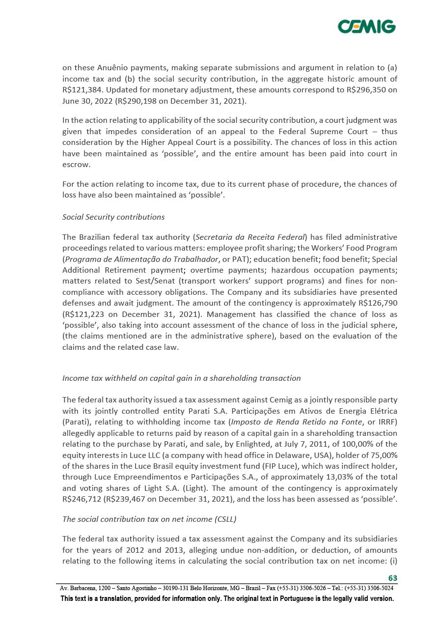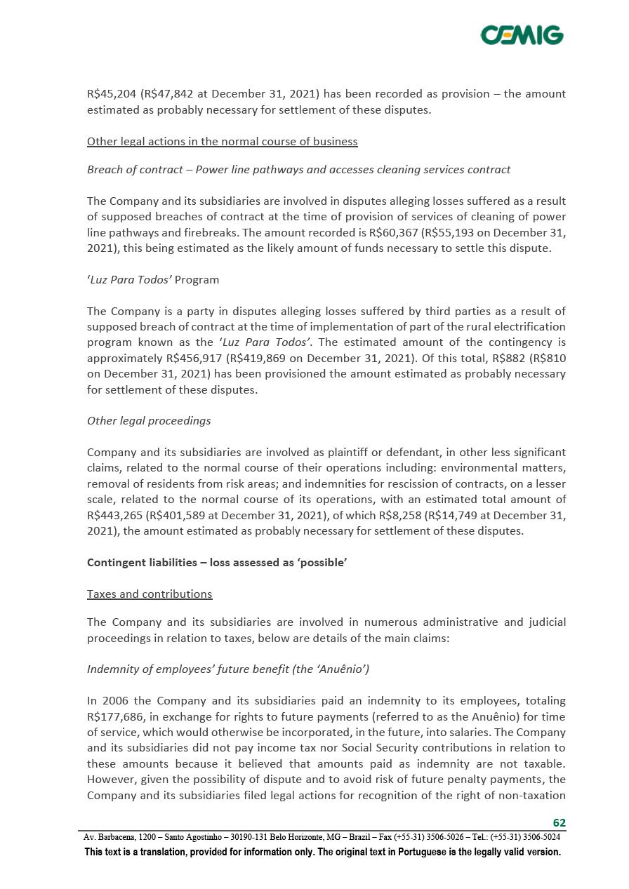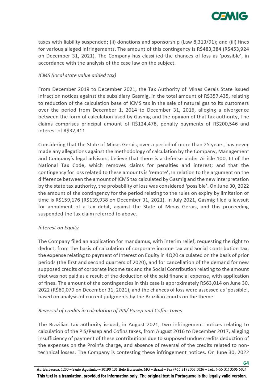 3. It is also worth noting that the 2021 Financial Statements (“DF”) were published and are available to anyone who may be interested on the Company’s website, as well as on the website of this Agency, with the following information: “At the end of 2020, the Company began internal procedures for the investigation of allegations received by the Prosecution Office of the Minas Gerais State (MPMG), through Official Letters, the content of which basically refers to alleged irregularities in public bidding purchasing processes. The investigation is being conducted by a New Investigation Committee, with support from specialized advisors. The independent internal investigation started in 2020 has been concluded and the final report has been delivered to and approved by the Investigation Committee on November 24, 2021, and no matters that could significantly impact the financial statements for December 31, 2021, or the financial statements for previous years have been identified. However, the Company is awaiting the outcome of the ongoing investigations by the MPMG and comments from Brazilian and international authorities, to which the reports were presented, to confirm whether any additional procedure will be necessary. The Company will evaluate any changes in the future scenario and eventual impacts that could affect the financial statements, when applicable. The Company continues to cooperate with Brazilian and foreign authorities in their analysis related to the ongoing investigations.”