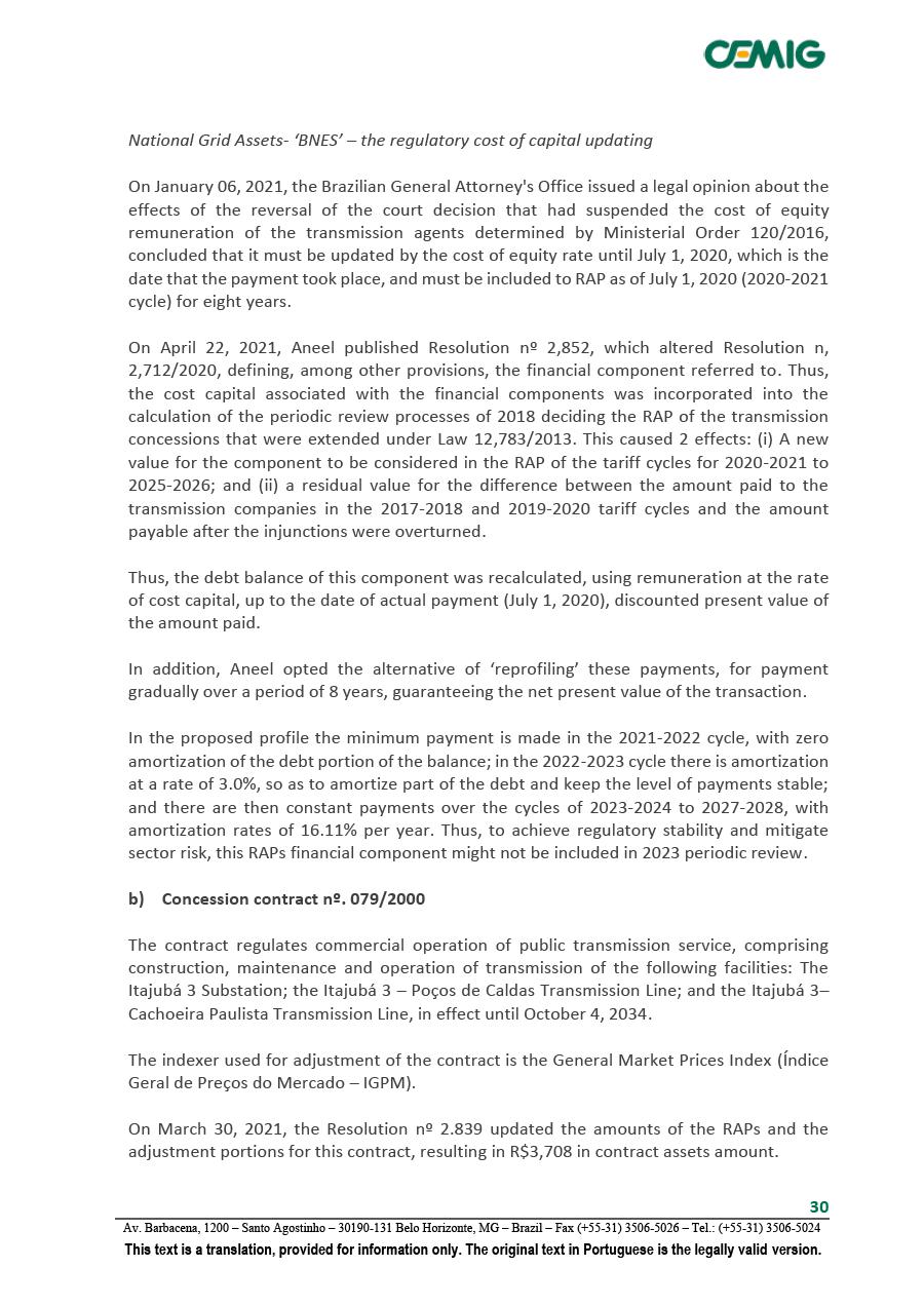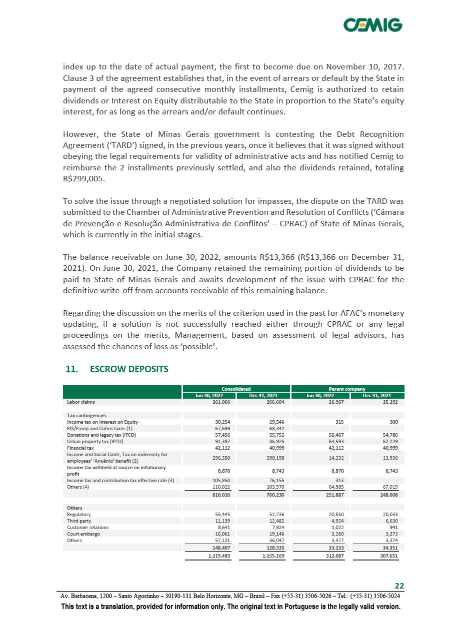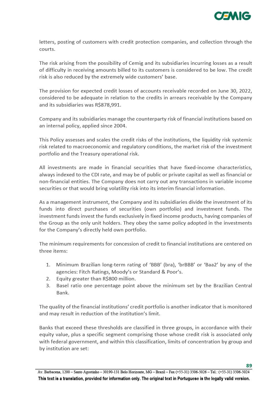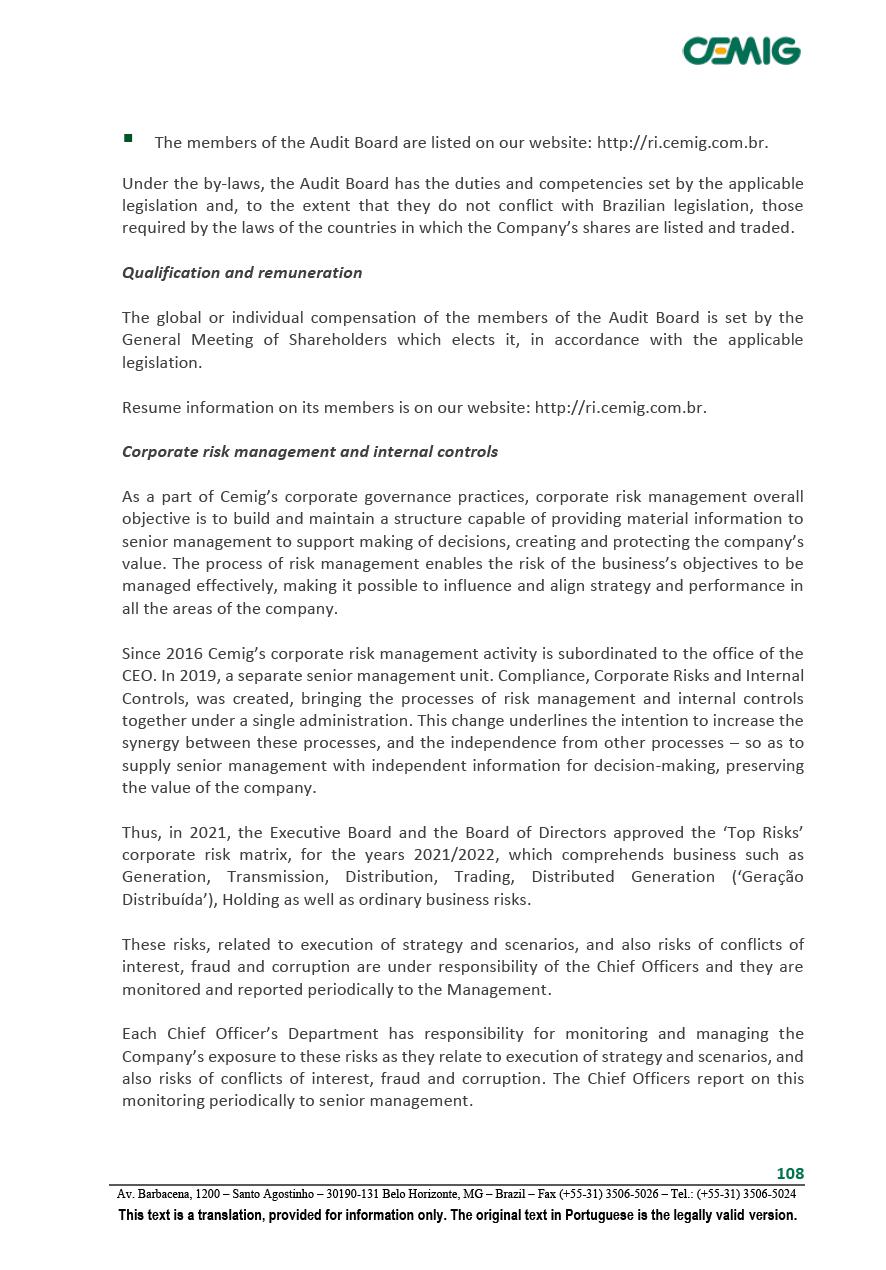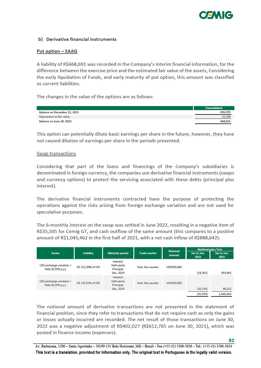 3. It is also worth noting that the 2021 Financial Statements (“DF”) were published and are available to anyone who may be interested on the Company’s website, as well as on the website of this Agency, with the following information: “At the end of 2020, the Company began internal procedures for the investigation of allegations received by the Prosecution Office of the Minas Gerais State (MPMG), through Official Letters, the content of which basically refers to alleged irregularities in public bidding purchasing processes. The investigation is being conducted by a New Investigation Committee, with support from specialized advisors. The independent internal investigation started in 2020 has been concluded and the final report has been delivered to and approved by the Investigation Committee on November 24, 2021, and no matters that could significantly impact the financial statements for December 31, 2021, or the financial statements for previous years have been identified. However, the Company is awaiting the outcome of the ongoing investigations by the MPMG and comments from Brazilian and international authorities, to which the reports were presented, to confirm whether any additional procedure will be necessary. The Company will evaluate any changes in the future scenario and eventual impacts that could affect the financial statements, when applicable. The Company continues to cooperate with Brazilian and foreign authorities in their analysis related to the ongoing investigations.”
