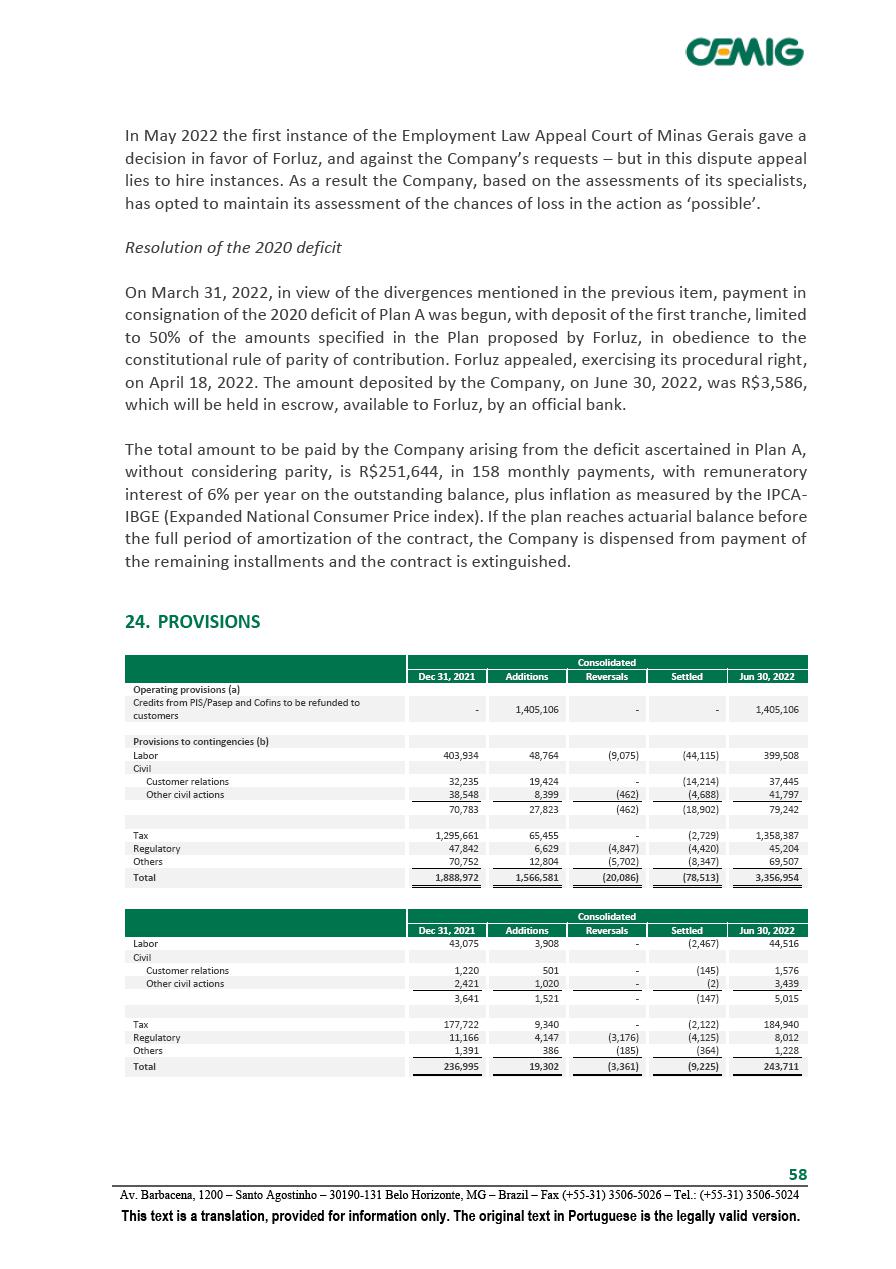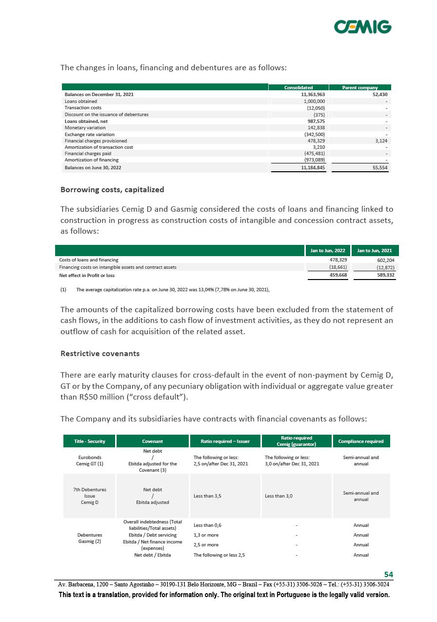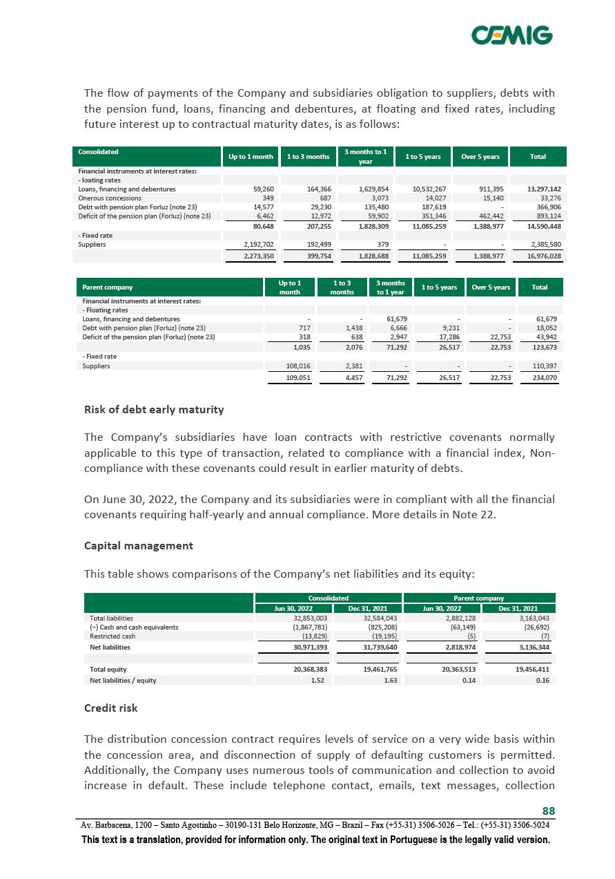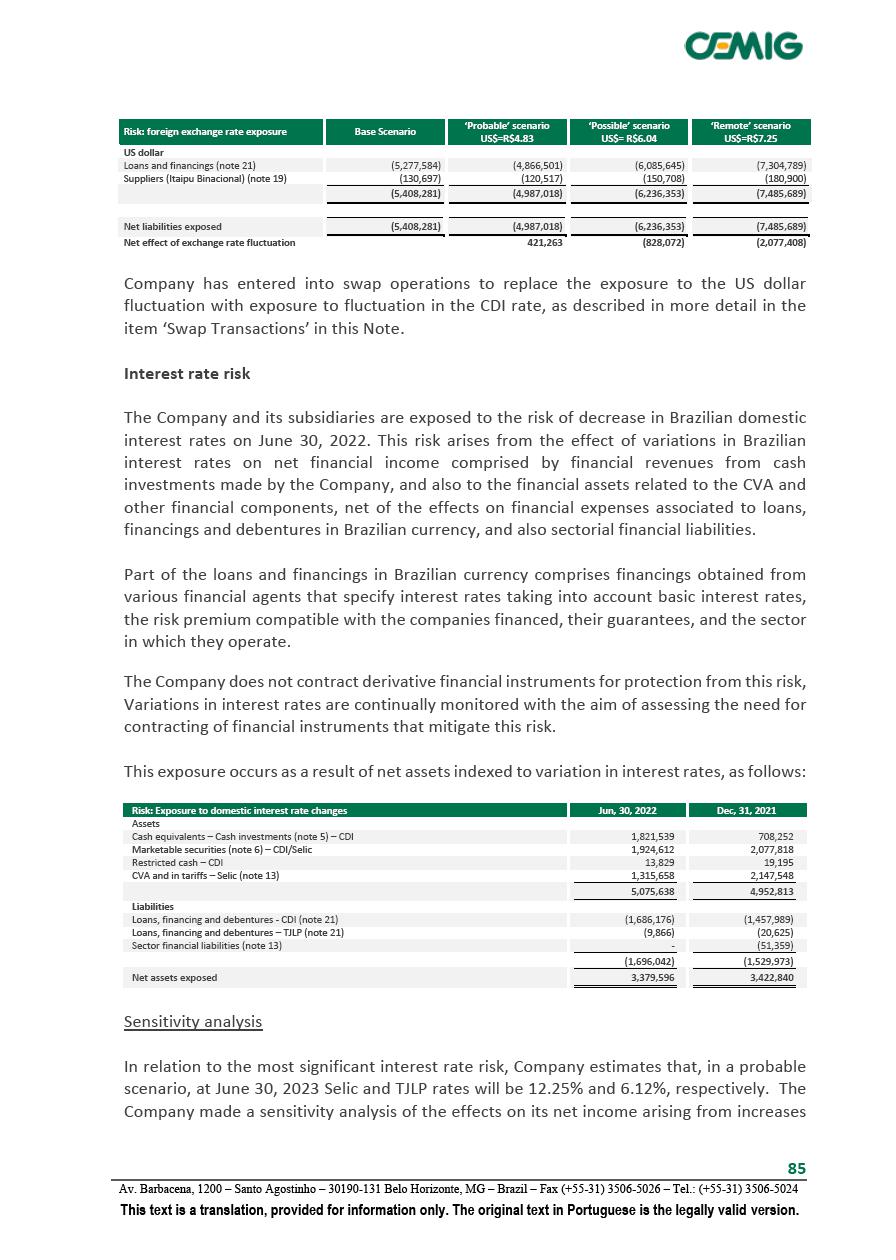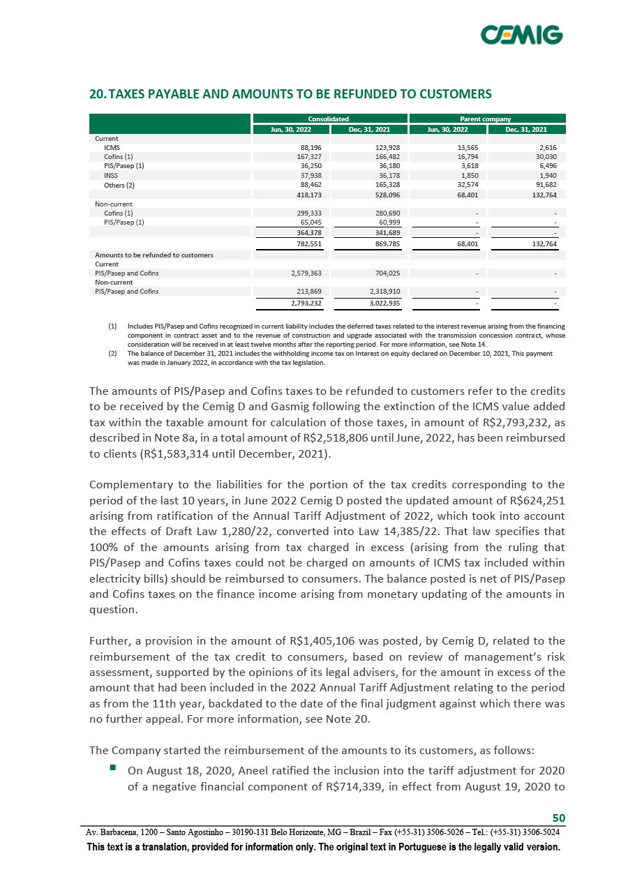 3. It is also worth noting that the 2021 Financial Statements (“DF”) were published and are available to anyone who may be interested on the Company’s website, as well as on the website of this Agency, with the following information: “At the end of 2020, the Company began internal procedures for the investigation of allegations received by the Prosecution Office of the Minas Gerais State (MPMG), through Official Letters, the content of which basically refers to alleged irregularities in public bidding purchasing processes. The investigation is being conducted by a New Investigation Committee, with support from specialized advisors. The independent internal investigation started in 2020 has been concluded and the final report has been delivered to and approved by the Investigation Committee on November 24, 2021, and no matters that could significantly impact the financial statements for December 31, 2021, or the financial statements for previous years have been identified. However, the Company is awaiting the outcome of the ongoing investigations by the MPMG and comments from Brazilian and international authorities, to which the reports were presented, to confirm whether any additional procedure will be necessary. The Company will evaluate any changes in the future scenario and eventual impacts that could affect the financial statements, when applicable. The Company continues to cooperate with Brazilian and foreign authorities in their analysis related to the ongoing investigations.”