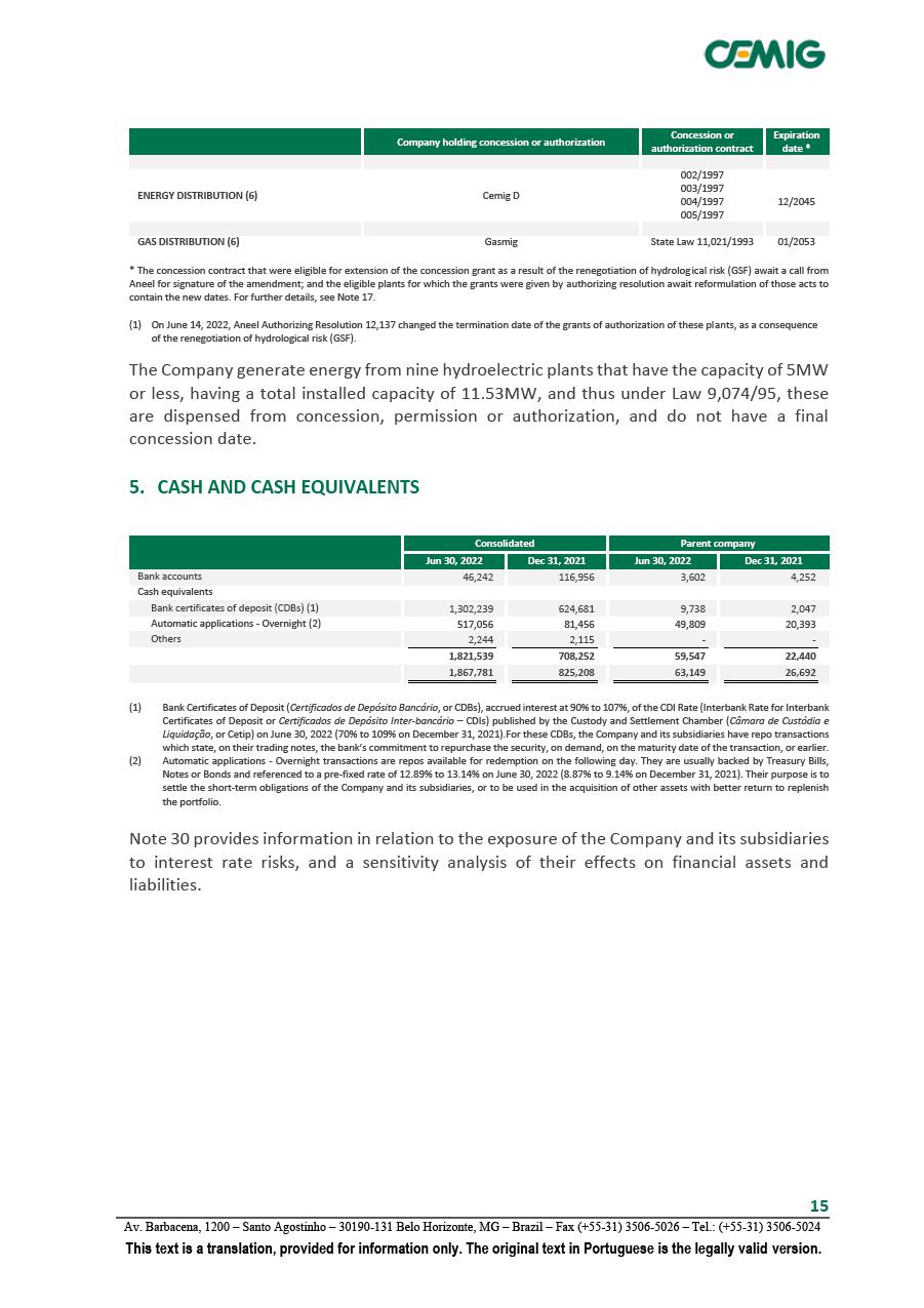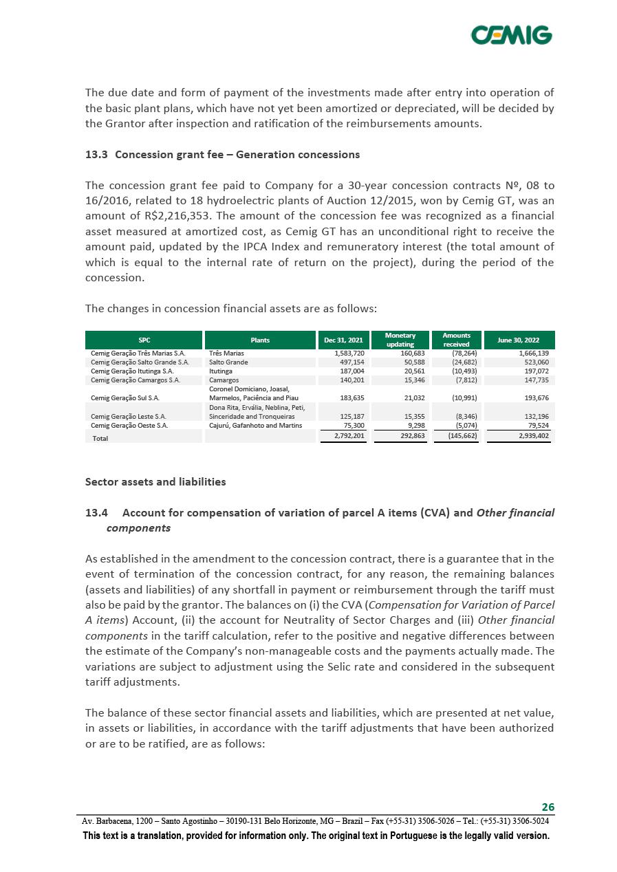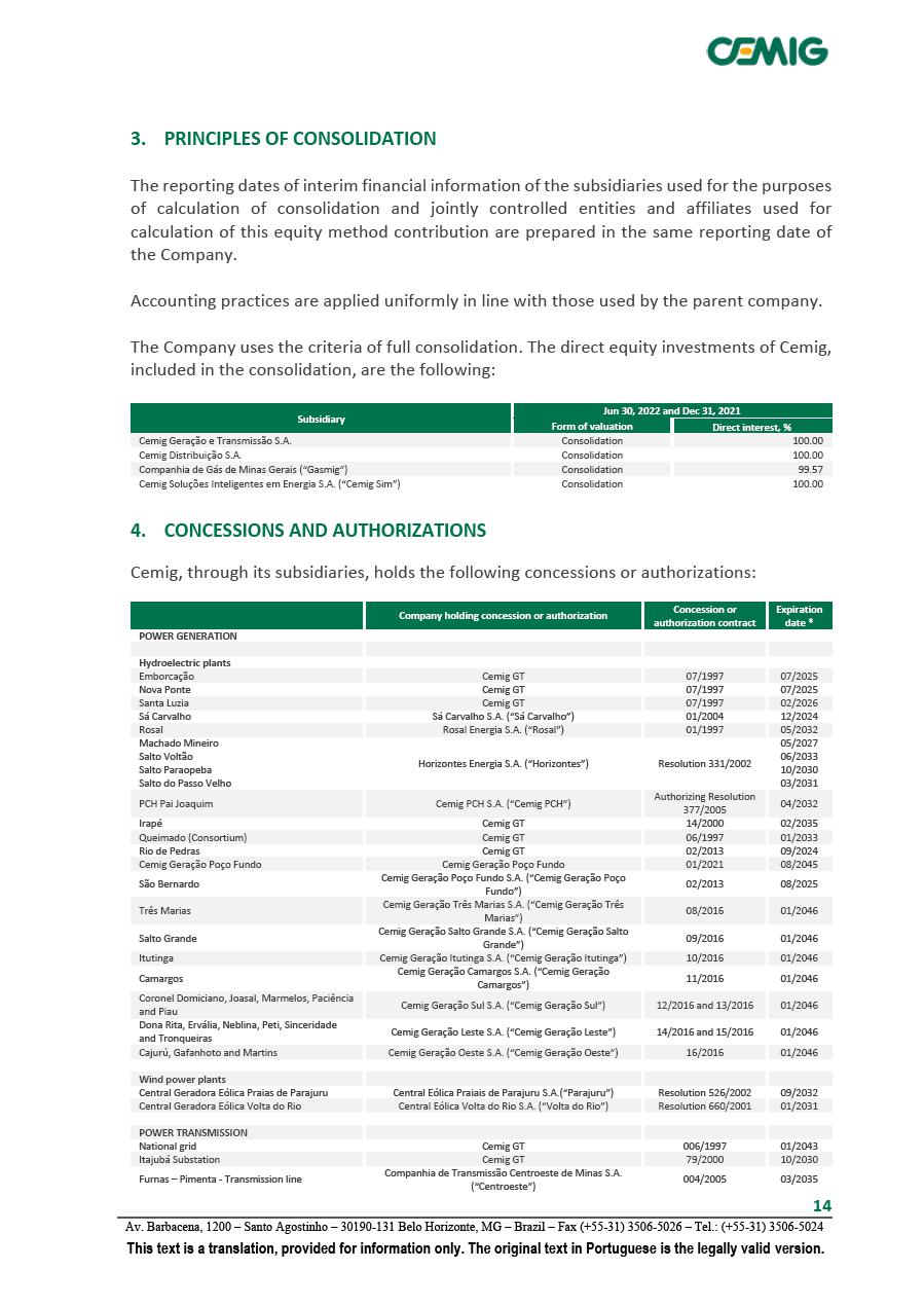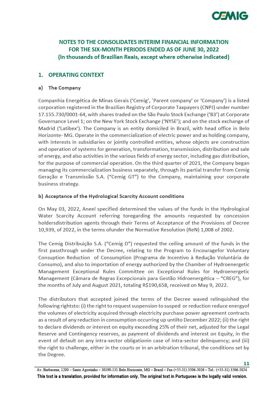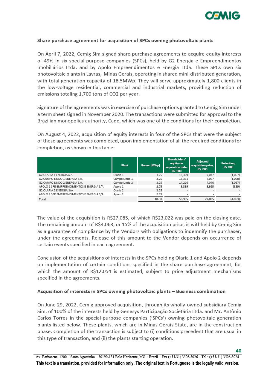 COMPANHIA ENERGÉTICA DE MINAS GERAIS – CEMIG (“CEMIG” or “Company”), a publicly held company with shares traded on the stock exchanges of São Paulo, New York, and Madrid, and CEMIG GERAÇÃO E TRANSMISSÃO S.A. (“Cemig GT”), a publicly held company and a wholly-owned subsidiary of CEMIG, hereby inform the Brazilian Securities and Exchange Commission (CVM), B3 S.A. – Brasil, Bolsa, Balcão (“B3”), and the market in general that Cemig Geração Poço Fundo, a wholly-owned subsidiary of Cemig GT and owner of the Poço Fundo SHPP (“SHPP”), was granted authorization by the National Electric Energy Agency (“ANEEL”) to start operations of the Generating Units #1 (“UG-01”) and #2 (“UG-02”) on September 29, 2022, and October 1, 2022, respectively.
