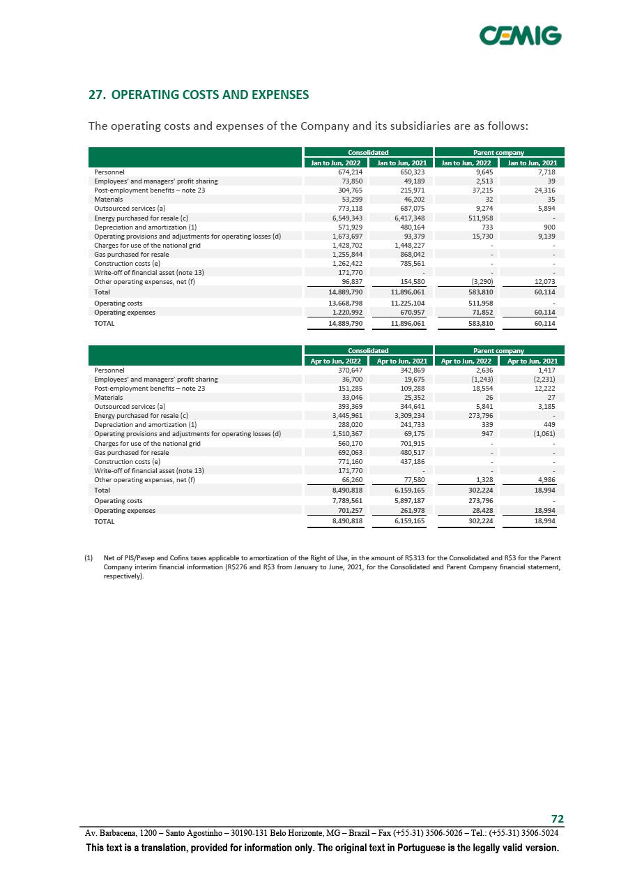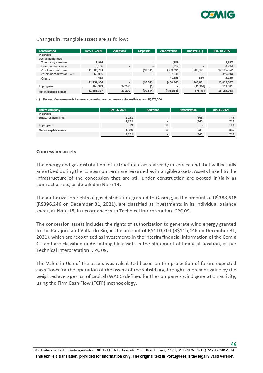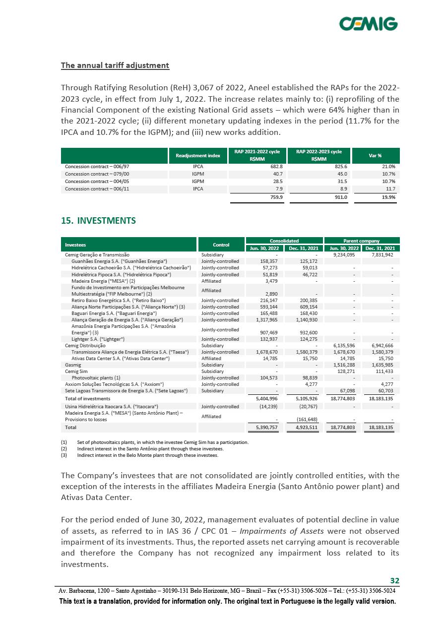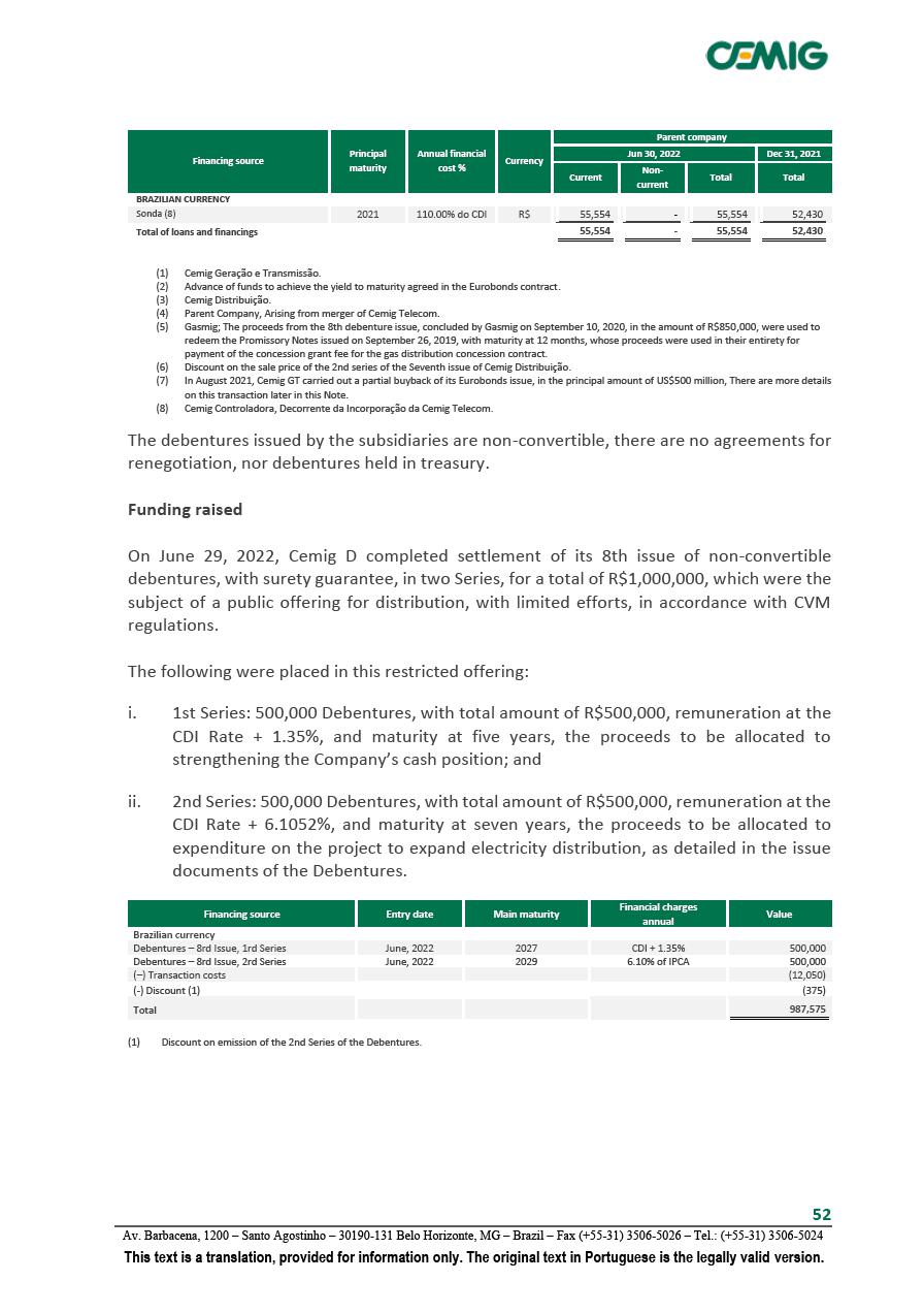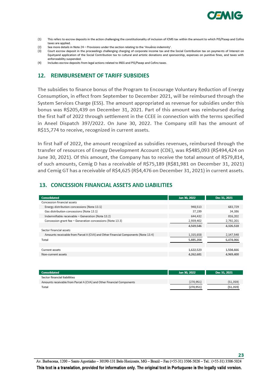 COMPANHIA ENERGÉTICA DE MINAS GERAIS – CEMIG (“CEMIG” or “Company”), a publicly held company with shares traded on the stock exchanges of São Paulo, New York, and Madrid, and CEMIG GERAÇÃO E TRANSMISSÃO S.A. (“Cemig GT”), a publicly held company and a wholly-owned subsidiary of CEMIG, hereby inform the Brazilian Securities and Exchange Commission (CVM), B3 S.A. – Brasil, Bolsa, Balcão (“B3”), and the market in general that Cemig Geração Poço Fundo, a wholly-owned subsidiary of Cemig GT and owner of the Poço Fundo SHPP (“SHPP”), was granted authorization by the National Electric Energy Agency (“ANEEL”) to start operations of the Generating Units #1 (“UG-01”) and #2 (“UG-02”) on September 29, 2022, and October 1, 2022, respectively.
