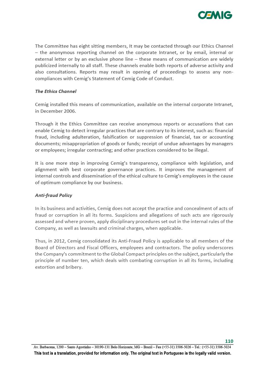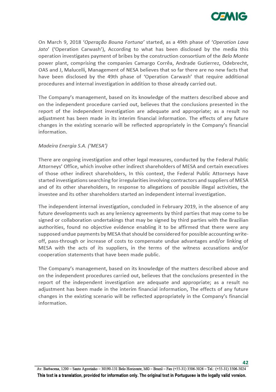 4. Since the beginning, CEMIG undertook to cooperate with the MPMG, made such information available on the Financial Statements, and provided the U.S. authorities (DoJ and SEC) with the same information about the investigation that was sent to this Agency.