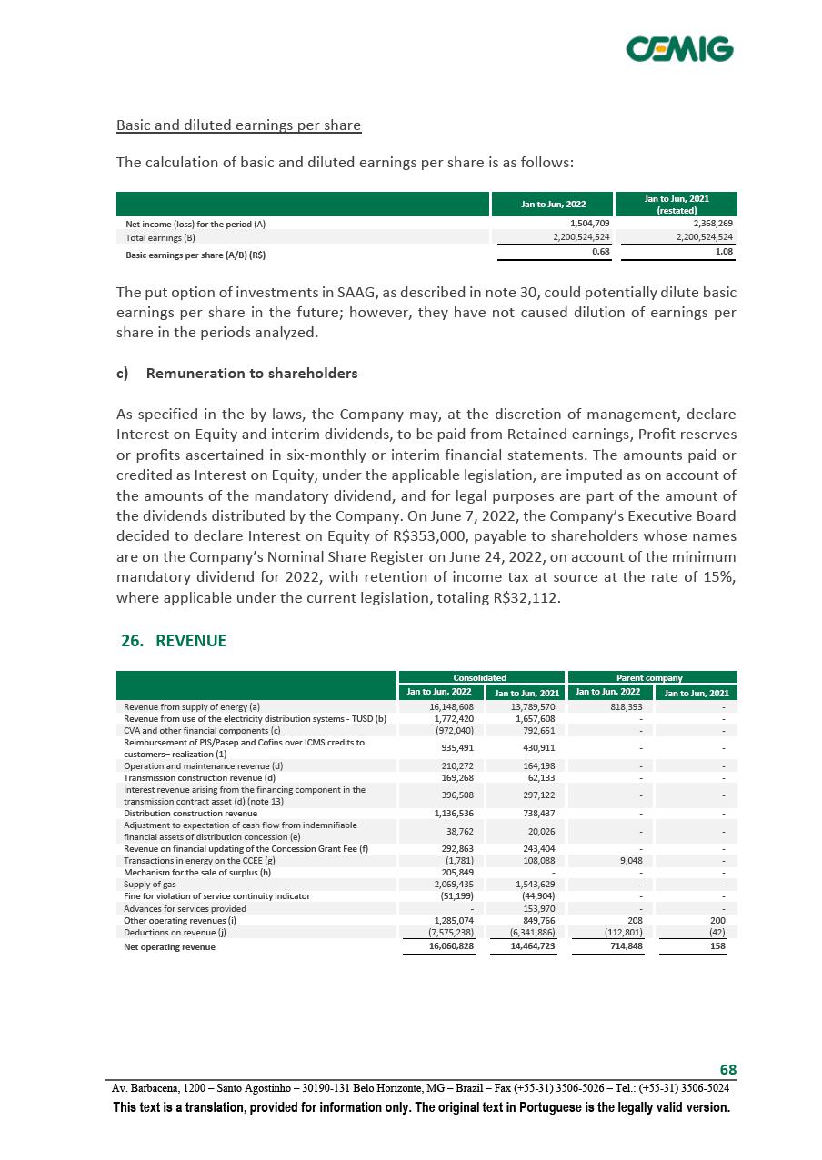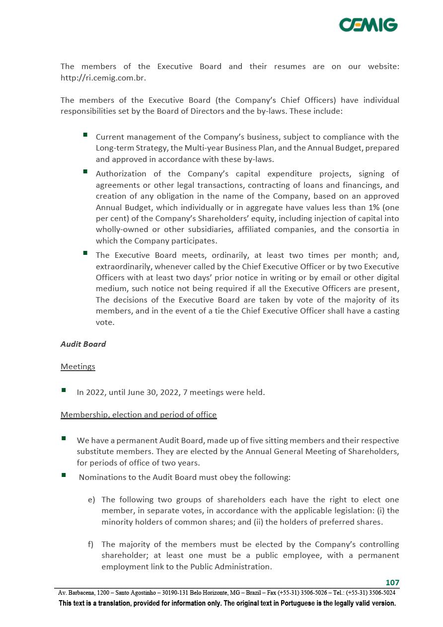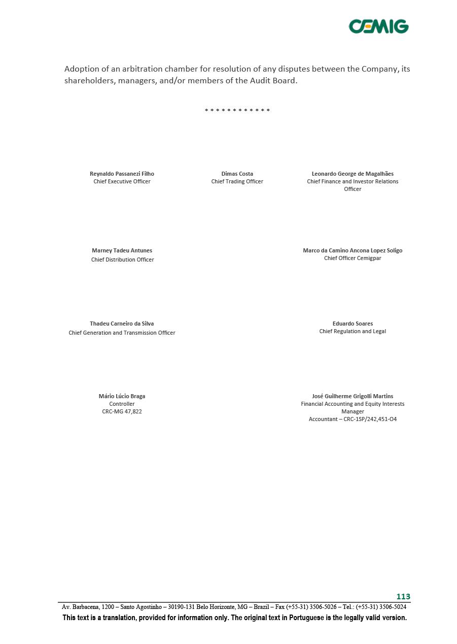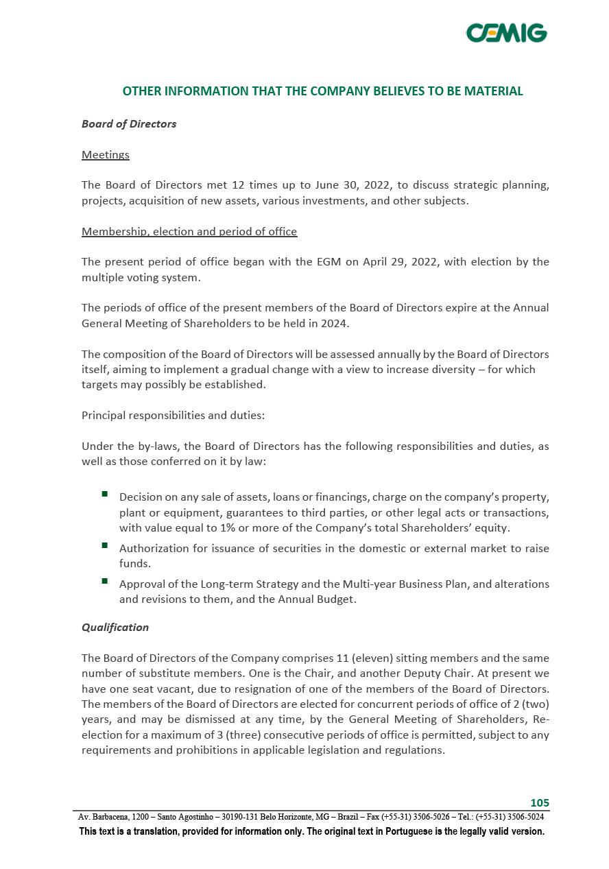 Shareholders willing to be represented at said Shareholders’ Meeting shall comply with article 126 of Law 6,404/1976 and Paragraph 2 of Article 10 of the Company’s Bylaws, by sending their proof of ownership of Company shares issued by a depositary financial institution and the proxy appointment with special powers by email to ri@cemig.com.br, by September 26, 2022.
