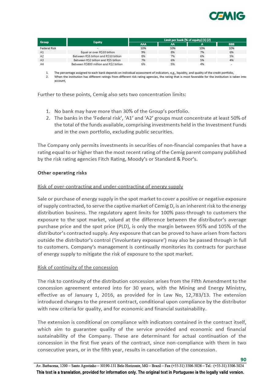 This report contains statements about expected future events and financial results that are forward-looking and subject to risks and uncertainties. Actual results could differ materially from those predicted in such forward-looking statements. Factors which may cause actual results to differ materially from those discussed herein include those risk factors set forth in our most recent Annual Report on Form 20-F filed with the Securities and Exchange Commission. CEMIG undertakes no obligation to revise these forward-looking statements to reflect events or circumstances after the date hereof, and claims the protection of the safe harbor for forward-looking statements contained in the Private Securities Litigation Reform Act of 1995.