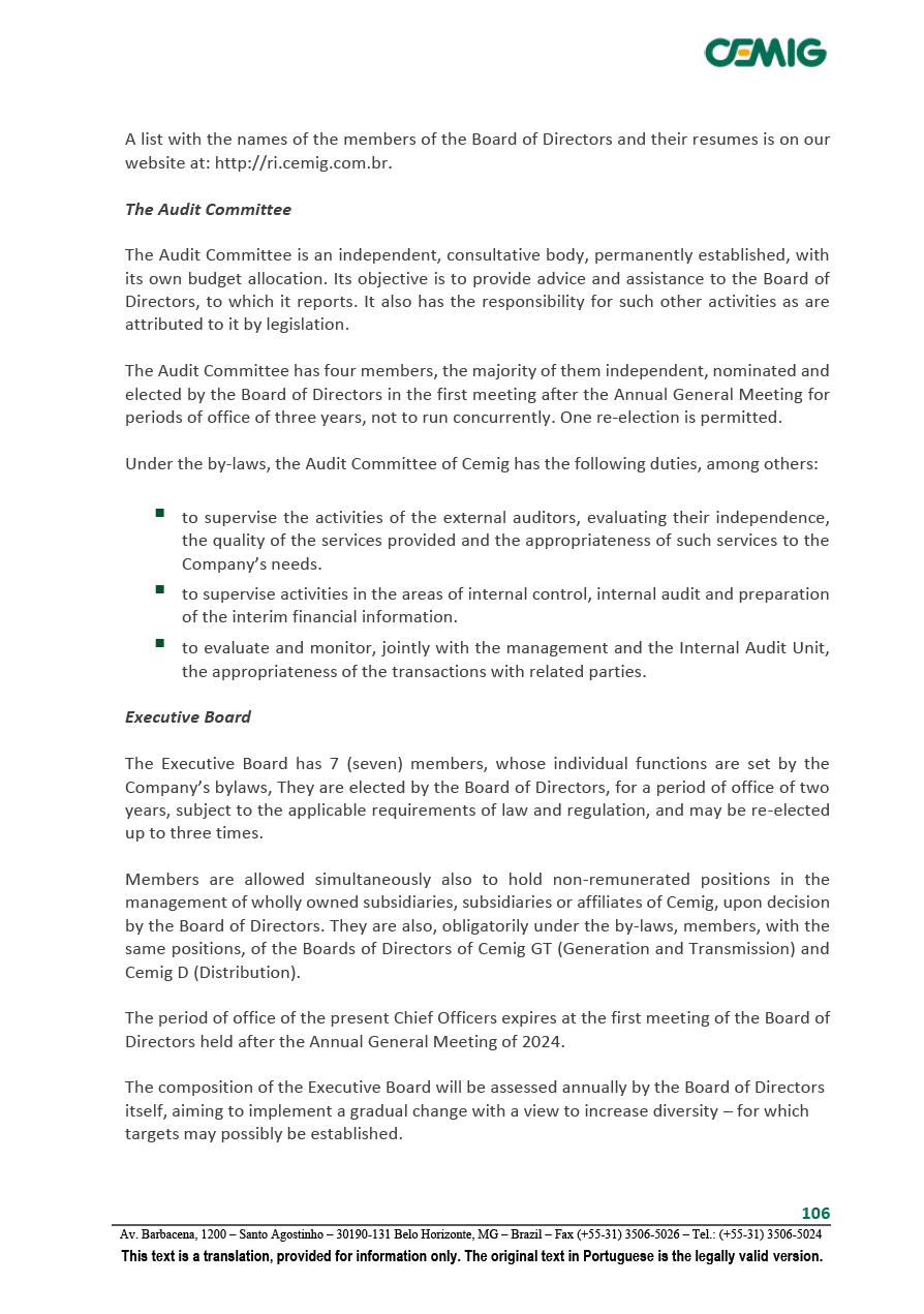 | (ii) | recomposition of the Fiscal Council in light of the resignation of an alternate board member appointed by the majority shareholder Minas Gerais State Government; and |