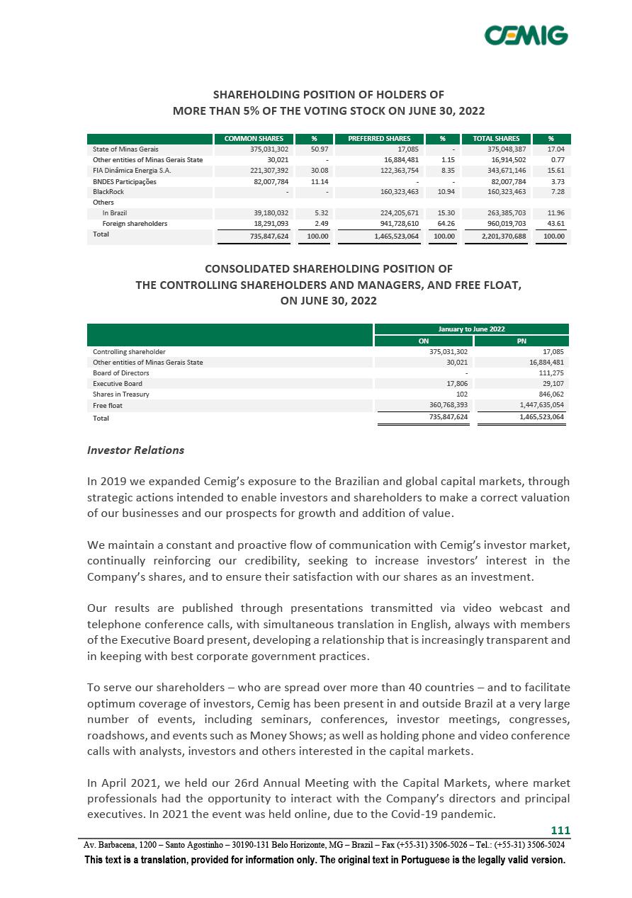 COMPANHIA ENERGÉTICA DE MINAS GERAIS – CEMIG (“CEMIG” or “Company”), in compliance with article 12 of CVM Resolution 44/2021, of August 23, 2021, hereby announces that it received a letter from BlackRock, Inc (“BlackRock”), headquartered at 55 East 52nd Street, in the city and state of New York, 10022-0002, United States, stating that, as of August 31, 2022, its equity interests account, in the aggregate, for 9.913% of the Company's total capital, being 128,841,722 preferred shares and 89,370,659 ADRs representing 89,370,659 preferred shares, totaling 218,212,381 preferred shares representing approximately 14.890% of the Company’s total preferred shares and 7,694,036 derivative financial instruments referenced to preferred shares with financial settlement, corresponding for approximately 0.525% of the Company’s total preferred shares.