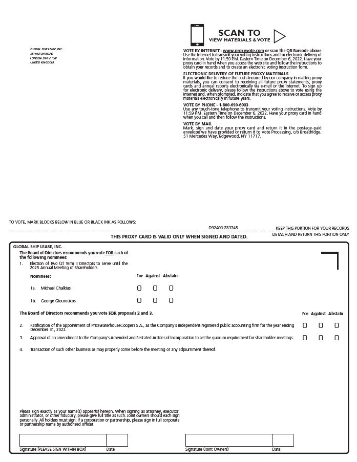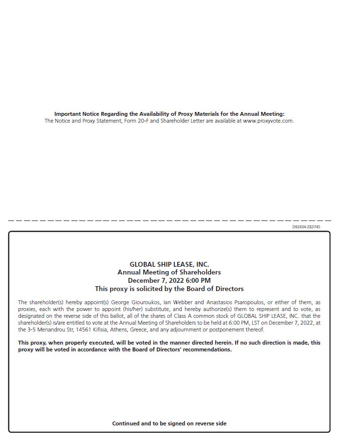 Exhibit 99.1 is a copy of the letter to shareholders, notice, proxy statement and proxy card of Global Ship Lease, Inc. (the “Company”)