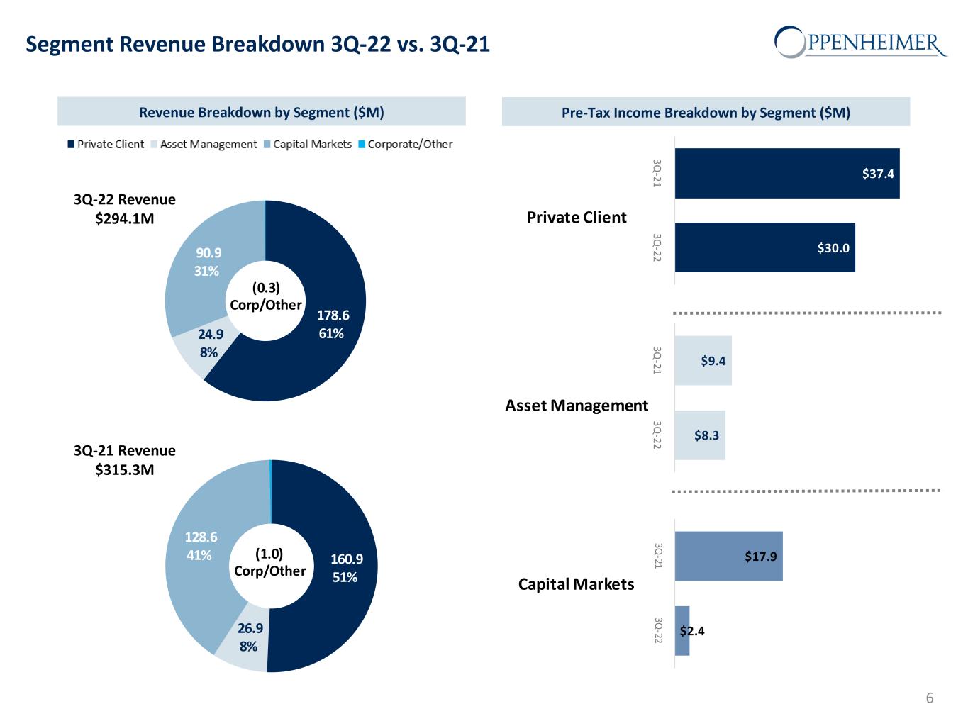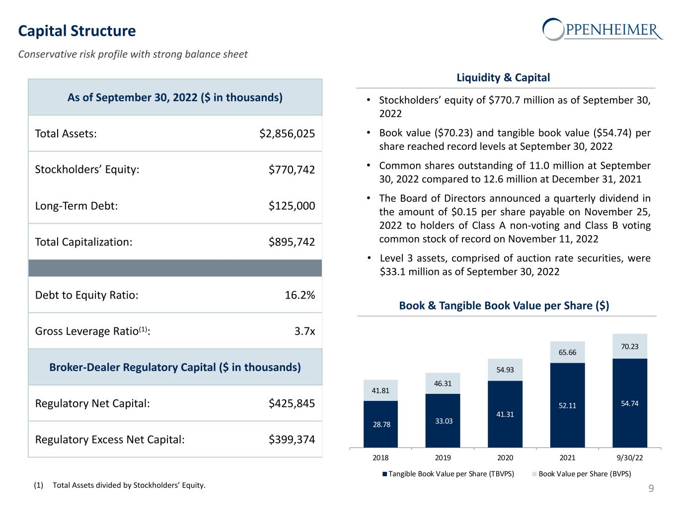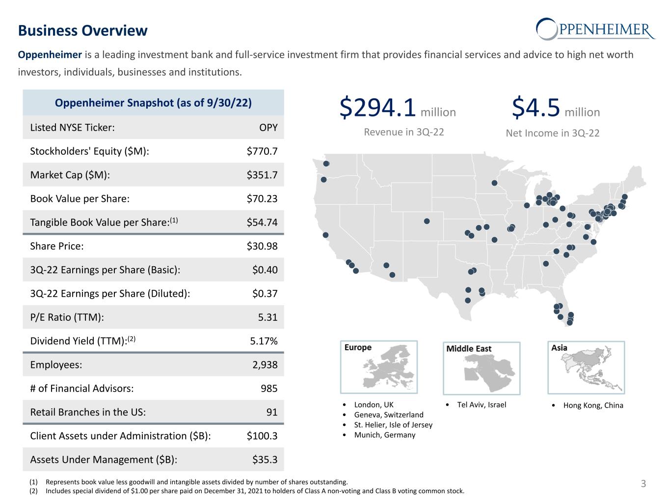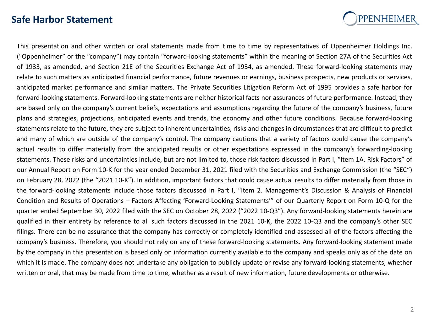 Safe Harbor Statement This presentation and other written or oral statements made from time to time by representatives of Oppenheimer Holdings Inc. ("Oppenheimer” or the “company”) may contain “forward-looking statements” within the meaning of Section 27A of the Securities Act of 1933, as amended, and Section 21E of the Securities Exchange Act of 1934, as amended. These forward-looking statements may relate to such matters as anticipated financial performance, future revenues or earnings, business prospects, new products or services, anticipated market performance and similar matters. The Private Securities Litigation Reform Act of 1995 provides a safe harbor for forward-looking statements. Forward-looking statements are neither historical facts nor assurances of future performance. Instead, they are based only on the company’s current beliefs, expectations and assumptions regarding the future of the company’s business, future plans and strategies, projections, anticipated events and trends, the economy and other future conditions. Because forward-looking statements relate to the future, they are subject to inherent uncertainties, risks and changes in circumstances that are difficult to predict and many of which are outside of the company’s control. The company cautions that a variety of factors could cause the company’s actual results to differ materially from the anticipated results or other expectations expressed in the company’s forwarding-looking statements. These risks and uncertainties include, but are not limited to, those risk factors discussed in Part I, “Item 1A. Risk Factors” of our Annual Report on Form 10-K for the year ended December 31, 2021 filed with the Securities and Exchange Commission (the “SEC”) on February 28, 2022 (the “2021 10-K”). In addition, important factors that could cause actual results to differ materially from those in the forward-looking statements include those factors discussed in Part I, “Item 2. Management’s Discussion & Analysis of Financial Condition and Results of Operations – Factors Affecting ‘Forward-Looking Statements’” of our Quarterly Report on Form 10-Q for the quarter ended September 30, 2022 filed with the SEC on October 28, 2022 (“2022 10-Q3”). Any forward-looking statements herein are qualified in their entirety by reference to all such factors discussed in the 2021 10-K, the 2022 10-Q3 and the company’s other SEC filings. There can be no assurance that the company has correctly or completely identified and assessed all of the factors affecting the company’s business. Therefore, you should not rely on any of these forward-looking statements. Any forward-looking statement made by the company in this presentation is based only on information currently available to the company and speaks only as of the date on which it is made. The company does not undertake any obligation to publicly update or revise any forward-looking statements, whether written or oral, that may be made from time to time, whether as a result of new information, future developments or otherwise. 2