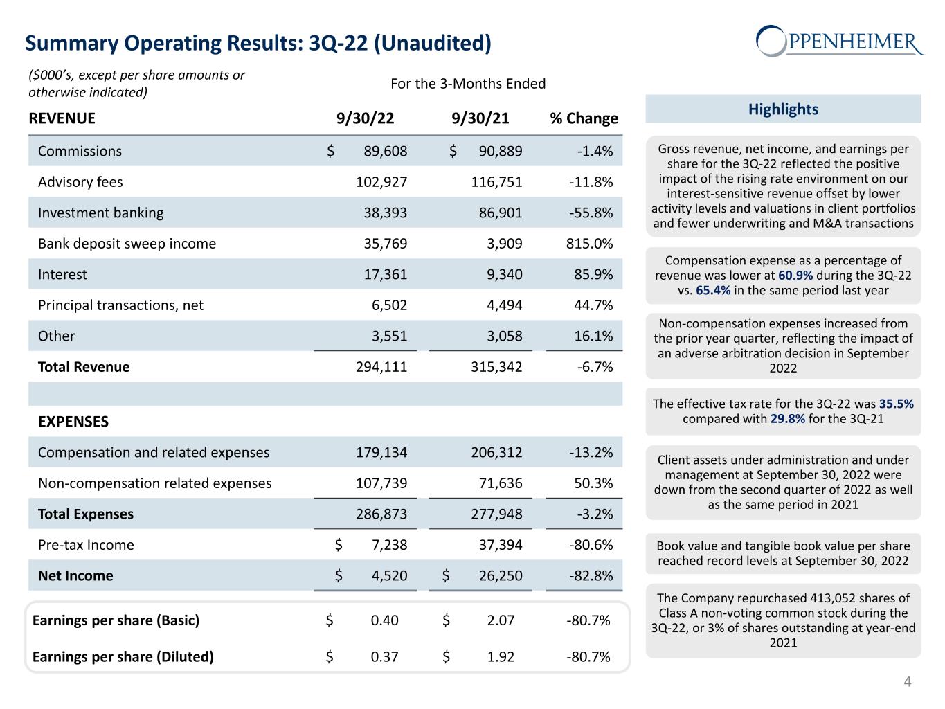 Oppenheimer is a leading investment bank and full-service investment firm that provides financial services and advice to high net worth investors, individuals, businesses and institutions. 3 • Hong Kong, China• London, UK • Geneva, Switzerland • St. Helier, Isle of Jersey • Munich, Germany • Tel Aviv, Israel (1) Represents book value less goodwill and intangible assets divided by number of shares outstanding. (2) Includes special dividend of $1.00 per share paid on December 31, 2021 to holders of Class A non-voting and Class B voting common stock. $4.5 million Net Income in 3Q-22 $294.1 million Revenue in 3Q-22 Business Overview Oppenheimer Snapshot (as of 9/30/22) Listed NYSE Ticker: OPY Stockholders' Equity ($M): $770.7 Market Cap ($M): $351.7 Book Value per Share: $70.23 Tangible Book Value per Share:(1) $54.74 Share Price: $30.98 3Q-22 Earnings per Share (Basic): $0.40 3Q-22 Earnings per Share (Diluted): $0.37 P/E Ratio (TTM): 5.31 Dividend Yield (TTM):(2) 5.17% Employees: 2,938 # of Financial Advisors: 985 Retail Branches in the US: 91 Client Assets under Administration ($B): $100.3 Assets Under Management ($B): $35.3