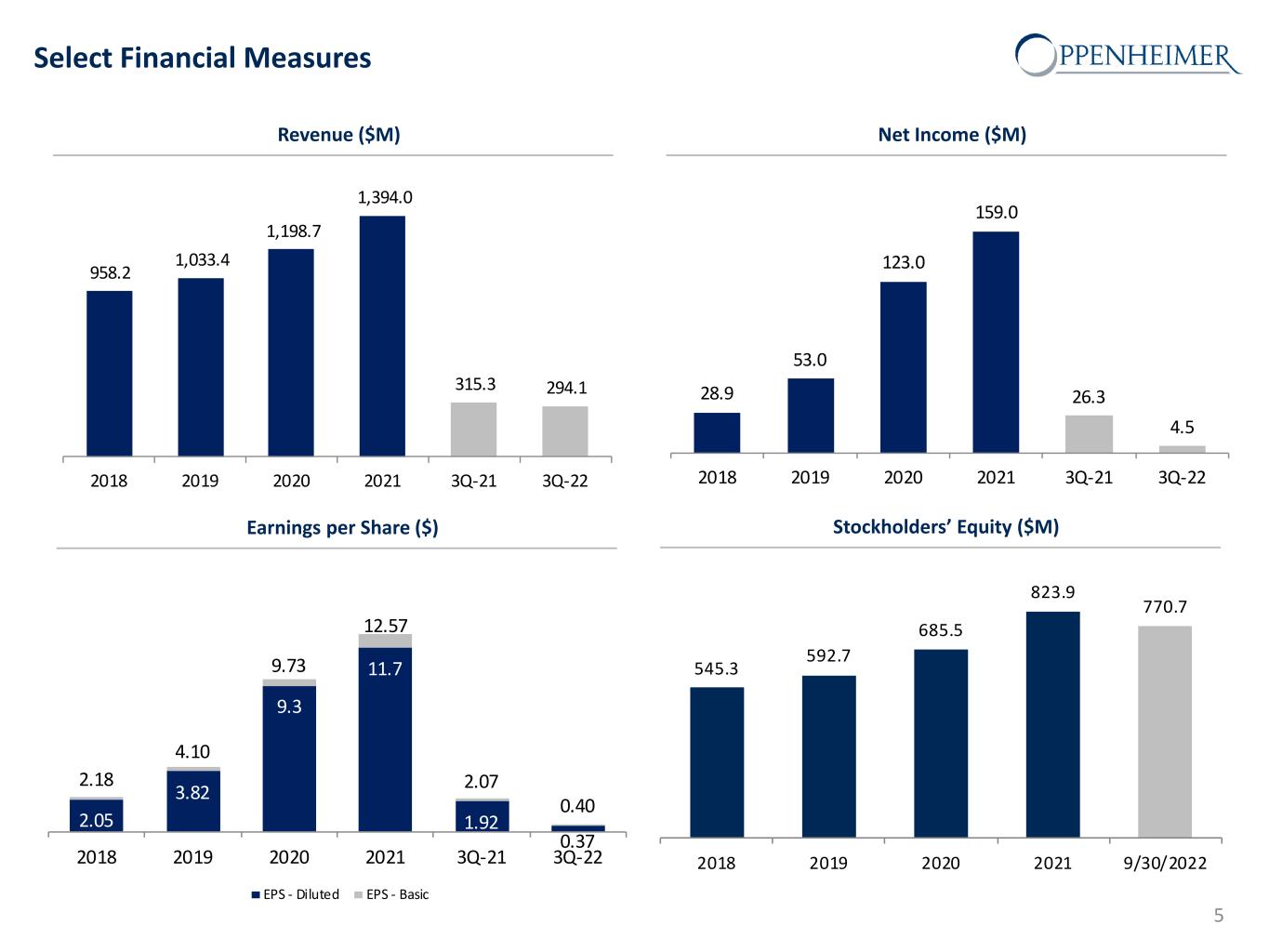 ($000’s, except per share amounts or otherwise indicated) For the 3-Months Ended REVENUE 9/30/22 9/30/21 % Change Commissions $ 89,608 $ 90,889 -1.4% Advisory fees 102,927 116,751 -11.8% Investment banking 38,393 86,901 -55.8% Bank deposit sweep income 35,769 3,909 815.0% Interest 17,361 9,340 85.9% Principal transactions, net 6,502 4,494 44.7% Other 3,551 3,058 16.1% Total Revenue 294,111 315,342 -6.7% EXPENSES Compensation and related expenses 179,134 206,312 -13.2% Non-compensation related expenses 107,739 71,636 50.3% Total Expenses 286,873 277,948 -3.2% Pre-tax Income $ 7,238 37,394 -80.6% Net Income $ 4,520 $ 26,250 -82.8% Summary Operating Results: 3Q-22 (Unaudited) Gross revenue, net income, and earnings per share for the 3Q-22 reflected the positive impact of the rising rate environment on our interest-sensitive revenue offset by lower activity levels and valuations in client portfolios and fewer underwriting and M&A transactions Compensation expense as a percentage of revenue was lower at 60.9% during the 3Q-22 vs. 65.4% in the same period last year Non-compensation expenses increased from the prior year quarter, reflecting the impact of an adverse arbitration decision in September 2022 The effective tax rate for the 3Q-22 was 35.5% compared with 29.8% for the 3Q-21 Client assets under administration and under management at September 30, 2022 were down from the second quarter of 2022 as well as the same period in 2021 Book value and tangible book value per share reached record levels at September 30, 2022 The Company repurchased 413,052 shares of Class A non-voting common stock during the 3Q-22, or 3% of shares outstanding at year-end 2021 4 Earnings per share (Basic) $ 0.40 $ 2.07 -80.7% Earnings per share (Diluted) $ 0.37 $ 1.92 -80.7% Highlights * Percentage change not meaningful.
