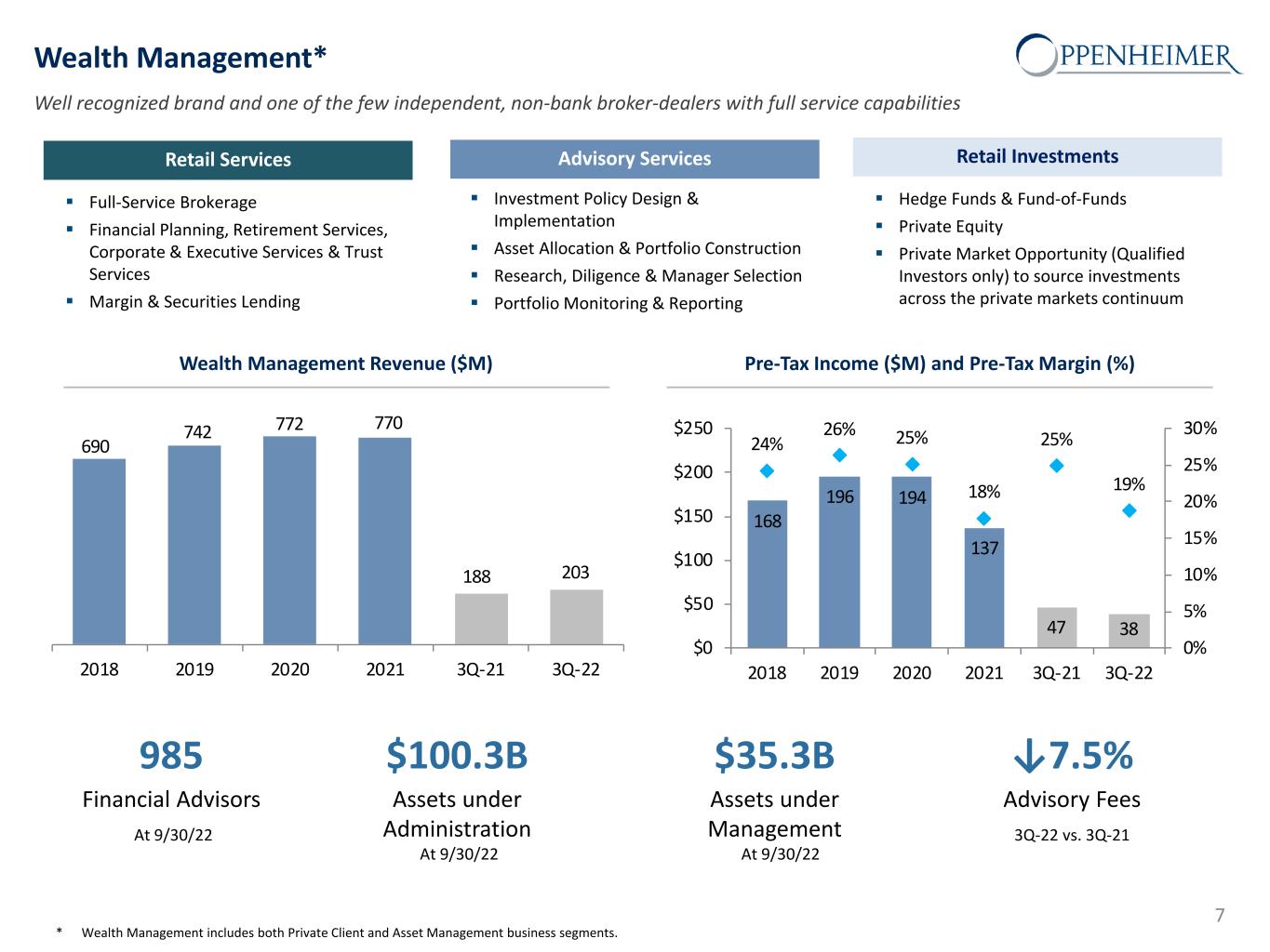 $2.4 $17.9 $(5.0) $5.0 $15.0 $25.0 $35.0 $45.0 3Q -22 3Q -21 $8.3 $9.4 $(5.0) $5.0 $15.0 $25.0 $35.0 $45.0 3Q -22 3Q -21 $30.0 $37.4 $(5.0) $5.0 $15.0 $25.0 $35.0 $45.0 3Q -22 3Q -21 Private Client Asset Management Capital Markets Segment Revenue Breakdown 3Q-22 vs. 3Q-21 6 Pre-Tax Income Breakdown by Segment ($M)Revenue Breakdown by Segment ($M) 3Q-22 Revenue $294.1M 3Q-21 Revenue $315.3M 178.6 61%24.9 8% 90.9 31% (0.3) Corp/Other 160.9 51% 26.9 8% 128.6 41% (1.0) Corp/Other