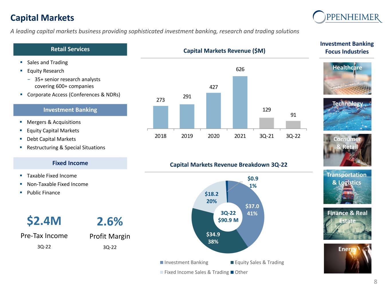 273 291 427 626 129 91 2018 2019 2020 2021 3Q-21 3Q-22 Capital Markets A leading capital markets business providing sophisticated investment banking, research and trading solutions Healthcare Technology Transportation & Logistics Finance & Real Estate Consumer & Retail Energy Capital Markets Revenue Breakdown 3Q-22 Capital Markets Revenue ($M) Investment Banking Focus Industries 8 $2.4M Pre-Tax Income 3Q-22 2.6% Profit Margin 3Q-22 Institutional Equities Sales and Trading Equity Research − 35+ senior research analysts covering 600+ companies Corporate Access (Conferences & NDRs) Investment Banking Mergers & Acquisitions Equity Capital Markets Debt Capital Markets Restructuring & Special Situations Fixed Income Taxable Fixed Income Non-Taxable Fixed Income Public Finance Retail Services $37.0 41% $34.9 38% $18.2 20% $0.9 1% Investment Banking Equity Sales & Trading Fixed Income Sales & Trading Other 3Q-22 $90.9 M
