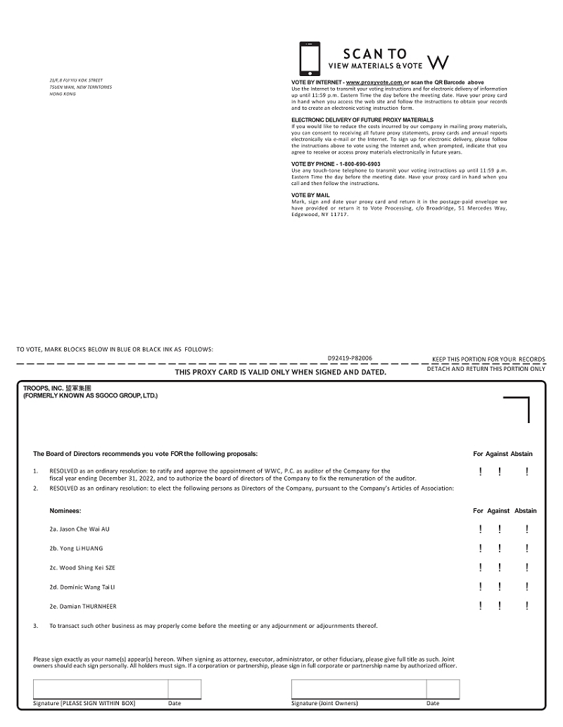 | 99.1 | Notice of TROOPS, Inc.’s 2022 Annual General Meeting of Shareholders |