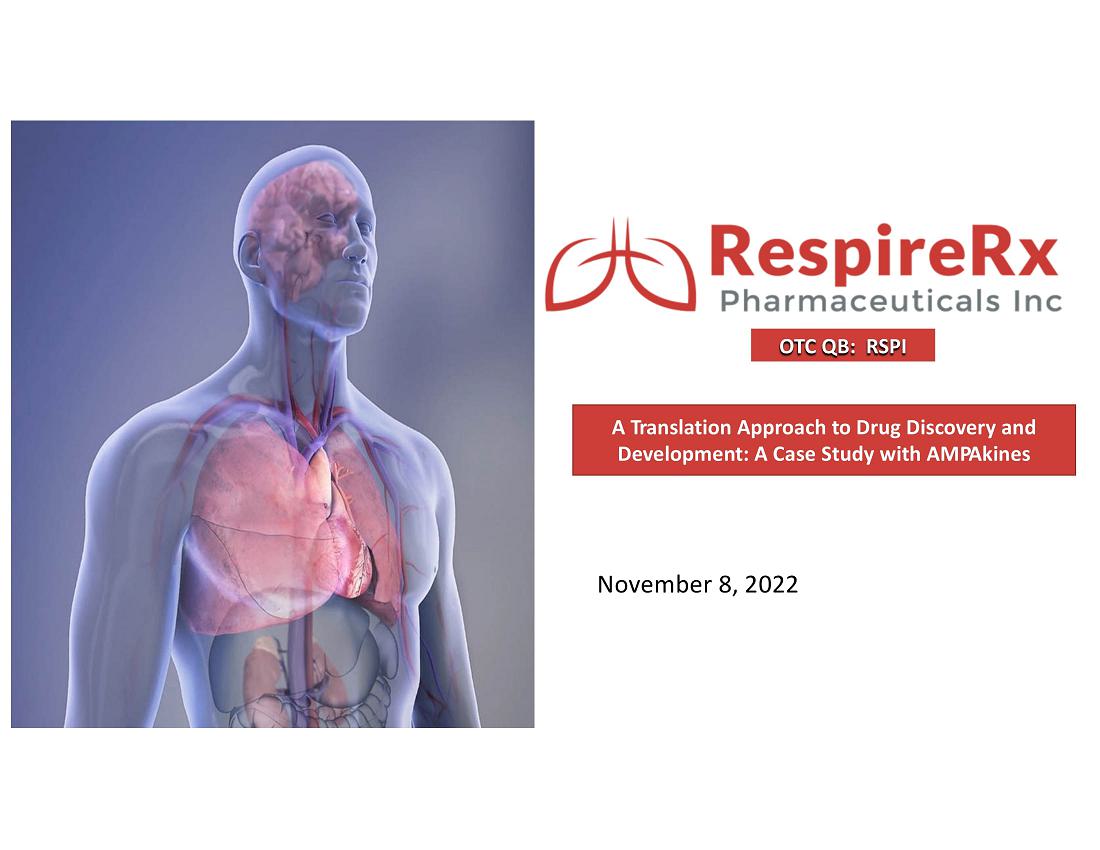 Glen Rock, N.J., November 7, 2022 /Globe Newswire – RespireRx Pharmaceuticals Inc. (OTCQ:RSPI) (“RespireRx” or the “Company”), a leader in the discovery and development of innovative and revolutionary treatments to combat diseases caused by disruption of neuronal signaling, is pleased to announce that Dr. Arnold Lippa, Chief Scientific Officer, Executive Chairman of the Board and Interim President and Interim Chief Executive Officer is an invited speaker and panel moderator at the 5th Meridian Drug Discovery Summit, being held November 7th and 8th at the Embassy Suites by Hilton Logan Airport, Boston MA. Dr. Lippa will give his talk, entitled “Translational Approaches to Drug Discovery and Development: A Case Study with AMPAkines,” on November 8 at 12:30 pm, to be followed at 2:30 pm by his panel discussion entitled “Achieving Drug Discovery Diversity Through Actionable Steps.” A copy of the slides from Dr. Lippa’s presentation may be found on our website.
