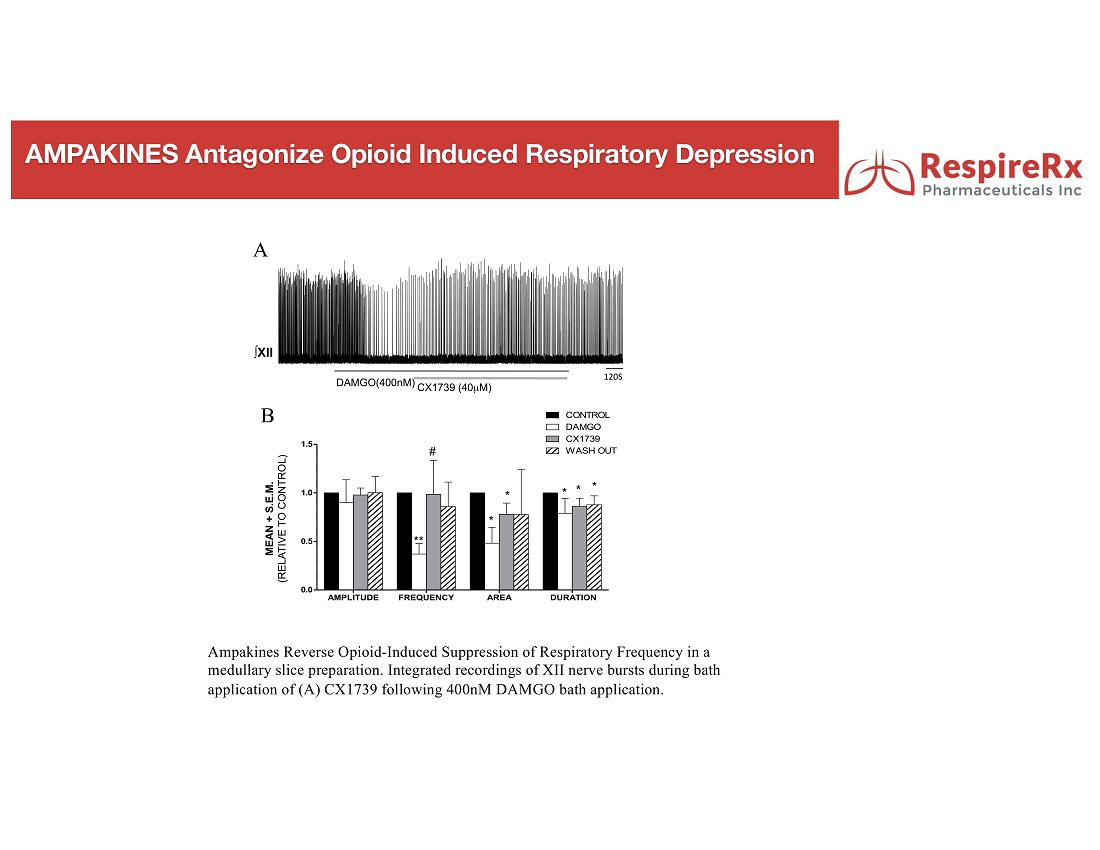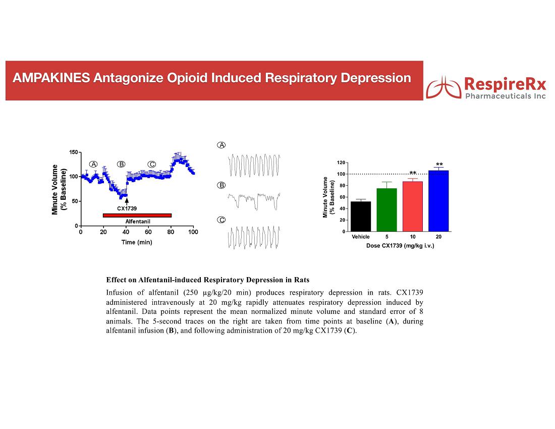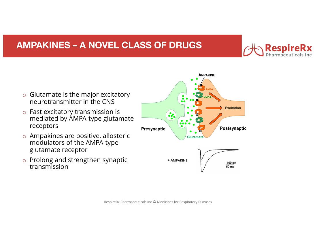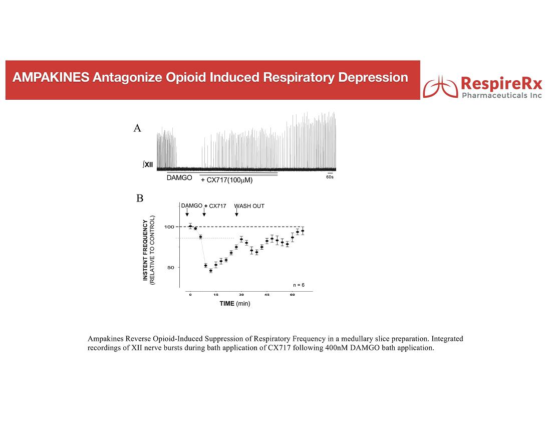 In a series of important studies funded by grants from the National Institutes of Health and published in a number of peer reviewed articles, Dr. David Fuller (University of Florida), a long-time RespireRx collaborator, has demonstrated the ability of CX1739 and CX717, the Company’s lead AMPAkines, to improve motor nerve activity and muscle function in animal models of spinal cord injury (SCI).