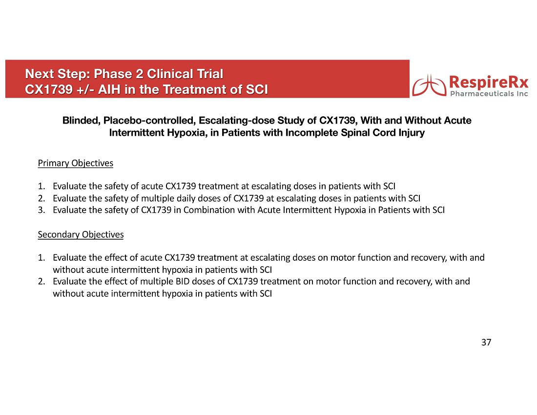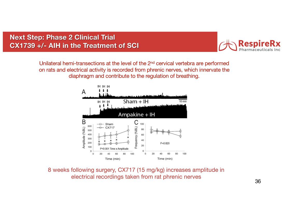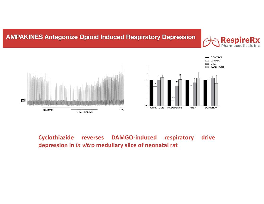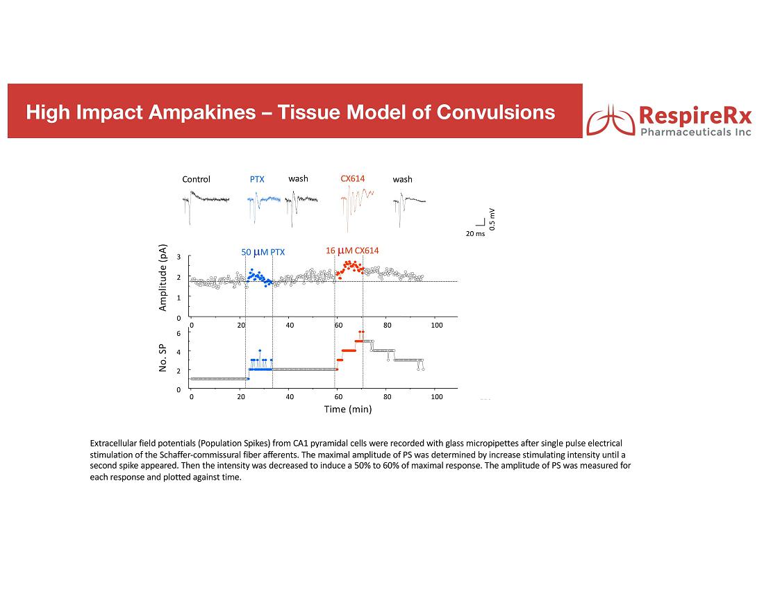 In a series of important studies funded by grants from the National Institutes of Health and published in a number of peer reviewed articles, Dr. David Fuller (University of Florida), a long-time RespireRx collaborator, has demonstrated the ability of CX1739 and CX717, the Company’s lead AMPAkines, to improve motor nerve activity and muscle function in animal models of spinal cord injury (SCI).