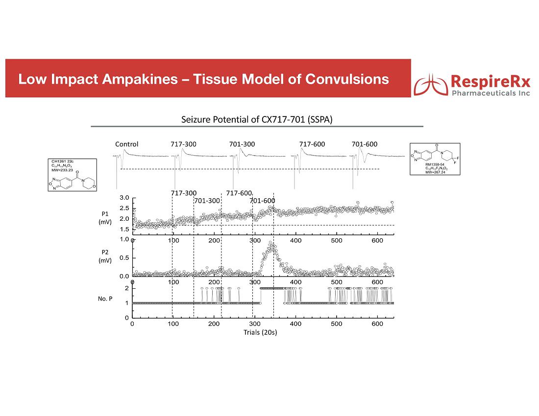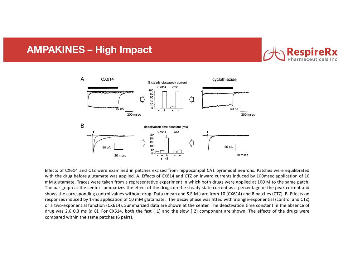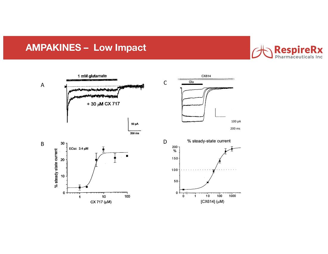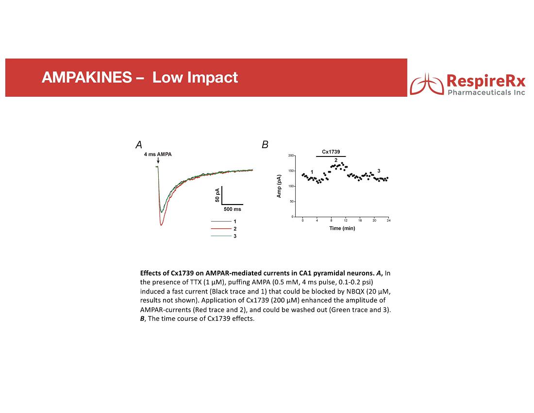AMPAkines. Through an extensive translational research effort from the cellular level through Phase 2 clinical trials, the Company has developed a family of novel, low impact AMPAkines, including CX717, CX1739 and CX1942 that may have clinical application in the treatment of CNS-driven neurobehavioral and cognitive disorders, spinal cord injury, neurological diseases, and certain orphan indications. Our lead clinical compounds, CX717 and CX1739, have successfully completed multiple Phase 1 safety trials. Both compounds have also completed Phase 2 proof of concept trials demonstrating target engagement, by antagonizing the ability of opioids to induce respiratory depression.