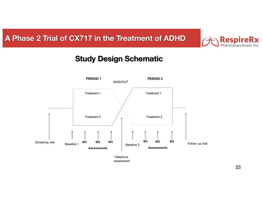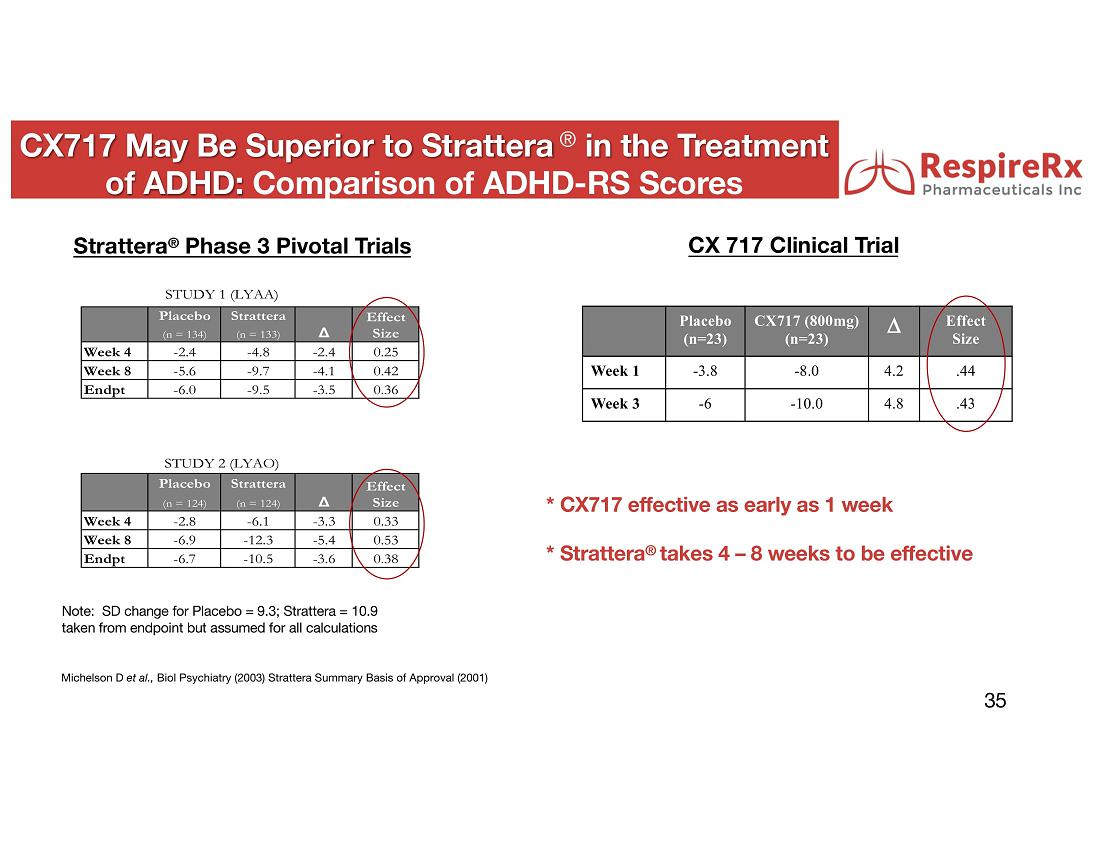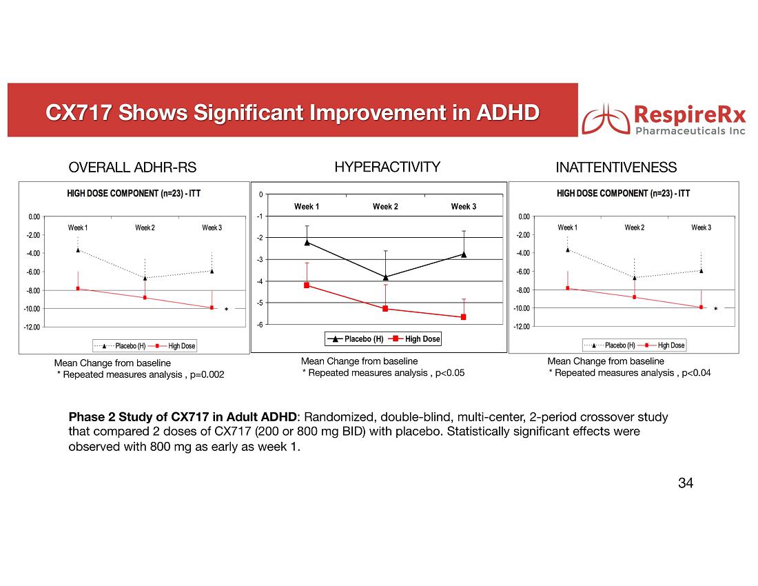 AMPAkines have demonstrated positive activity in animal models of ADHD, results that have been extended translationally into statistically significant improvement of symptoms observed in a Phase 2 human clinical trial of CX717 in adult patients with ADHD. Statistically significant therapeutic effects were observed within one week. We believe AMPAkines may represent a novel, non-stimulant treatment for ADHD with a more rapid onset of action than alternative non-stimulants, such as Straterra® (atomoxetine), and without the drawbacks of amphetamine-type stimulants.