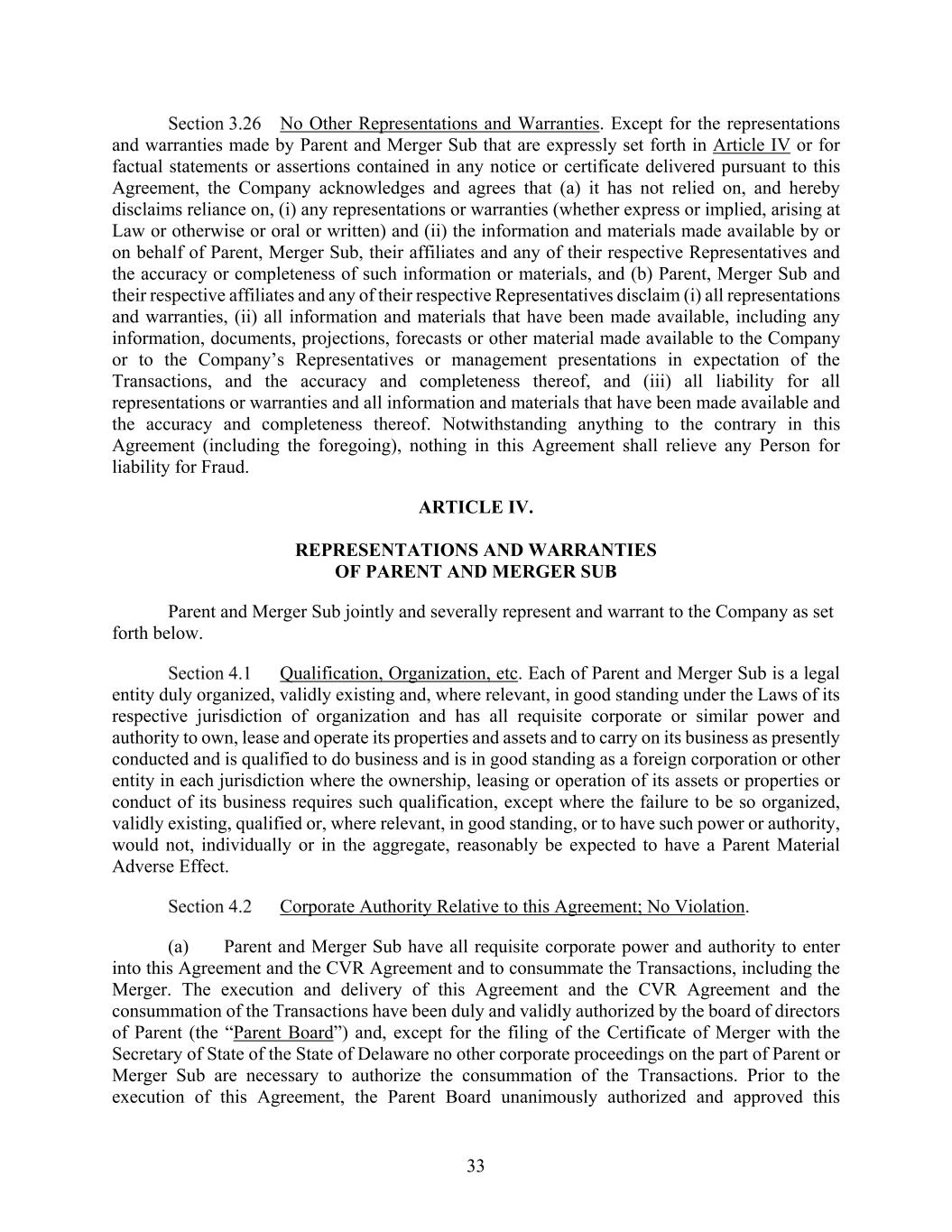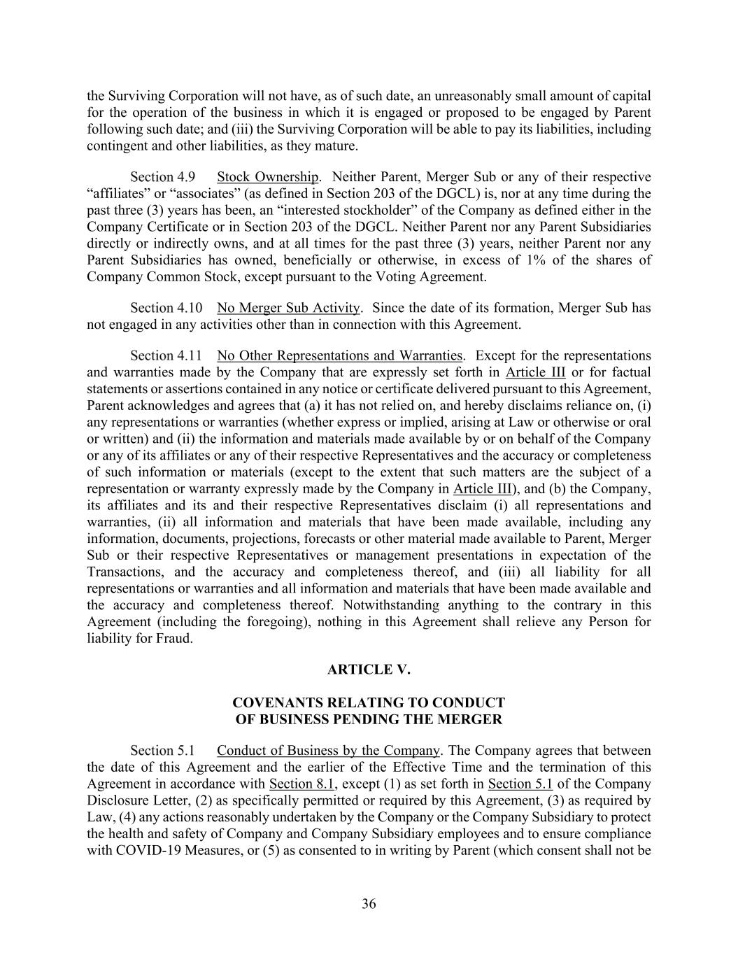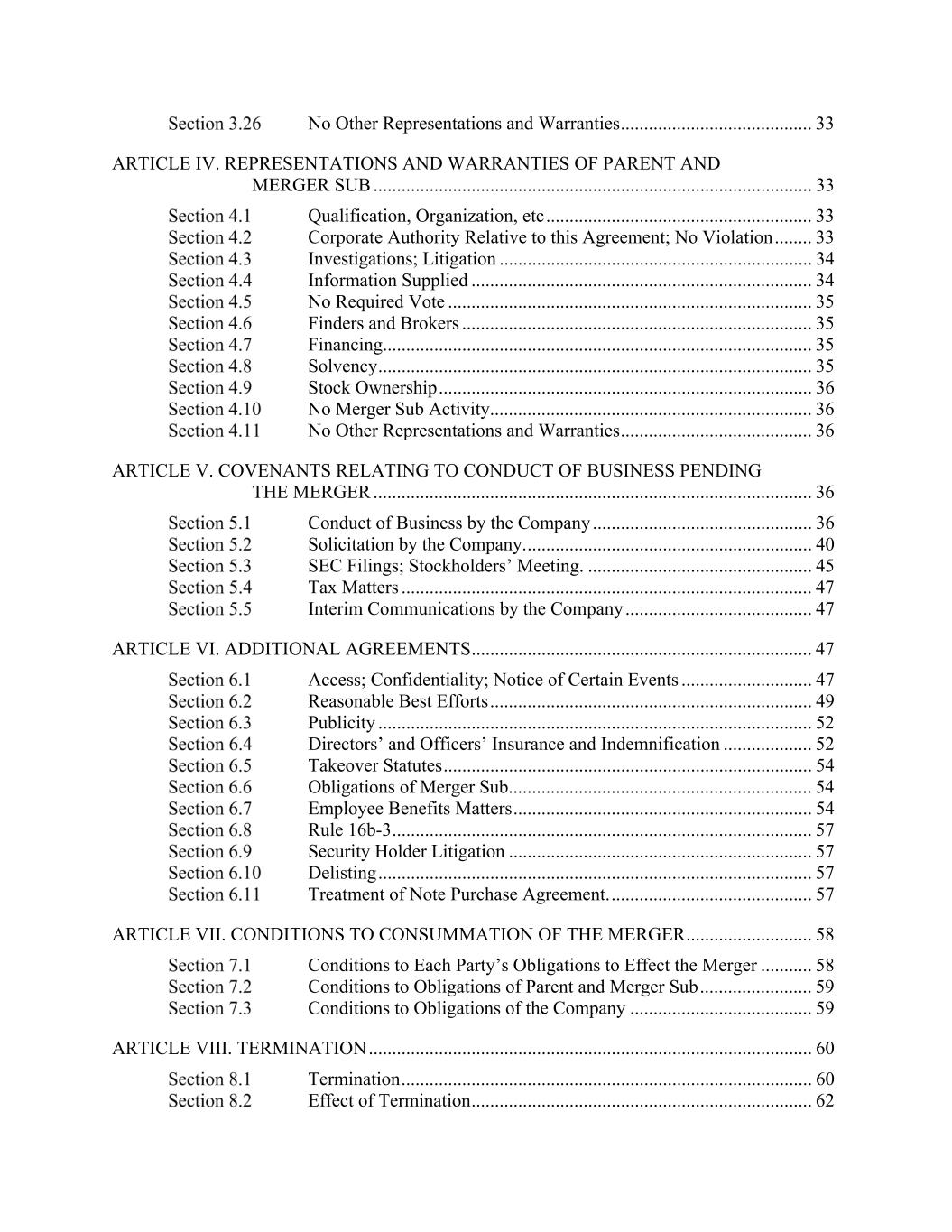No Other Representations and Warranties ......................................... 33 ARTICLE IV. REPRESENTATIONS AND WARRANTIES OF PARENT AND MERGER SUB .............................................................................................. 33 Qualification, Organization, etc ......................................................... 33 Corporate Authority Relative to this Agreement; No Violation ........ 33 Investigations; Litigation ................................................................... 34 Information Supplied ......................................................................... 34 No Required Vote .............................................................................. 35 Finders and Brokers ........................................................................... 35 Financing............................................................................................ 35 Solvency ............................................................................................. 35 Stock Ownership ................................................................................ 36 No Merger Sub Activity..................................................................... 36 No Other Representations and Warranties ......................................... 36 ARTICLE V. COVENANTS RELATING TO CONDUCT OF BUSINESS PENDING THE MERGER .............................................................................................. 36 Conduct of Business by the Company ............................................... 36 Solicitation by the Company. ............................................................. 40 SEC Filings; Stockholders’ Meeting. ................................................ 45 Tax Matters ........................................................................................ 47 Interim Communications by the Company ........................................ 47 ARTICLE VI. ADDITIONAL AGREEMENTS ......................................................................... 47 Access; Confidentiality; Notice of Certain Events ............................ 47 Reasonable Best Efforts ..................................................................... 49 Publicity ............................................................................................. 52 Directors’ and Officers’ Insurance and Indemnification ................... 52 Takeover Statutes ............................................................................... 54 Obligations of Merger Sub ................................................................. 54 Employee Benefits Matters ................................................................ 54 Rule 16b-3 .......................................................................................... 57 Security Holder Litigation ................................................................. 57 Delisting ............................................................................................. 57 Treatment of Note Purchase Agreement. ........................................... 57 ARTICLE VII. CONDITIONS TO CONSUMMATION OF THE MERGER ........................... 58 Conditions to Each Party’s Obligations to Effect the Merger ........... 58 Conditions to Obligations of Parent and Merger Sub ........................ 59 Conditions to Obligations of the Company ....................................... 59 ARTICLE VIII. TERMINATION ............................................................................................... 60 Termination ........................................................................................ 60 Effect of Termination ......................................................................... 62