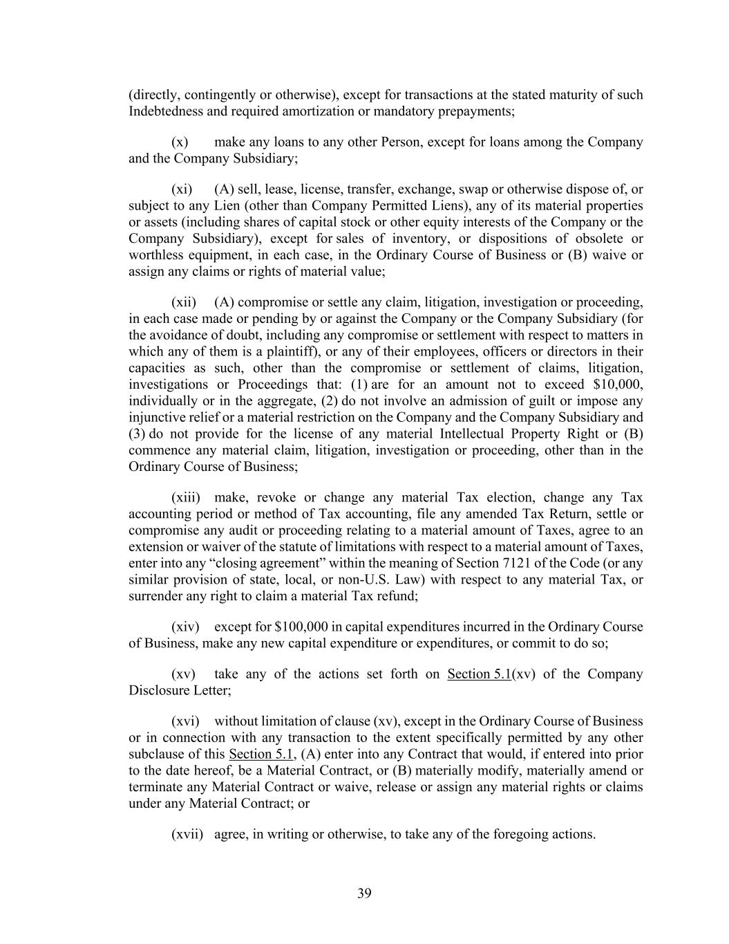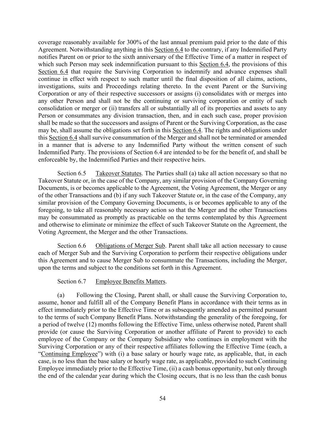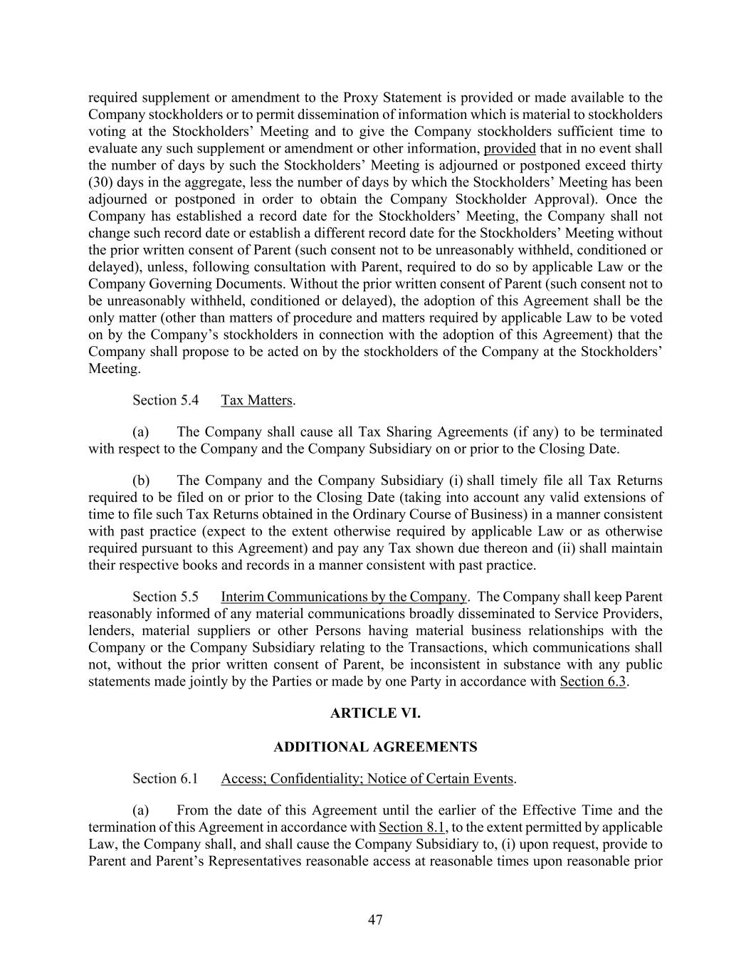 No Other Representations and Warranties ......................................... 33 ARTICLE IV. REPRESENTATIONS AND WARRANTIES OF PARENT AND MERGER SUB .............................................................................................. 33 Qualification, Organization, etc ......................................................... 33 Corporate Authority Relative to this Agreement; No Violation ........ 33 Investigations; Litigation ................................................................... 34 Information Supplied ......................................................................... 34 No Required Vote .............................................................................. 35 Finders and Brokers ........................................................................... 35 Financing............................................................................................ 35 Solvency ............................................................................................. 35 Stock Ownership ................................................................................ 36 No Merger Sub Activity..................................................................... 36 No Other Representations and Warranties ......................................... 36 ARTICLE V. COVENANTS RELATING TO CONDUCT OF BUSINESS PENDING THE MERGER .............................................................................................. 36 Conduct of Business by the Company ............................................... 36 Solicitation by the Company. ............................................................. 40 SEC Filings; Stockholders’ Meeting. ................................................ 45 Tax Matters ........................................................................................ 47 Interim Communications by the Company ........................................ 47 ARTICLE VI. ADDITIONAL AGREEMENTS ......................................................................... 47 Access; Confidentiality; Notice of Certain Events ............................ 47 Reasonable Best Efforts ..................................................................... 49 Publicity ............................................................................................. 52 Directors’ and Officers’ Insurance and Indemnification ................... 52 Takeover Statutes ............................................................................... 54 Obligations of Merger Sub ................................................................. 54 Employee Benefits Matters ................................................................ 54 Rule 16b-3 .......................................................................................... 57 Security Holder Litigation ................................................................. 57 Delisting ............................................................................................. 57 Treatment of Note Purchase Agreement. ........................................... 57 ARTICLE VII. CONDITIONS TO CONSUMMATION OF THE MERGER ........................... 58 Conditions to Each Party’s Obligations to Effect the Merger ........... 58 Conditions to Obligations of Parent and Merger Sub ........................ 59 Conditions to Obligations of the Company ....................................... 59 ARTICLE VIII. TERMINATION ............................................................................................... 60 Termination ........................................................................................ 60 Effect of Termination ......................................................................... 62