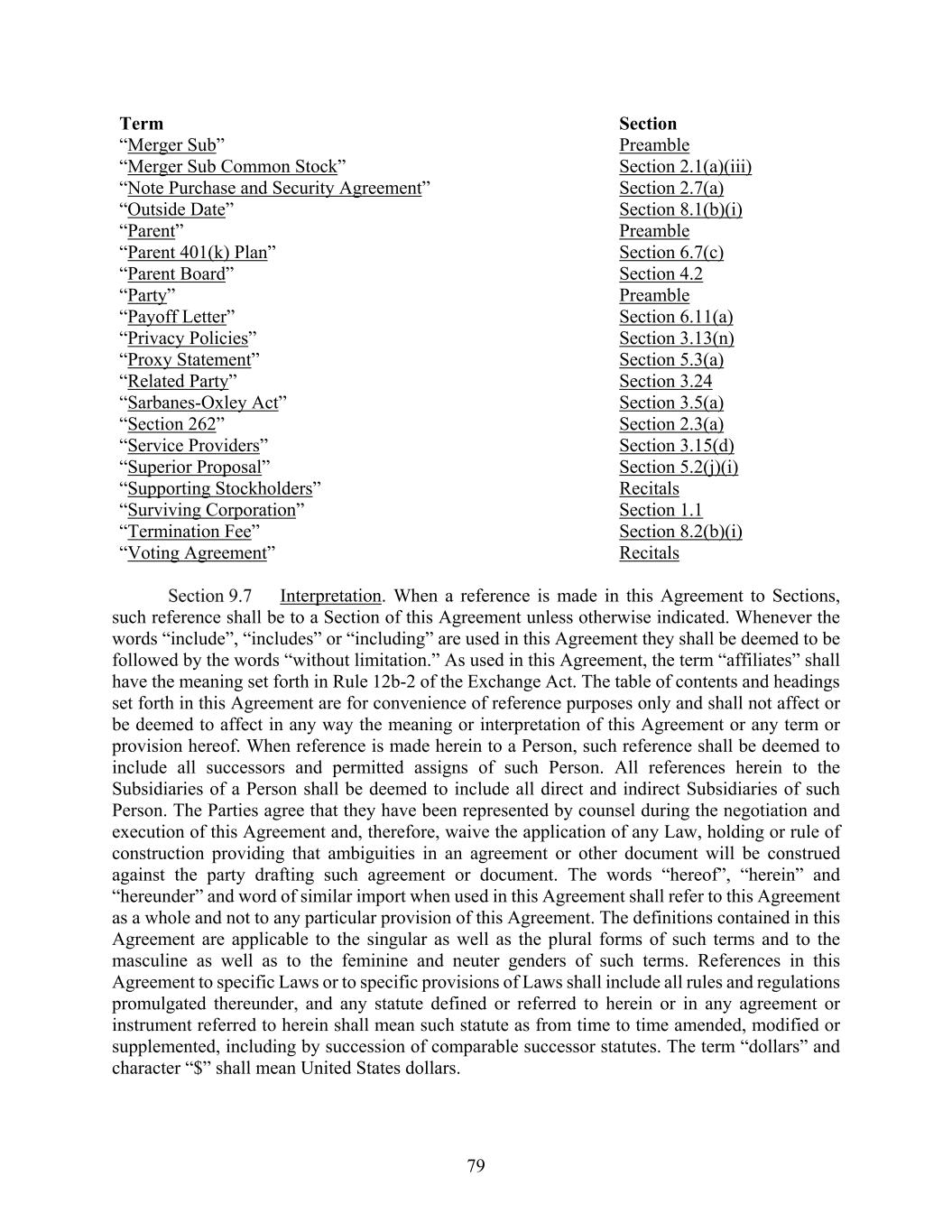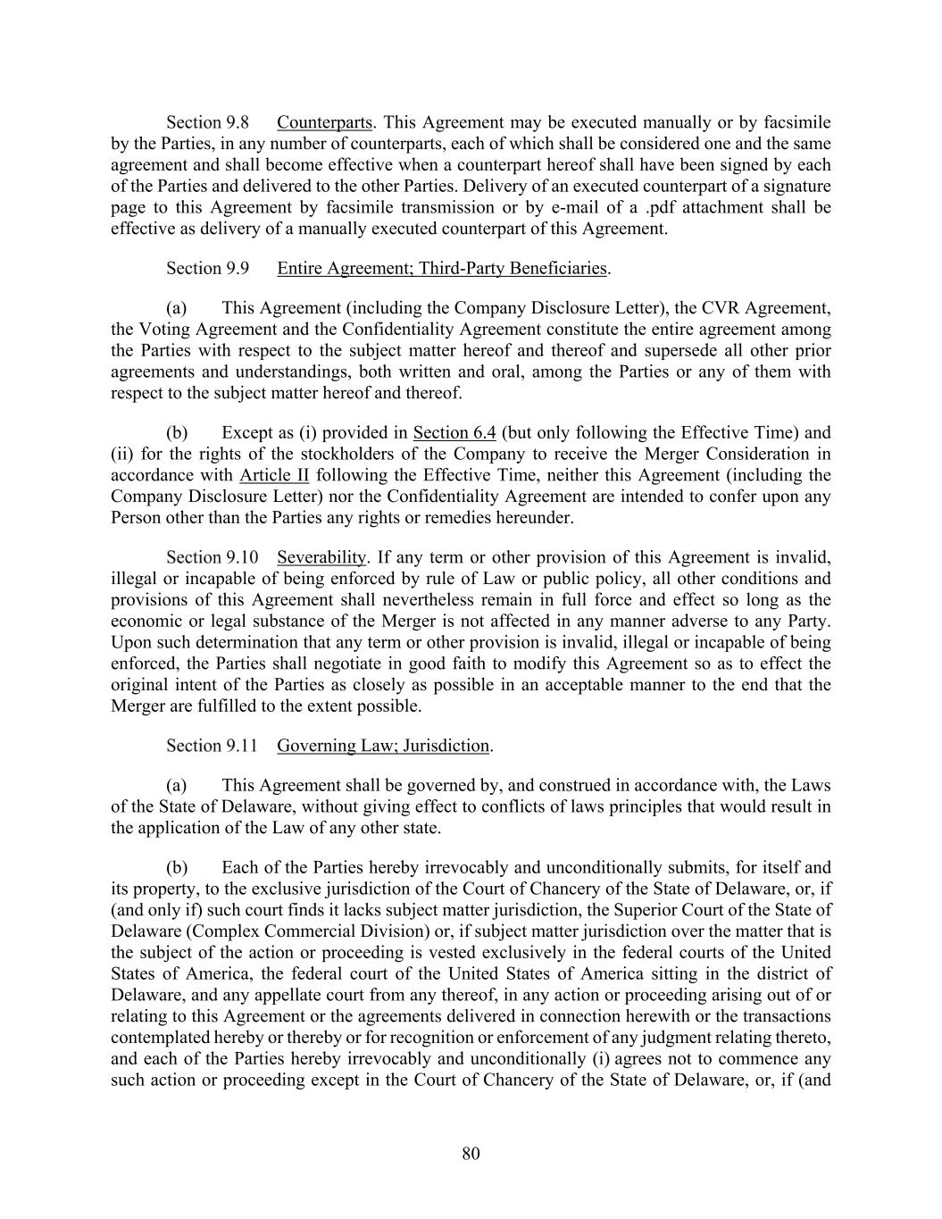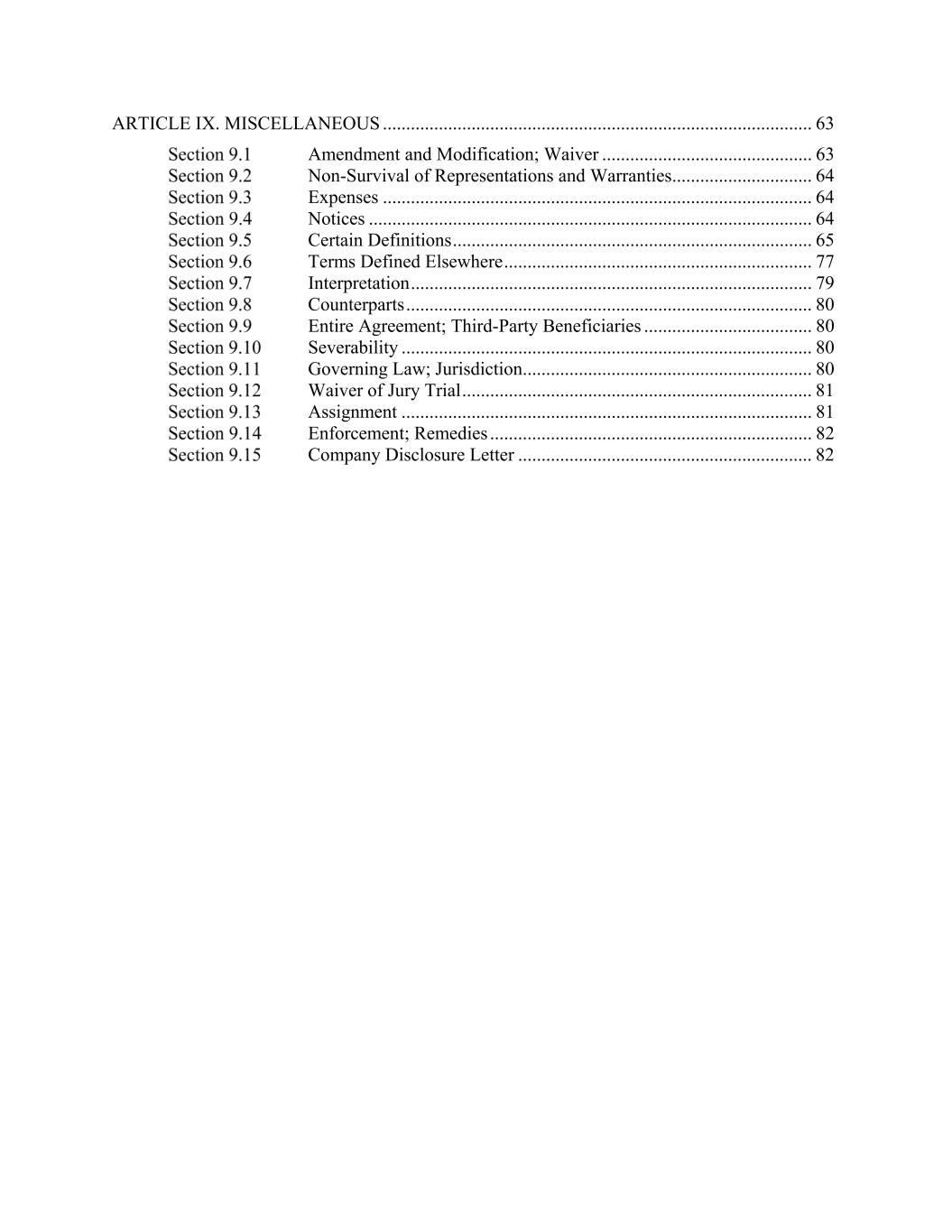 ARTICLE IX. MISCELLANEOUS ............................................................................................ 63 Amendment and Modification; Waiver ............................................. 63 Non-Survival of Representations and Warranties .............................. 64 Expenses ............................................................................................ 64 Notices ............................................................................................... 64 Certain Definitions ............................................................................. 65 Terms Defined Elsewhere .................................................................. 77 Interpretation ...................................................................................... 79 Counterparts ....................................................................................... 80 Entire Agreement; Third-Party Beneficiaries .................................... 80 Severability ........................................................................................ 80 Governing Law; Jurisdiction .............................................................. 80 Waiver of Jury Trial ........................................................................... 81 Assignment ........................................................................................ 81 Enforcement; Remedies ..................................................................... 82 Company Disclosure Letter ............................................................... 82