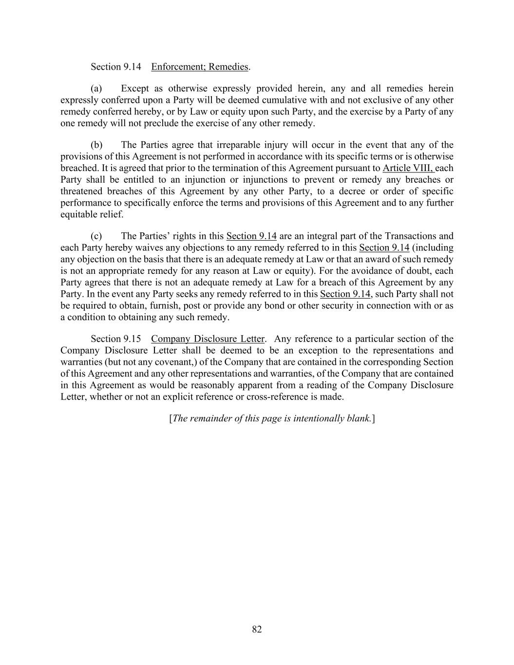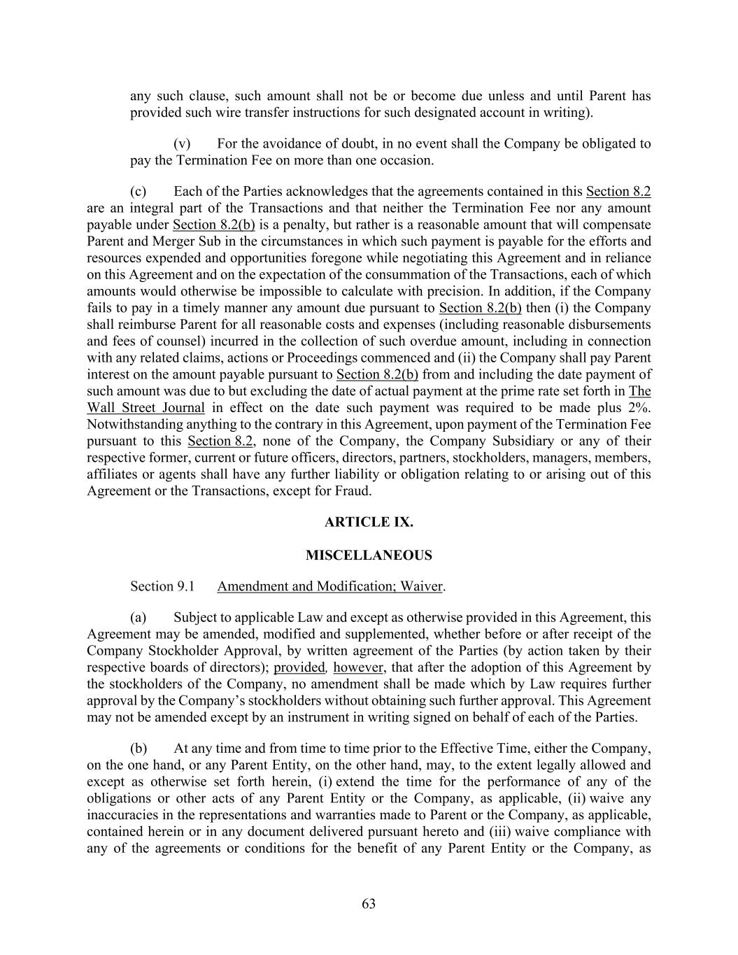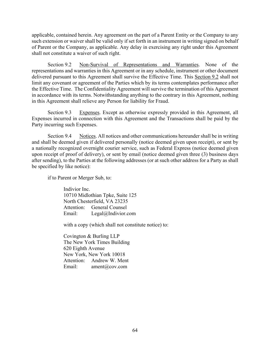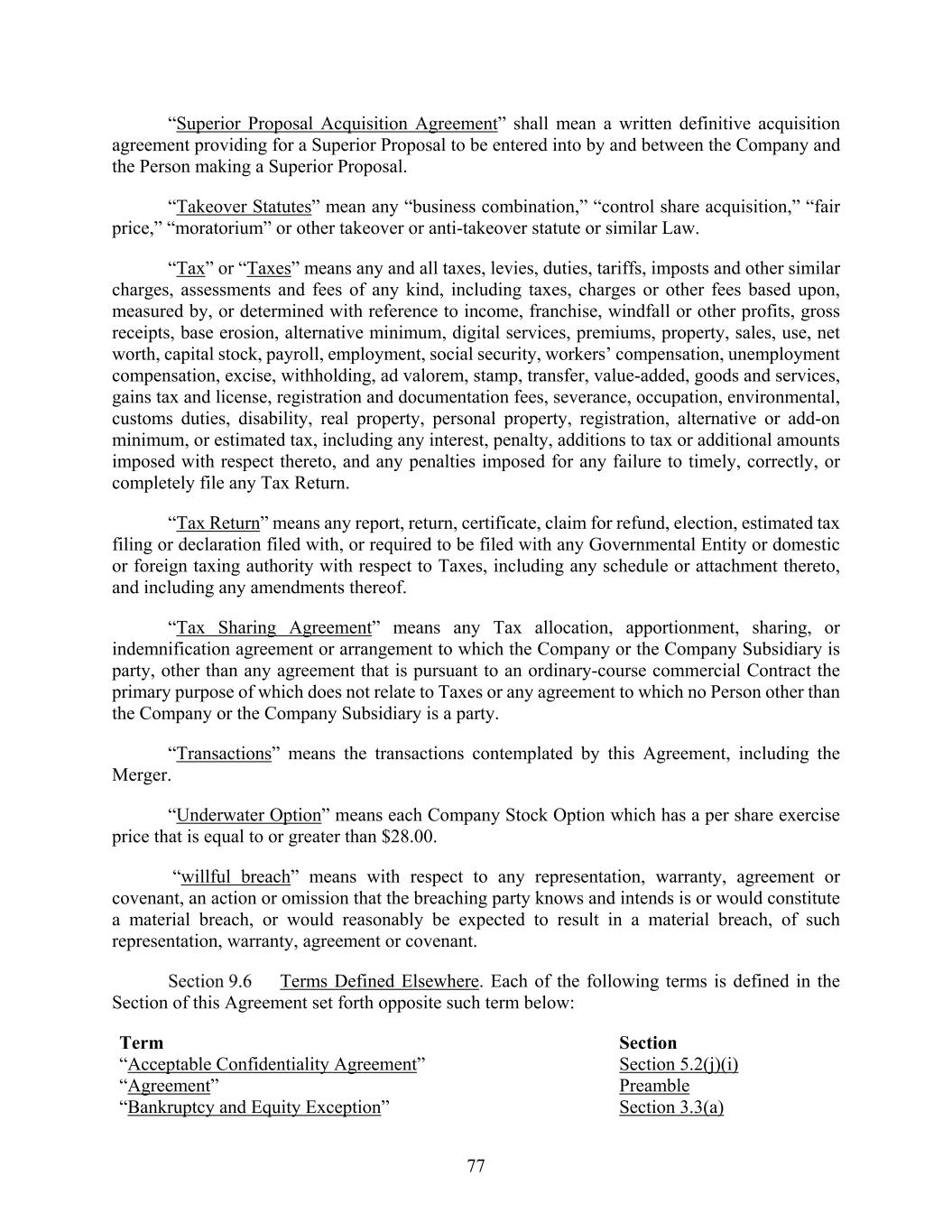 ARTICLE IX. MISCELLANEOUS ............................................................................................ 63 Amendment and Modification; Waiver ............................................. 63 Non-Survival of Representations and Warranties .............................. 64 Expenses ............................................................................................ 64 Notices ............................................................................................... 64 Certain Definitions ............................................................................. 65 Terms Defined Elsewhere .................................................................. 77 Interpretation ...................................................................................... 79 Counterparts ....................................................................................... 80 Entire Agreement; Third-Party Beneficiaries .................................... 80 Severability ........................................................................................ 80 Governing Law; Jurisdiction .............................................................. 80 Waiver of Jury Trial ........................................................................... 81 Assignment ........................................................................................ 81 Enforcement; Remedies ..................................................................... 82 Company Disclosure Letter ............................................................... 82