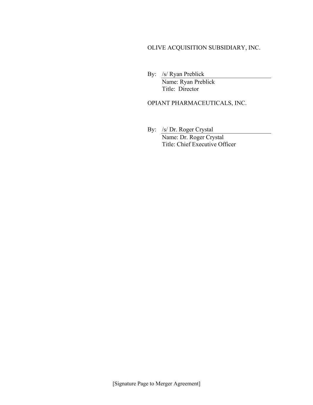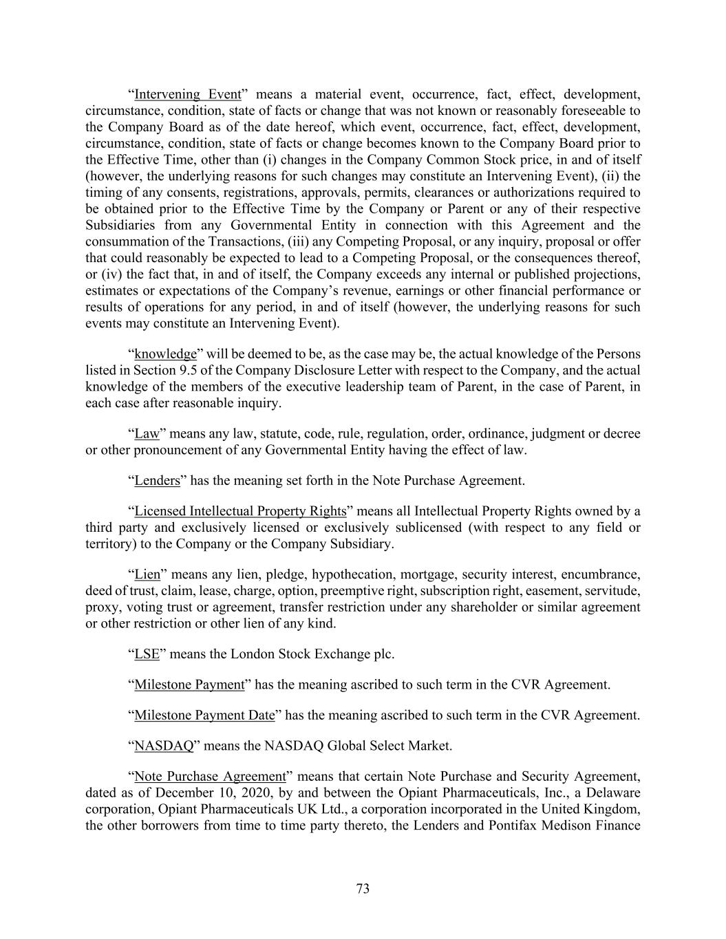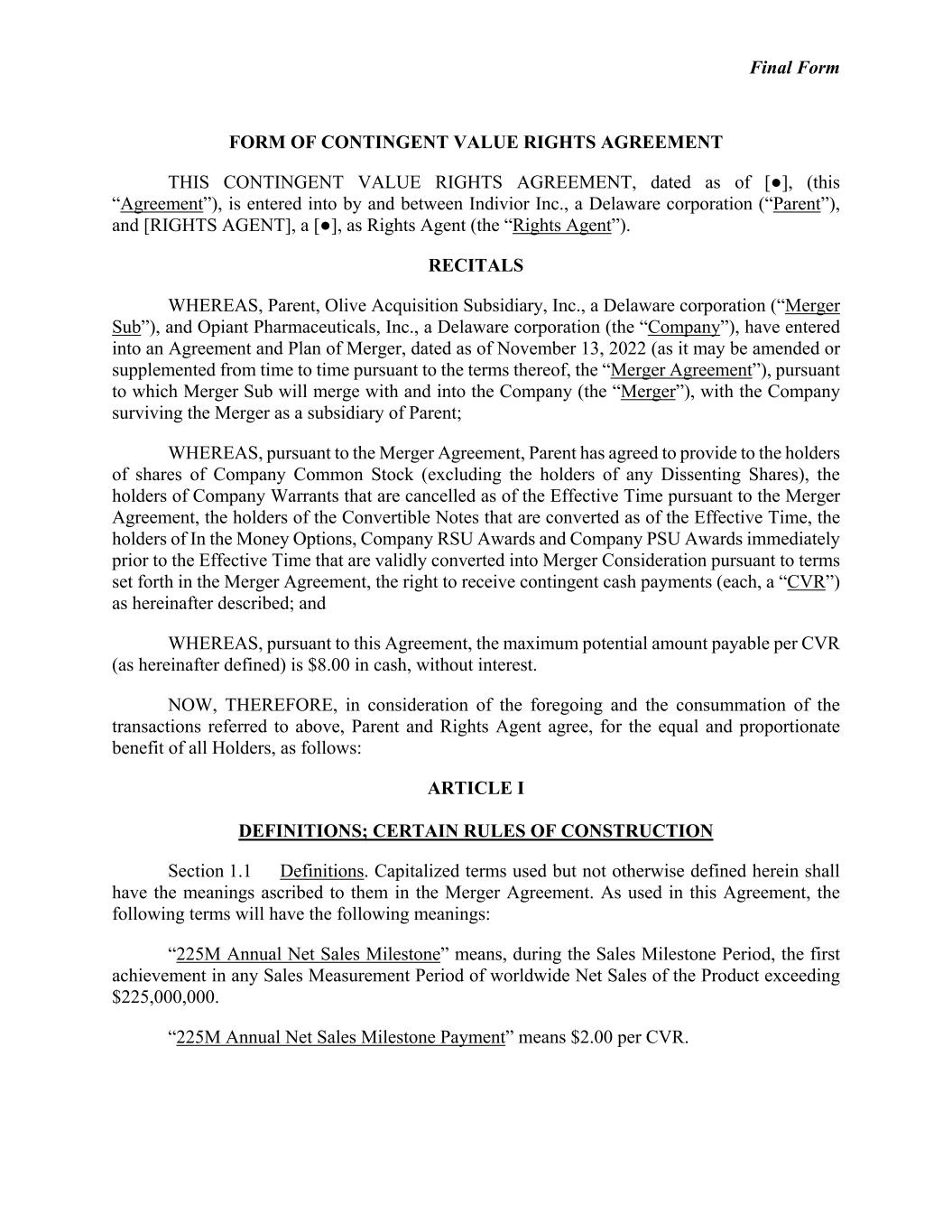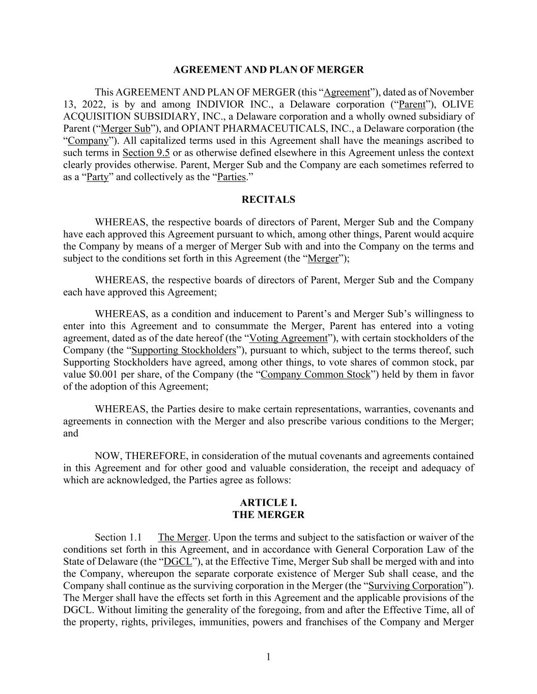 1 AGREEMENT AND PLAN OF MERGER This AGREEMENT AND PLAN OF MERGER (this “Agreement”), dated as of November 13, 2022, is by and among INDIVIOR INC., a Delaware corporation (“Parent”), OLIVE ACQUISITION SUBSIDIARY, INC., a Delaware corporation and a wholly owned subsidiary of Parent (“Merger Sub”), and OPIANT PHARMACEUTICALS, INC., a Delaware corporation (the “Company”). All capitalized terms used in this Agreement shall have the meanings ascribed to such terms in Section 9.5 or as otherwise defined elsewhere in this Agreement unless the context clearly provides otherwise. Parent, Merger Sub and the Company are each sometimes referred to as a “Party” and collectively as the “Parties.” RECITALS WHEREAS, the respective boards of directors of Parent, Merger Sub and the Company have each approved this Agreement pursuant to which, among other things, Parent would acquire the Company by means of a merger of Merger Sub with and into the Company on the terms and subject to the conditions set forth in this Agreement (the “Merger”); WHEREAS, the respective boards of directors of Parent, Merger Sub and the Company each have approved this Agreement; WHEREAS, as a condition and inducement to Parent’s and Merger Sub’s willingness to enter into this Agreement and to consummate the Merger, Parent has entered into a voting agreement, dated as of the date hereof (the “Voting Agreement”), with certain stockholders of the Company (the “Supporting Stockholders”), pursuant to which, subject to the terms thereof, such Supporting Stockholders have agreed, among other things, to vote shares of common stock, par value $0.001 per share, of the Company (the “Company Common Stock”) held by them in favor of the adoption of this Agreement; WHEREAS, the Parties desire to make certain representations, warranties, covenants and agreements in connection with the Merger and also prescribe various conditions to the Merger; and NOW, THEREFORE, in consideration of the mutual covenants and agreements contained in this Agreement and for other good and valuable consideration, the receipt and adequacy of which are acknowledged, the Parties agree as follows: ARTICLE I. THE MERGER The Merger. Upon the terms and subject to the satisfaction or waiver of the conditions set forth in this Agreement, and in accordance with General Corporation Law of the State of Delaware (the “DGCL”), at the Effective Time, Merger Sub shall be merged with and into the Company, whereupon the separate corporate existence of Merger Sub shall cease, and the Company shall continue as the surviving corporation in the Merger (the “Surviving Corporation”). The Merger shall have the effects set forth in this Agreement and the applicable provisions of the DGCL. Without limiting the generality of the foregoing, from and after the Effective Time, all of the property, rights, privileges, immunities, powers and franchises of the Company and Merger