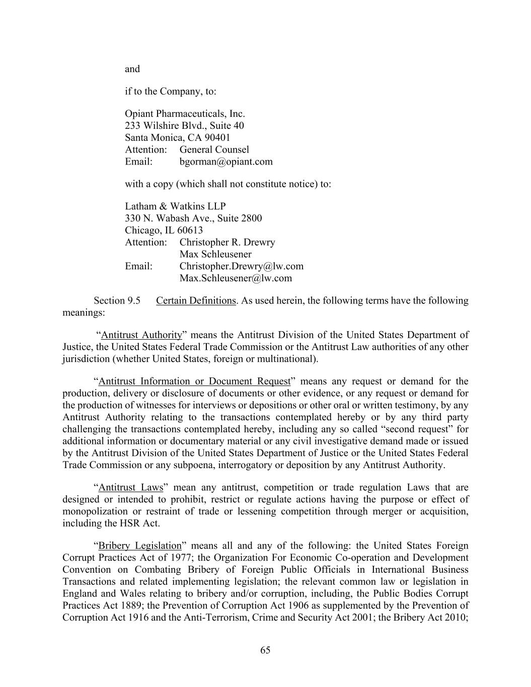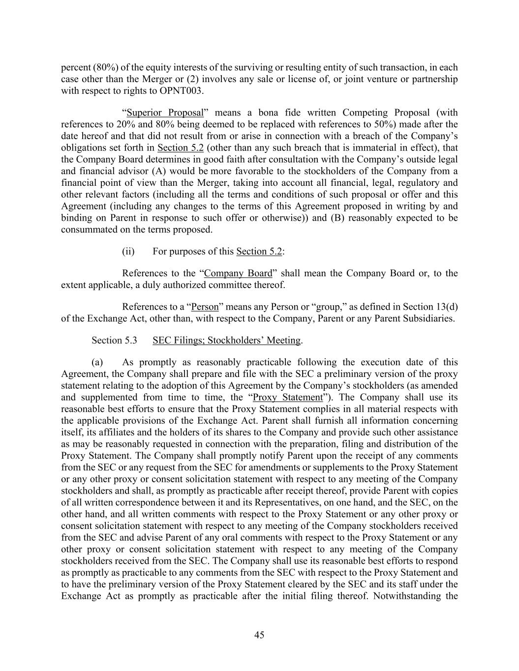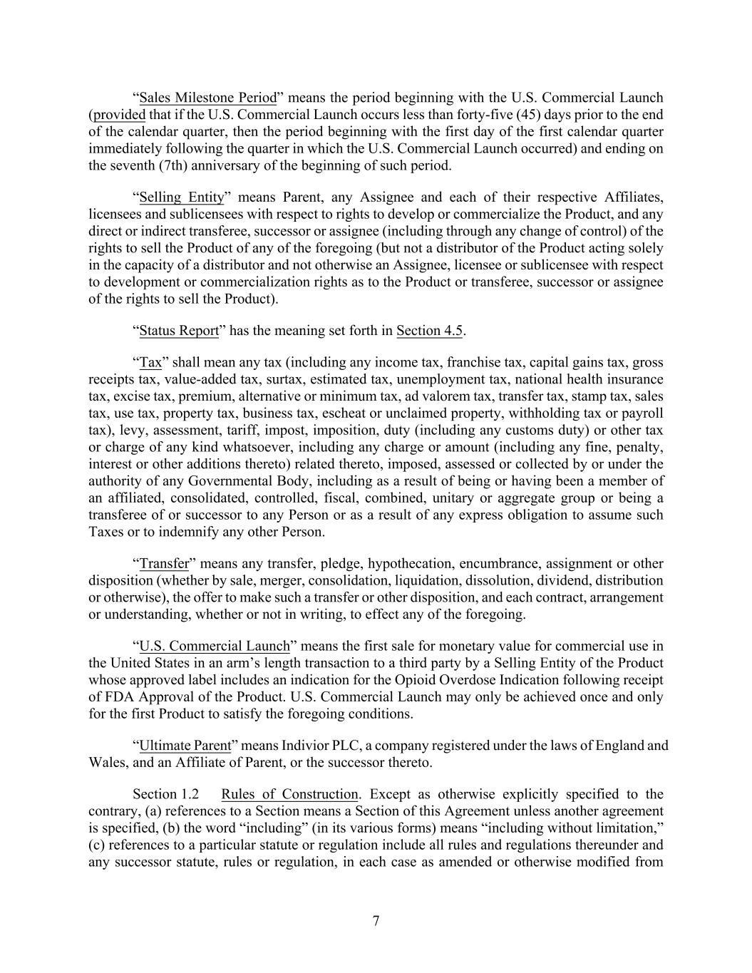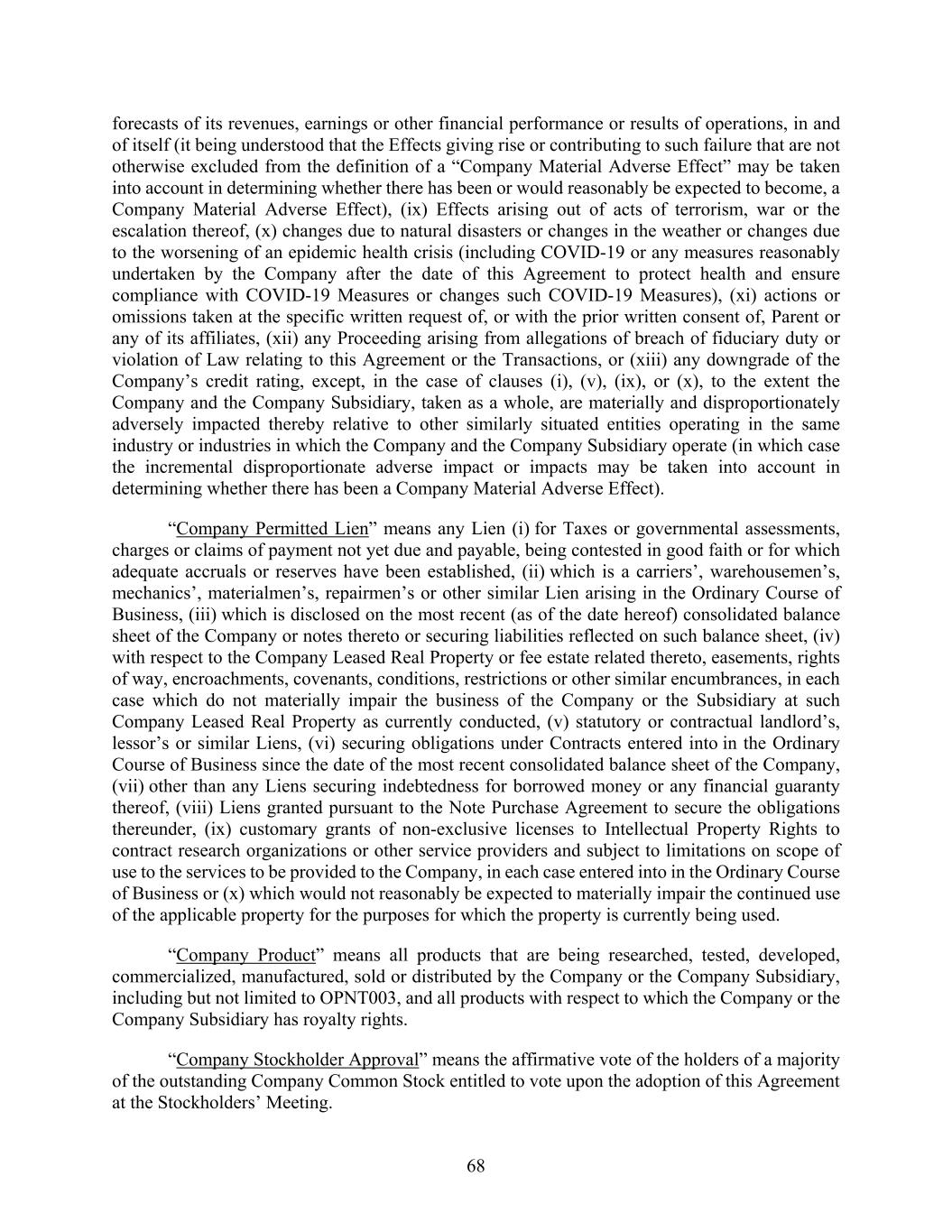 1 AGREEMENT AND PLAN OF MERGER This AGREEMENT AND PLAN OF MERGER (this “Agreement”), dated as of November 13, 2022, is by and among INDIVIOR INC., a Delaware corporation (“Parent”), OLIVE ACQUISITION SUBSIDIARY, INC., a Delaware corporation and a wholly owned subsidiary of Parent (“Merger Sub”), and OPIANT PHARMACEUTICALS, INC., a Delaware corporation (the “Company”). All capitalized terms used in this Agreement shall have the meanings ascribed to such terms in Section 9.5 or as otherwise defined elsewhere in this Agreement unless the context clearly provides otherwise. Parent, Merger Sub and the Company are each sometimes referred to as a “Party” and collectively as the “Parties.” RECITALS WHEREAS, the respective boards of directors of Parent, Merger Sub and the Company have each approved this Agreement pursuant to which, among other things, Parent would acquire the Company by means of a merger of Merger Sub with and into the Company on the terms and subject to the conditions set forth in this Agreement (the “Merger”); WHEREAS, the respective boards of directors of Parent, Merger Sub and the Company each have approved this Agreement; WHEREAS, as a condition and inducement to Parent’s and Merger Sub’s willingness to enter into this Agreement and to consummate the Merger, Parent has entered into a voting agreement, dated as of the date hereof (the “Voting Agreement”), with certain stockholders of the Company (the “Supporting Stockholders”), pursuant to which, subject to the terms thereof, such Supporting Stockholders have agreed, among other things, to vote shares of common stock, par value $0.001 per share, of the Company (the “Company Common Stock”) held by them in favor of the adoption of this Agreement; WHEREAS, the Parties desire to make certain representations, warranties, covenants and agreements in connection with the Merger and also prescribe various conditions to the Merger; and NOW, THEREFORE, in consideration of the mutual covenants and agreements contained in this Agreement and for other good and valuable consideration, the receipt and adequacy of which are acknowledged, the Parties agree as follows: ARTICLE I. THE MERGER The Merger. Upon the terms and subject to the satisfaction or waiver of the conditions set forth in this Agreement, and in accordance with General Corporation Law of the State of Delaware (the “DGCL”), at the Effective Time, Merger Sub shall be merged with and into the Company, whereupon the separate corporate existence of Merger Sub shall cease, and the Company shall continue as the surviving corporation in the Merger (the “Surviving Corporation”). The Merger shall have the effects set forth in this Agreement and the applicable provisions of the DGCL. Without limiting the generality of the foregoing, from and after the Effective Time, all of the property, rights, privileges, immunities, powers and franchises of the Company and Merger