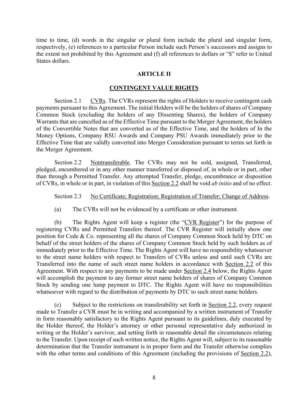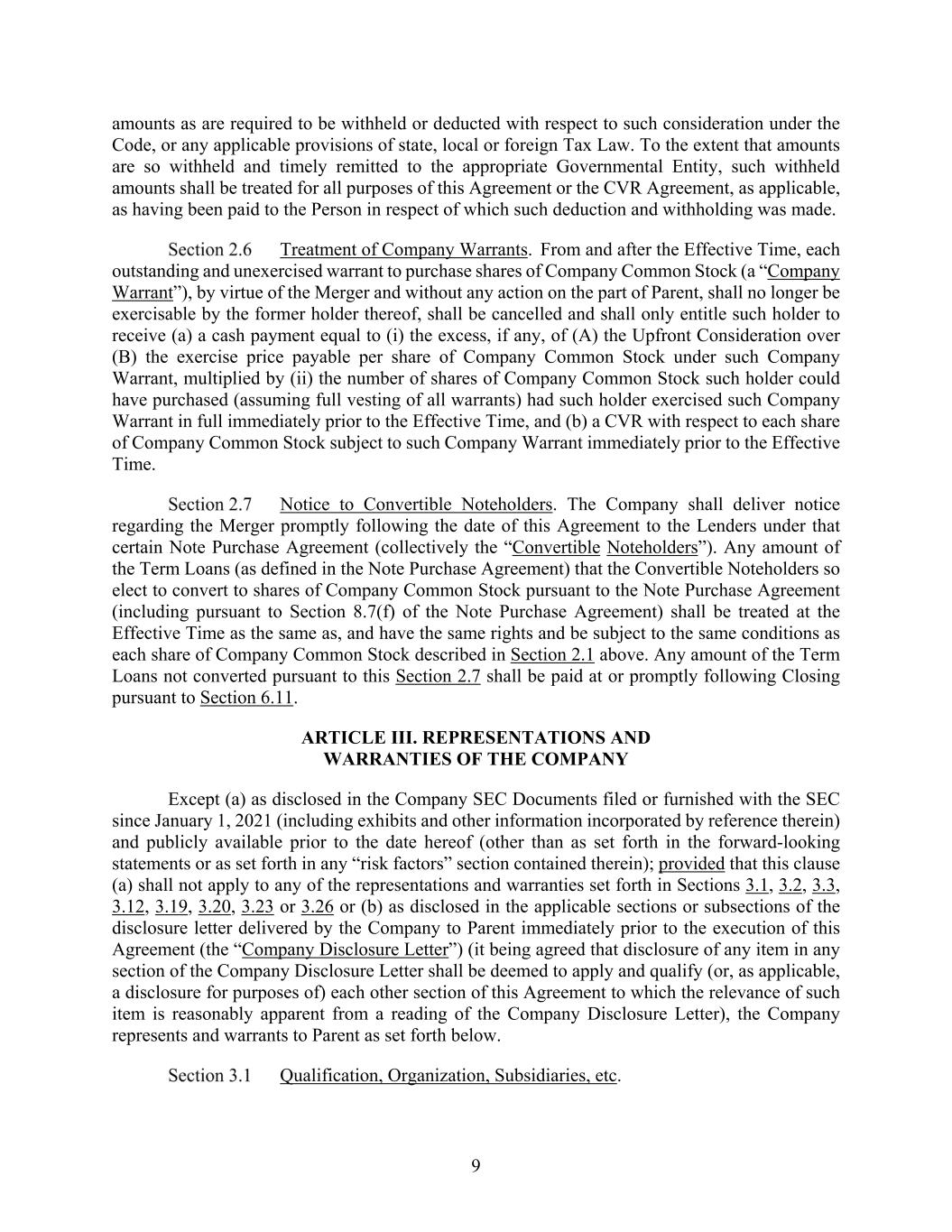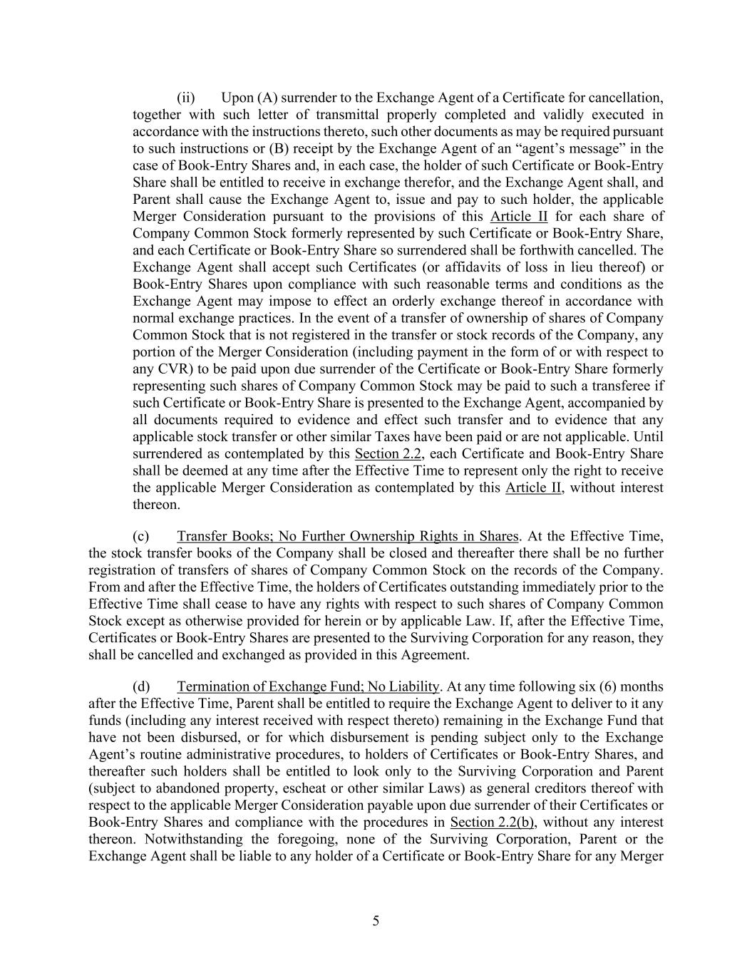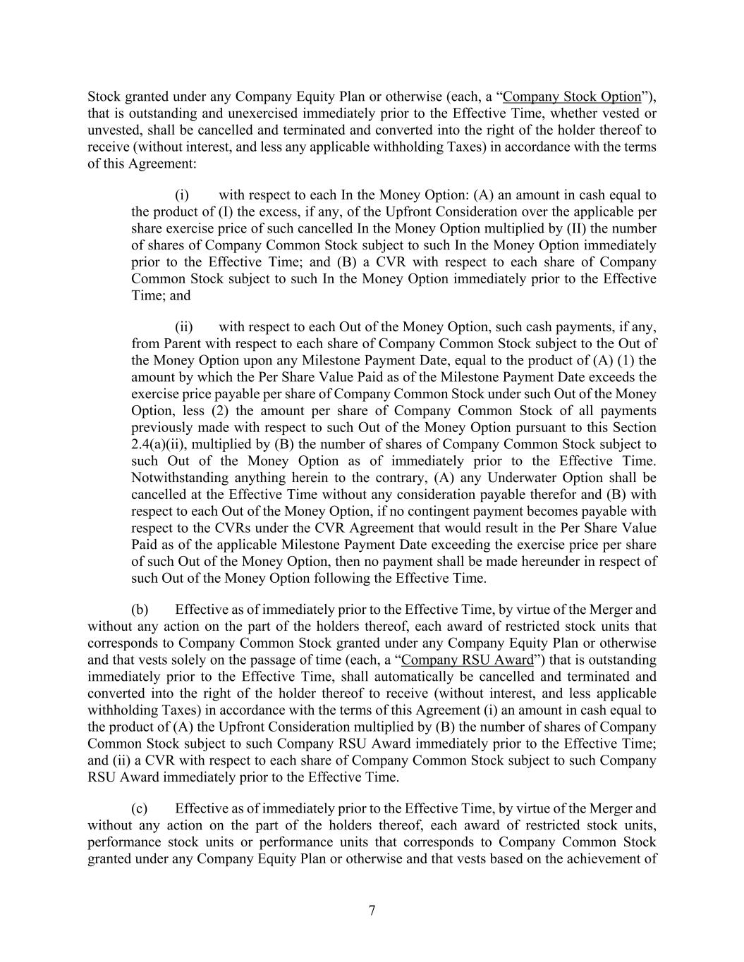 •with respect to each Company Stock Option that has a per share exercise price that is less than or equal to the Upfront Consideration (each, an “In the Money Option”), converted into the right of the holder to receive (without interest, and less any applicable withholding taxes) (i) an amount in cash equal to the product of (A) the excess, if any, of the Upfront Consideration over the applicable per share exercise price of such cancelled In the Money Option multiplied by (B) the number of shares of Company Common Stock subject to such In the Money Option immediately prior to the Effective Time; and (ii) a CVR with respect to each share of Company Common Stock subject to such In the Money Option immediately prior to the Effective Time.
