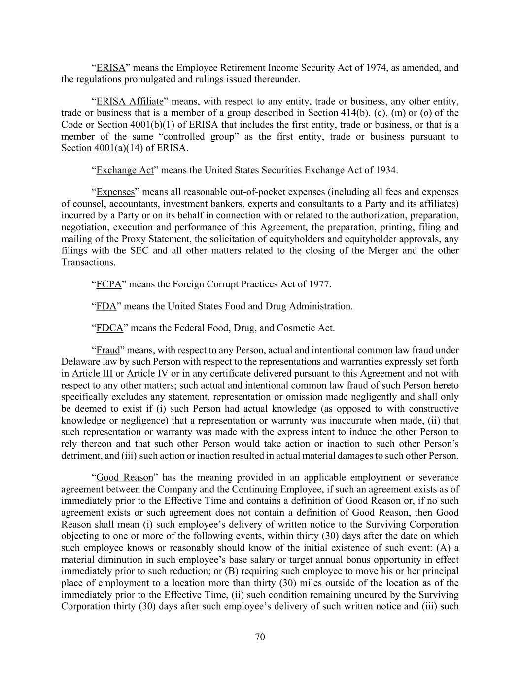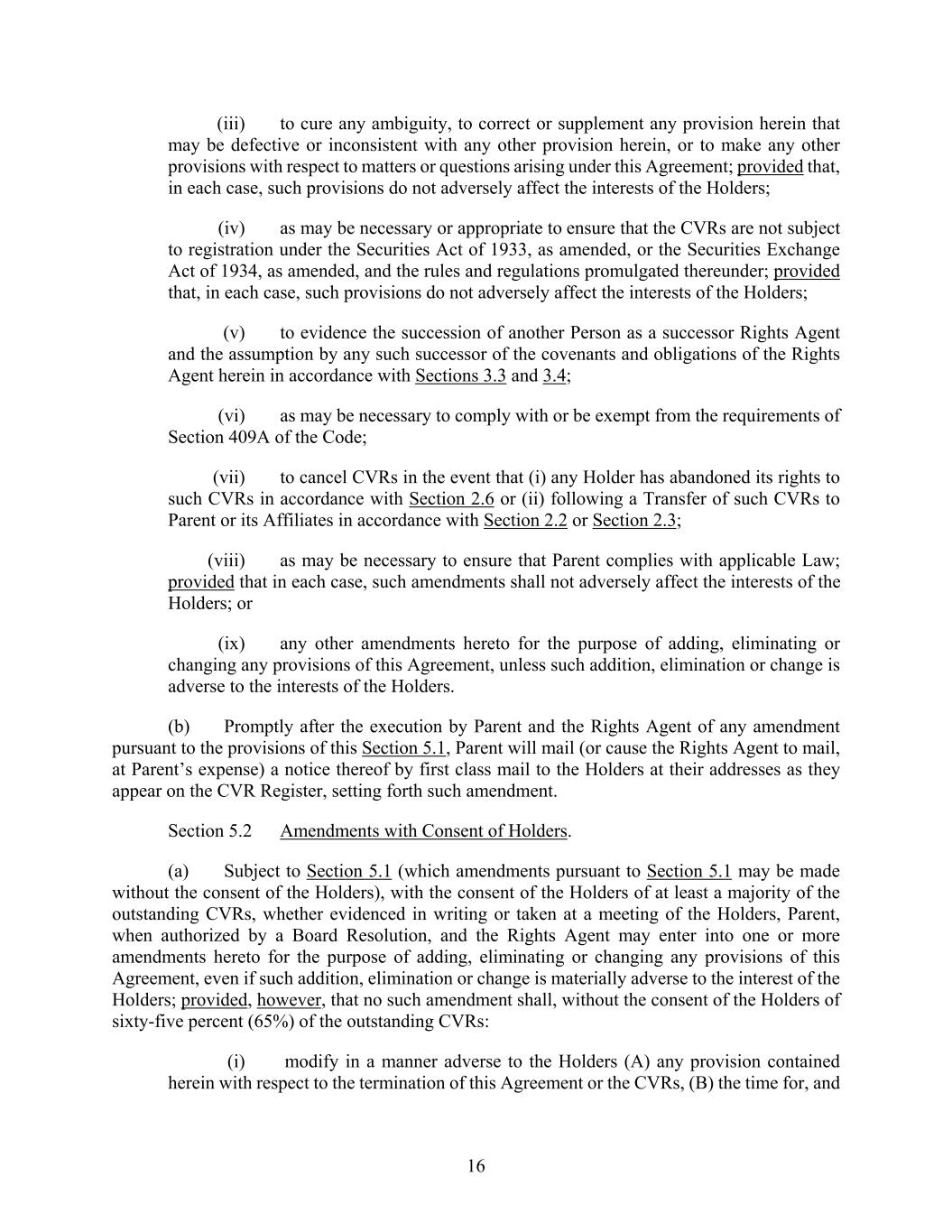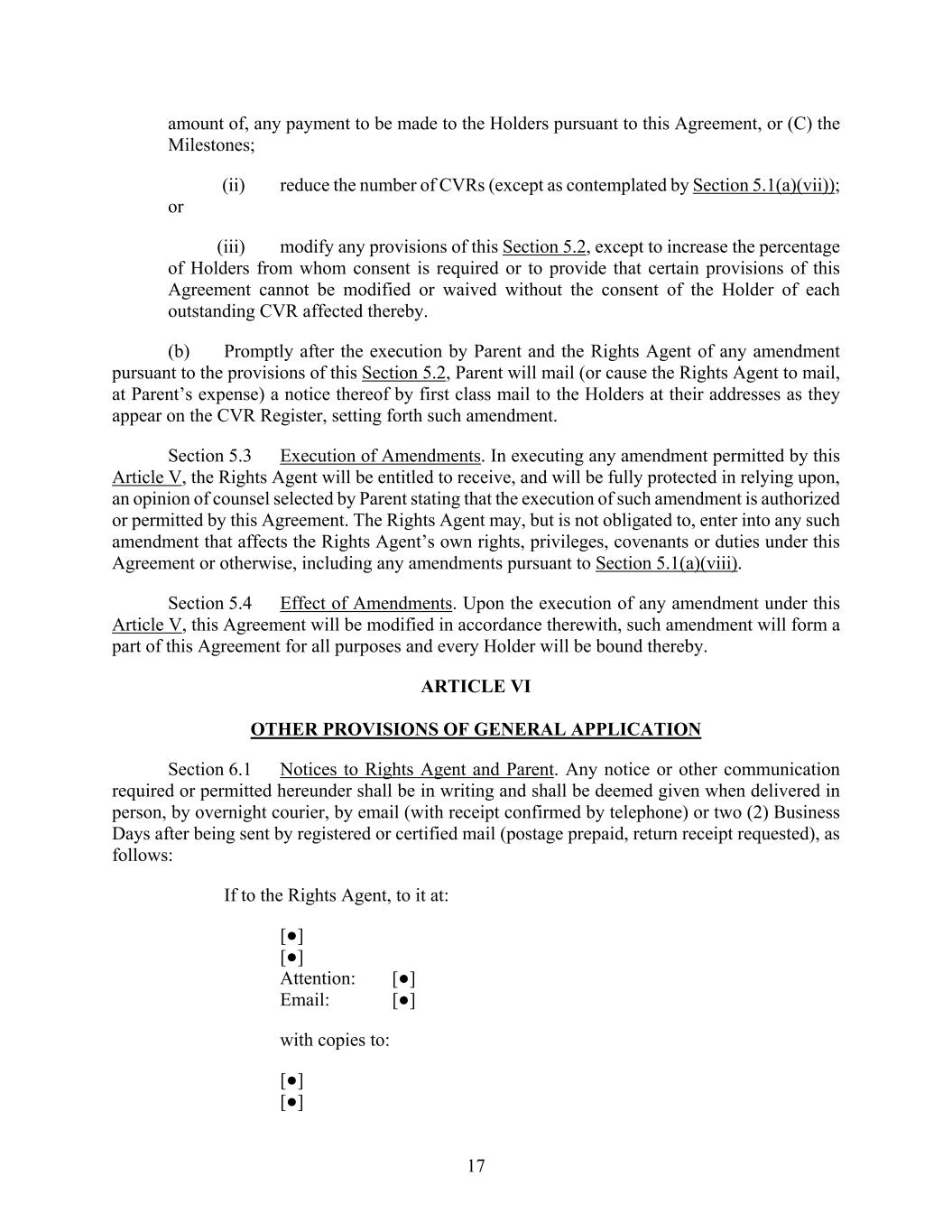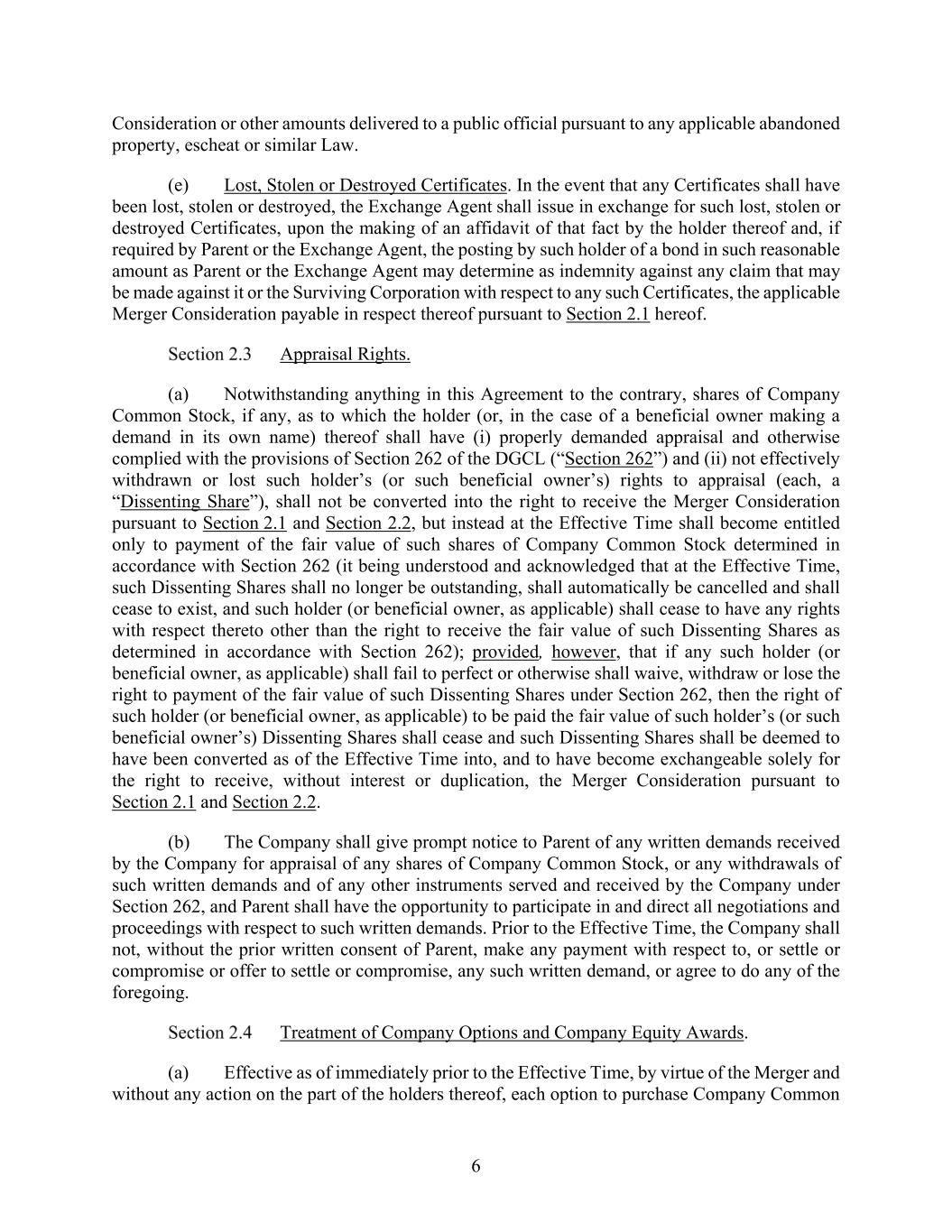 •with respect to each Company Stock Option that has a per share exercise price that is less than or equal to the Upfront Consideration (each, an “In the Money Option”), converted into the right of the holder to receive (without interest, and less any applicable withholding taxes) (i) an amount in cash equal to the product of (A) the excess, if any, of the Upfront Consideration over the applicable per share exercise price of such cancelled In the Money Option multiplied by (B) the number of shares of Company Common Stock subject to such In the Money Option immediately prior to the Effective Time; and (ii) a CVR with respect to each share of Company Common Stock subject to such In the Money Option immediately prior to the Effective Time.