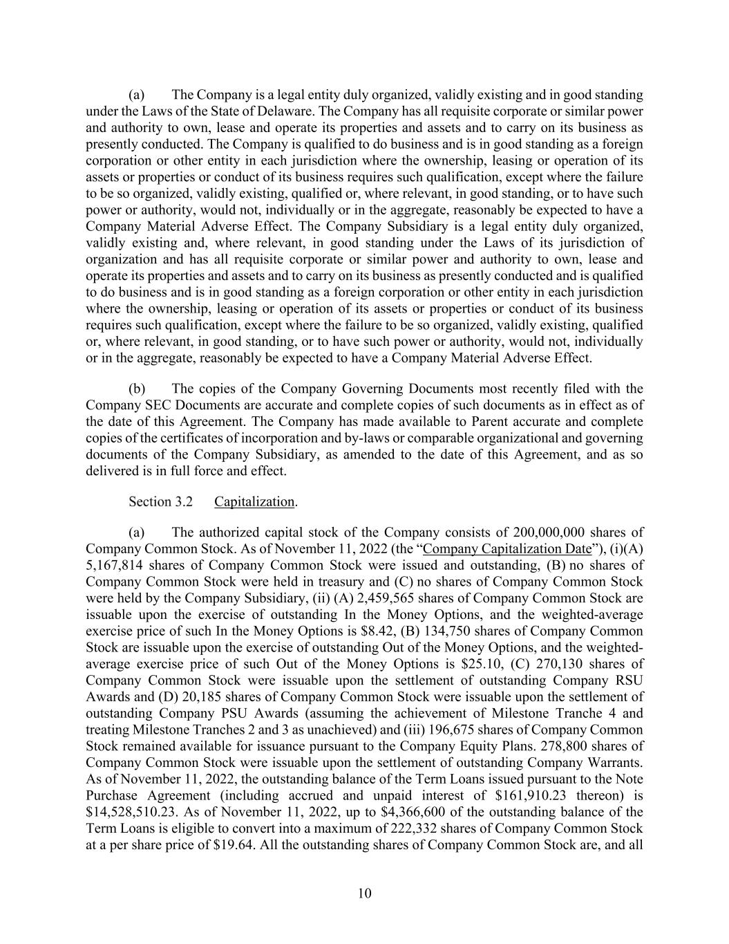 (a)Organization. If such Stockholder is not an individual, it is duly organized, validly existing and in good standing under the Laws of the jurisdiction of its organization.