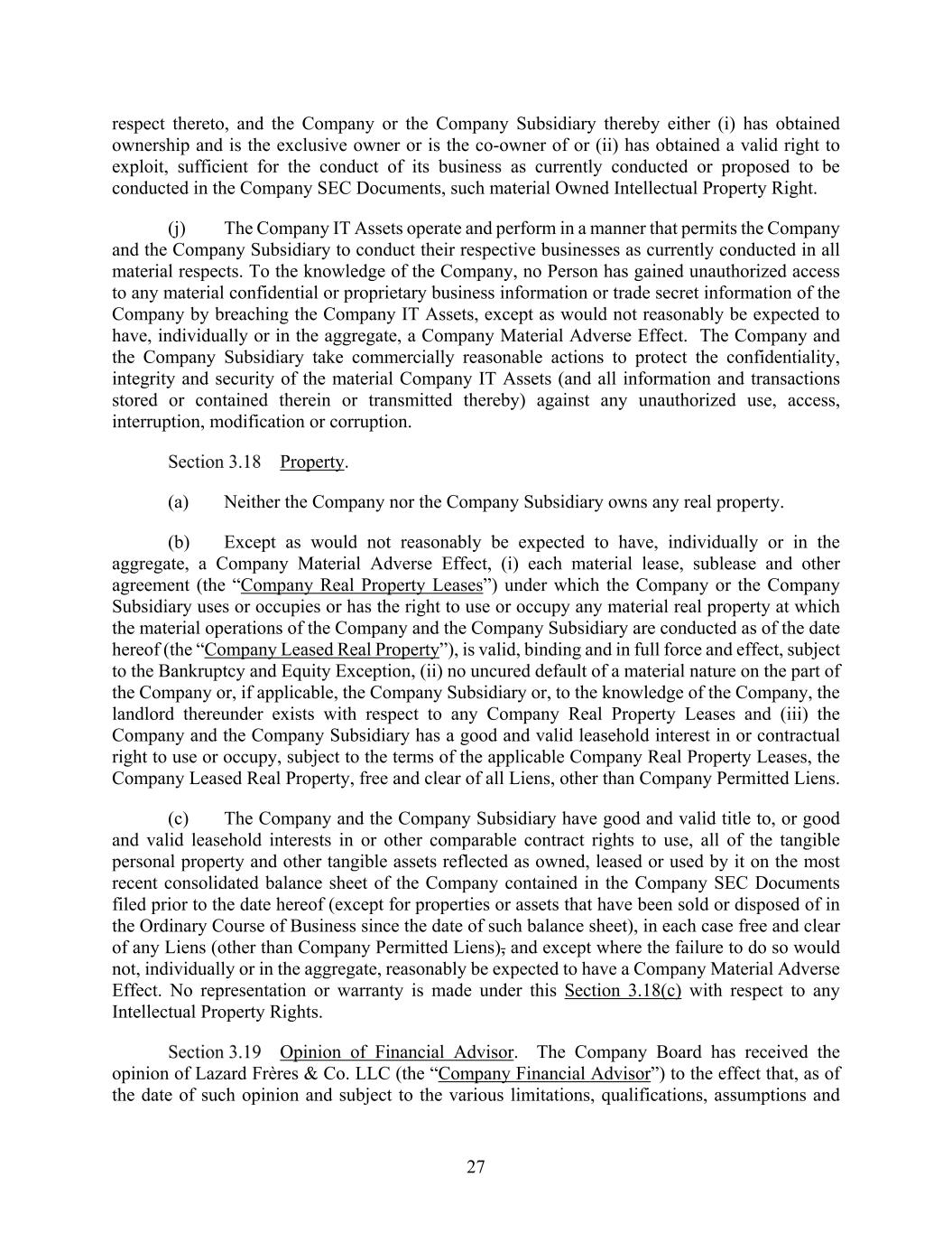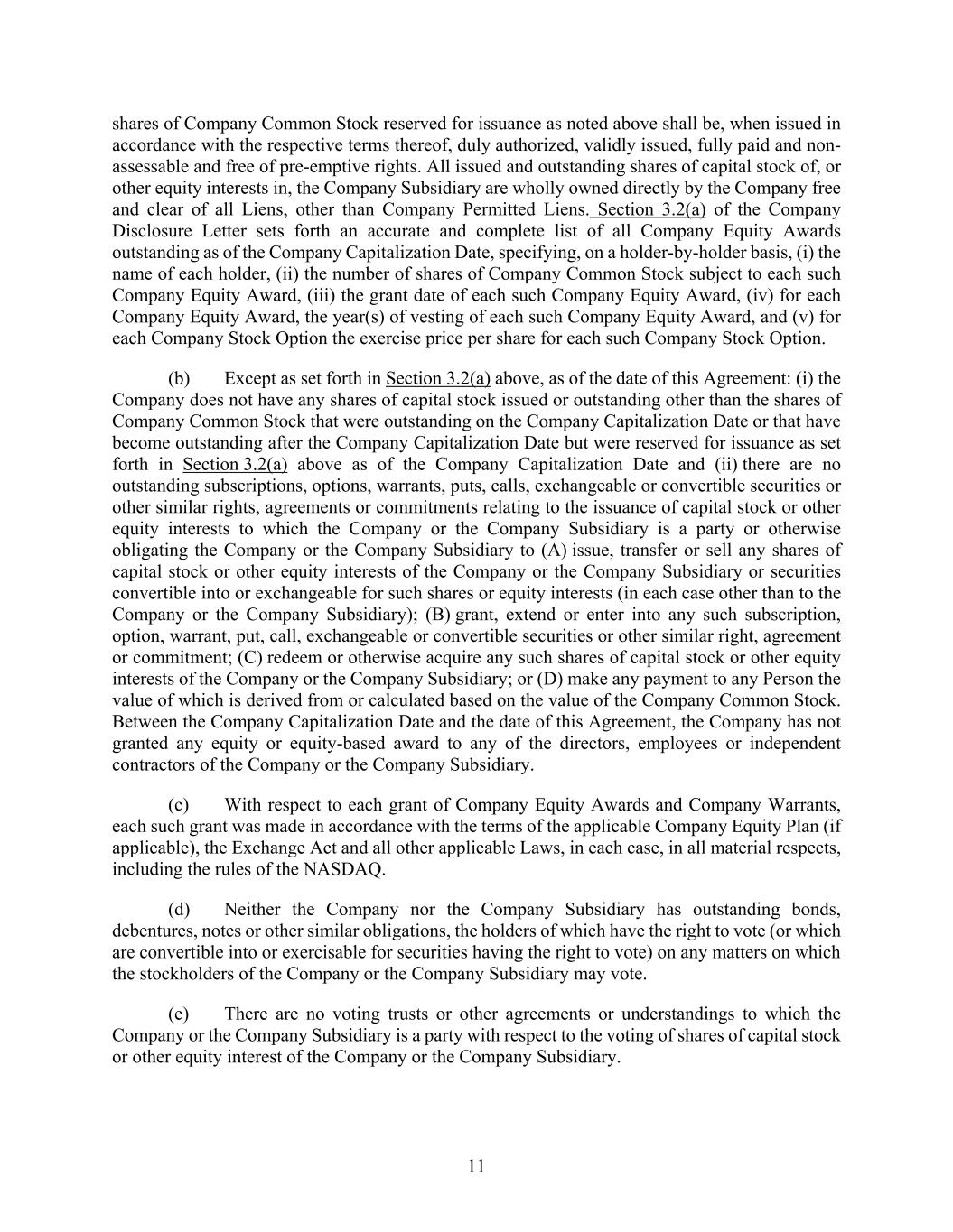 (d)Ownership of Subject Shares. As of the date hereof, such Stockholder (together with such Stockholder’s spouse if such Stockholder is married and the Subject Shares constitute community property under applicable Law) is, and (except with respect to any Subject Shares Transferred (as defined below) in accordance with Section 3.2 hereof) at all times during the Agreement Period will be, the record and beneficial owner of such Stockholder’s Subject Shares free and clear of any Liens (except for the Permitted Exceptions) and with no restrictions on such Stockholder’s rights of voting or disposition pertaining thereto, except for any applicable restrictions on Transfer (as defined below) under the Securities Act. Except to the extent of any Subject Shares acquired after the date hereof (which shall become Subject Shares upon that acquisition), the Subject Shares set forth on Schedule I opposite the name of such Stockholder are the only shares of Company Common Stock beneficially owned by such Stockholder on the date hereof. Other than as set forth on Schedule I, such Stockholder does not beneficially own any (i) shares of capital stock or other voting securities of or ownership interests in the Company, (ii) securities of the Company convertible into or exchangeable for shares of capital stock or other voting securities of or ownership interests in the Company, or (iii) warrants, calls, options