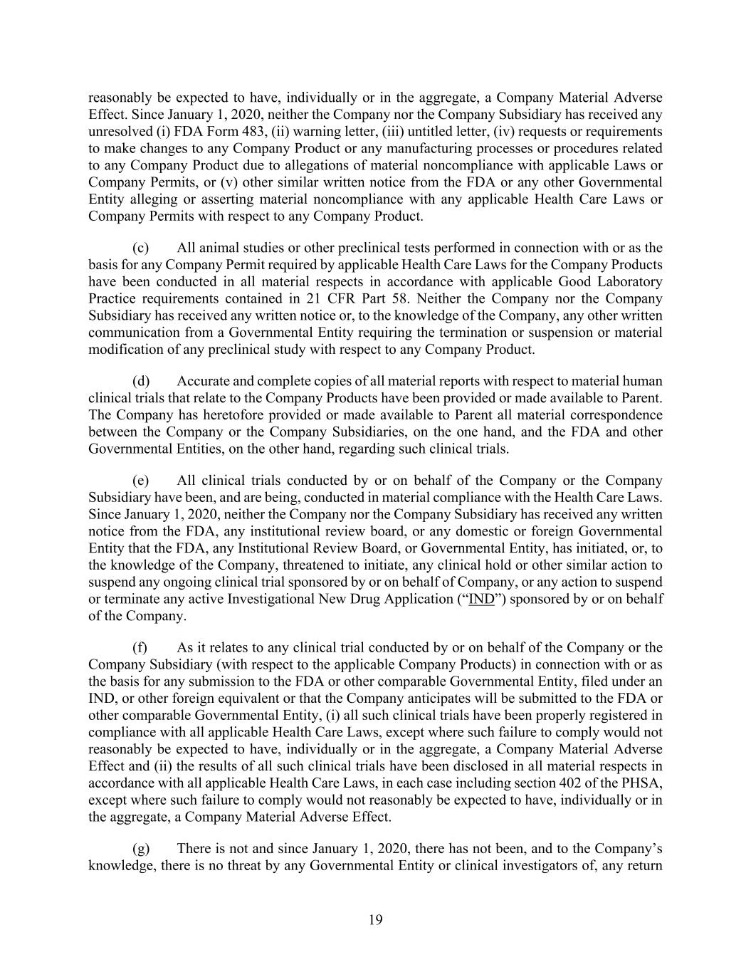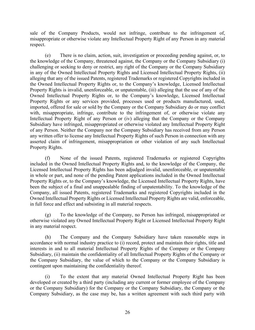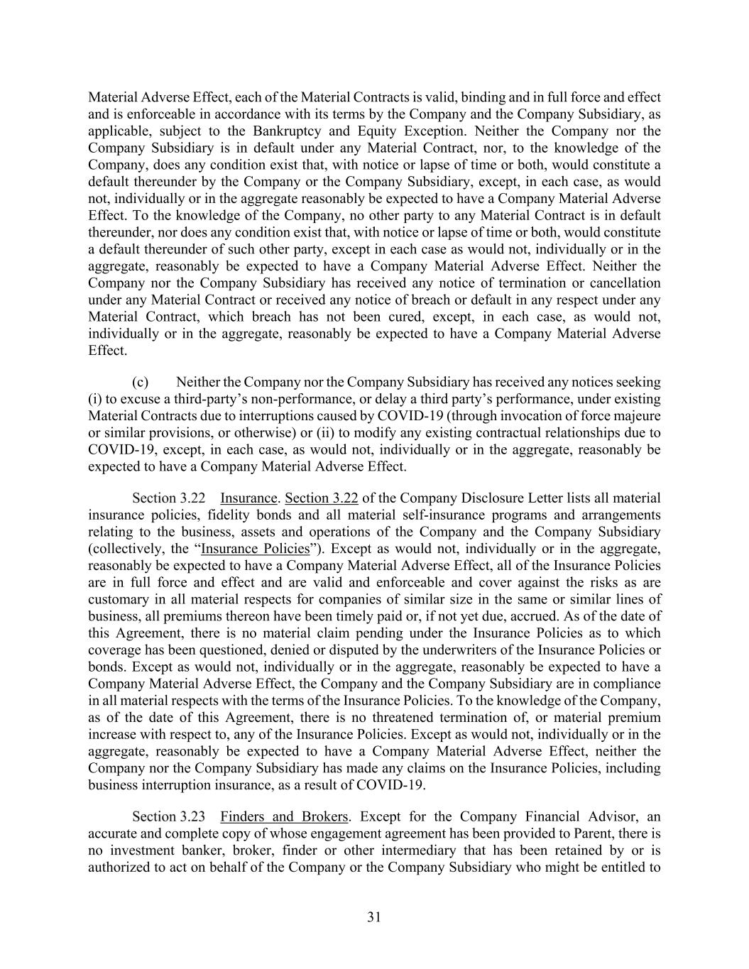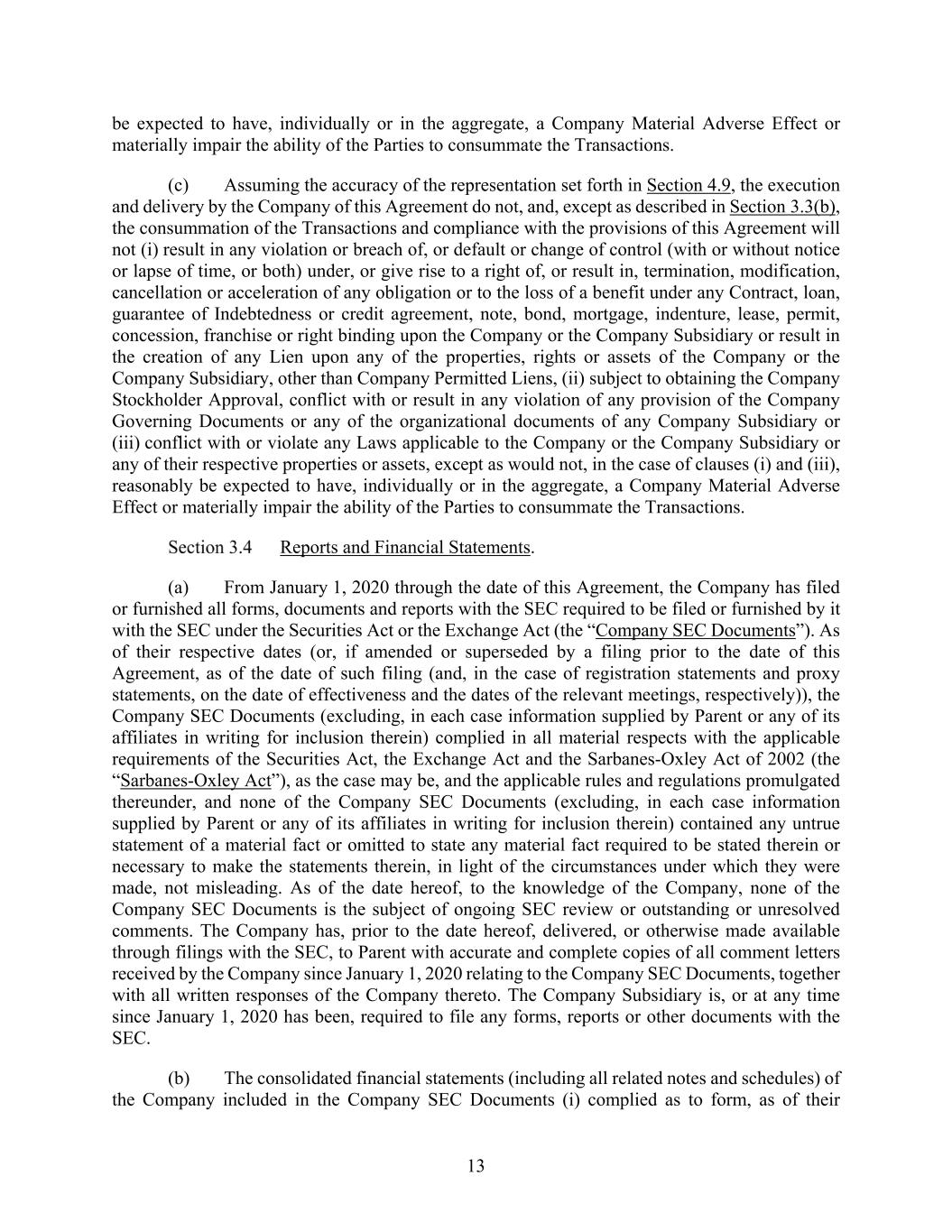 (i)Neither the execution and delivery of this Agreement by Parent nor the consummation by Parent of the transactions contemplated hereby, nor compliance by Parent with any of the terms or provisions hereof, will (A) conflict with or violate any provision of the certificate of incorporation and bylaws of Parent, (B) violate any Law or Judgment applicable to Parent, or (C) result in any violation or breach of any Contract to which Parent is a party, other than in the case of clauses (A), (B) and (C) has not had, and would not reasonably be expected to have, individually or in the aggregate, a material adverse effect on such the ability of Parent to perform its obligations under this Agreement.