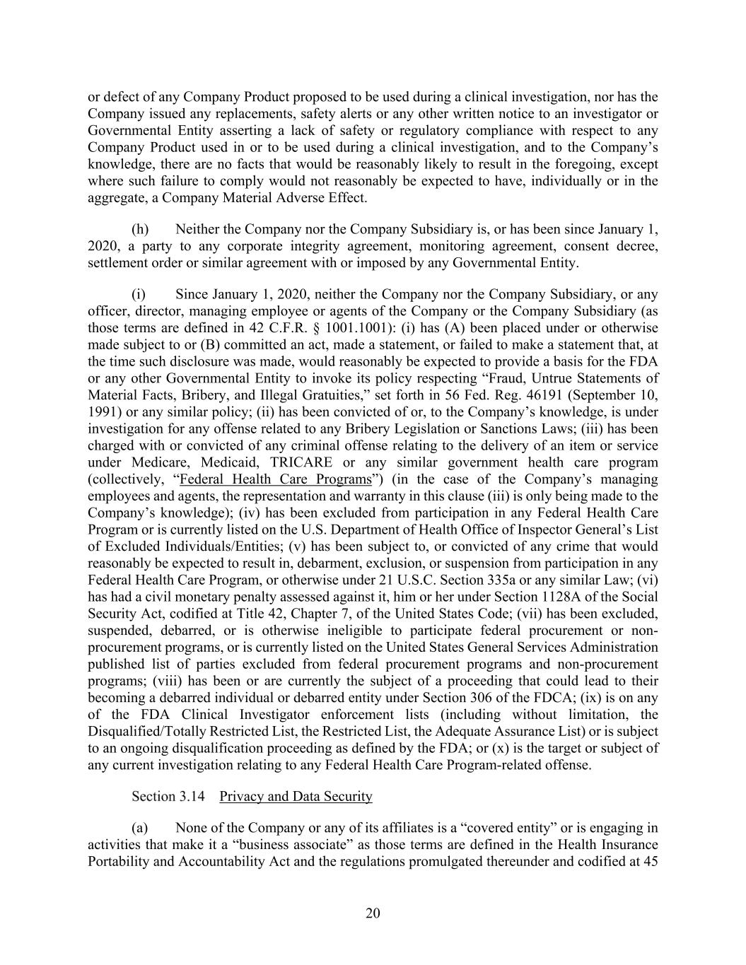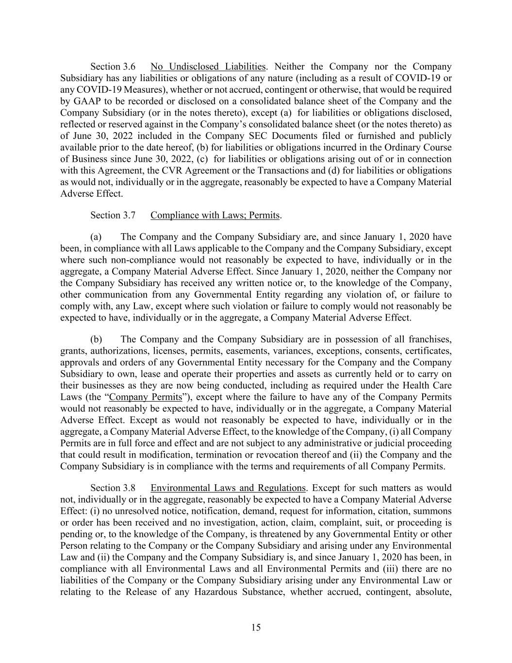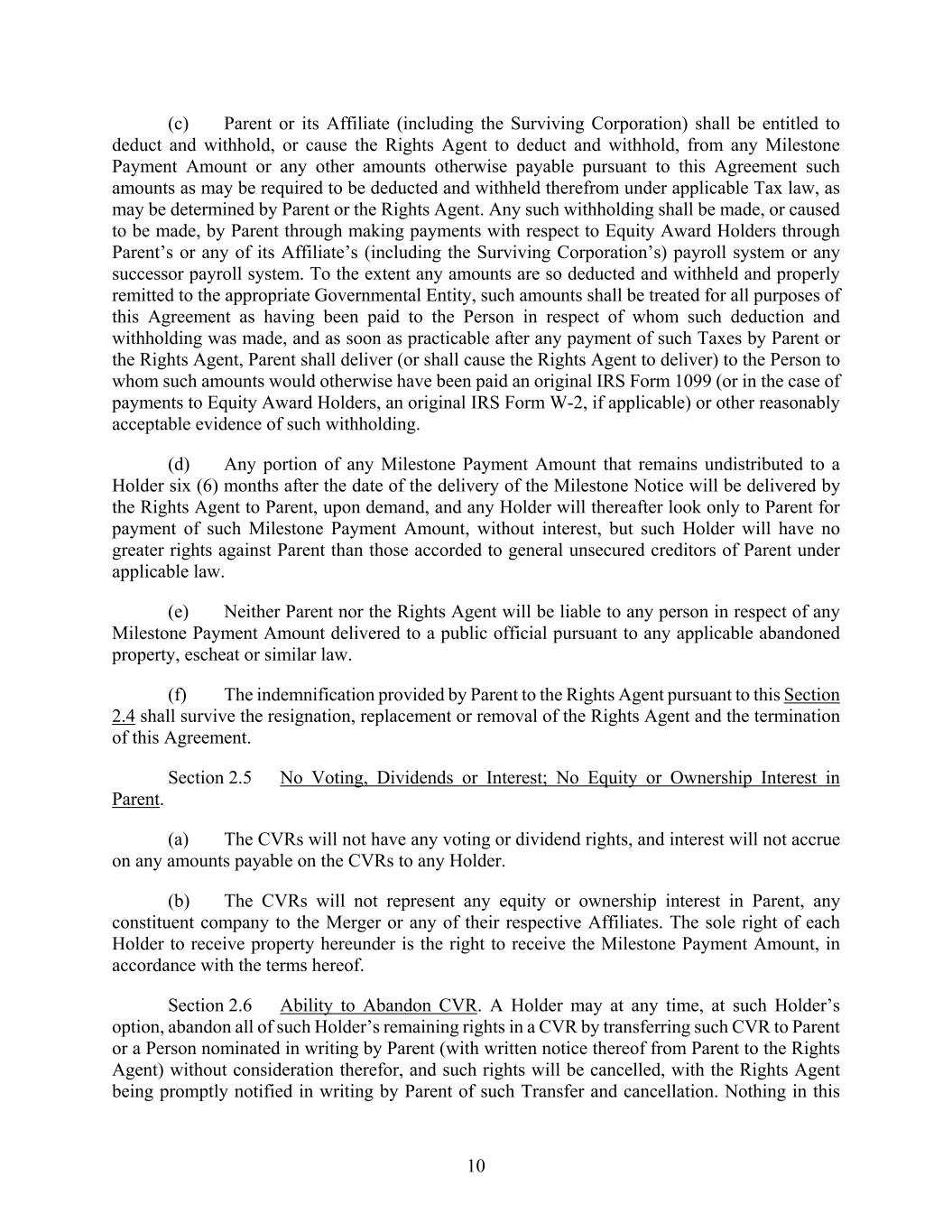•each award of restricted stock units that corresponds to Company Common Stock granted under any Company Equity Plan or otherwise that vests solely on the passage of time (each, a “Company RSU Award”) that is outstanding immediately prior to the Effective Time shall be automatically cancelled and terminated and converted into the right of the holder thereof to receive (without interest, and less any applicable withholding taxes): (i) an amount in cash equal to the product of (A) the Upfront Consideration multiplied by (B) the number of shares of Company Common Stock subject to such Company RSU Award immediately prior to the Effective Time; and (ii) a CVR with respect to each share of Company Common Stock subject to such Company RSU Award immediately prior to the Effective Time.